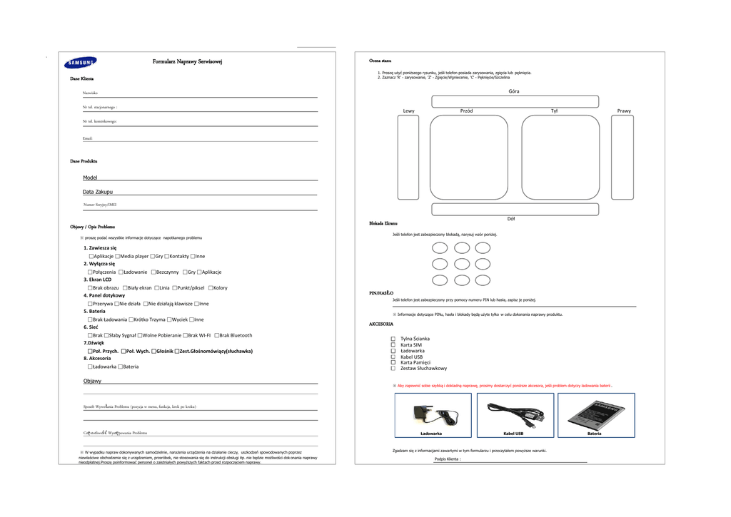 ` Formularz Naprawy Serwisowej Dane Klienta Ocena stanu 1. Proszę użyć poniższego rysunku, jeśli telefon posiada zarysowania, zgięcia lub pęknięcia. 2. Zaznacz 'R' - zarysowanie, 'Z' - Zgięcie/Wgniecenie, 'C' - Pęknięcie/Szczelina Góra Nazwisko Nr tel. stacjonarnego : Lewy Przód Tył Prawy Nr tel. komórkowego: Email: Dane Produktu Model Data Zakupu Numer Seryjny/IMEI Objawy / Opis Problemu ※ proszę podać wszystkie informacje dotyczące napotkanego problemu Dół Blokada Ekranu Jeśli telefon jest zabezpieczony blokadą, narysuj wzór poniżej. 1. Zawiesza się □Aplikacje □Media player □Gry □Kontakty □Inne 2. Wyłącza się □Połączenia □Ładowanie □Bezczynny □Gry □Aplikacje 3. Ekran LCD □Brak obrazu □Biały ekran □Linia □Punkt/piksel □Kolory 4. Panel dotykowy □Przerywa □Nie działa □Nie działają klawisze □Inne 5. Bateria □Brak Ładowania □Krótko Trzyma □Wyciek □Inne 6. Sieć □Brak □Słaby Sygnał □Wolne Pobieranie □Brak WI-FI □Brak Bluetooth 7.Dźwięk □Poł. Przych. □Poł. Wych. □Głośnik □Zest.Głośnomówiący(słuchawka) 8. Akcesoria □Ładowarka □Bateria Objawy PIN/HASŁO Jeśli telefon jest zabezpieczony przy pomocy numeru PIN lub hasła, zapisz je poniżej. ※ Informacje dotyczące PINu, hasła i blokady będą użyte tylko w celu dokonania naprawy produktu. AKCESORIA ` ` ` ` ` ` Tylna Ścianka Karta SIM Ładowarka Kabel USB Karta Pamięci Zestaw Słuchawkowy ※ Aby zapewnić sobie szybką i dokładną naprawę, prosimy dostarczyć poniższe akcesora, jeśli problem dotyczy ładowania baterii . Sposób Wywołania Problemu (pozycja w menu, funkcja, krok po kroku) Częstotliwość Występowania Problemu ※ W wypadku napraw dokonywanych samodzielnie, narażenia urządzenia na działanie cieczy, uszkodzeń spowodowanych poprzez niewłaściwe obchodzenie się z urządzeniem, przeróbek, nie stosowania się do instrukcji obsługi itp. nie będzie możliwości dok onania naprawy nieodpłatnej.Proszę poinformować personel o zaistniałych powyższych faktach przed rozpoczęciem naprawy. Ładowarka Kabel USB Zgadzam się z informacjami zawartymi w tym formularzu i przeczytałem powyższe warunki. Podpis Klienta : Bateria