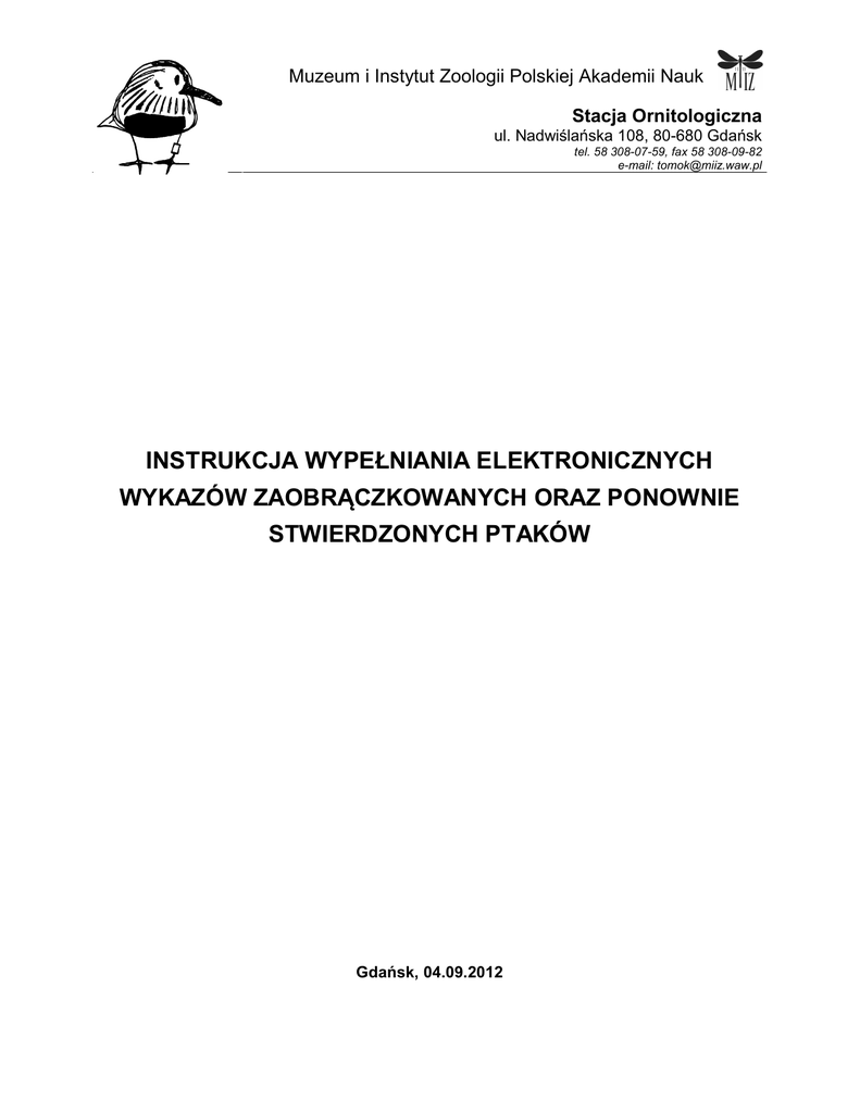 Muzeum i Instytut Zoologii Polskiej Akademii Nauk Stacja Ornitologiczna ul. Nadwiślańska 108, 80-680 Gdańsk tel. 58 308-07-59, fax 58 308-09-82 e-mail: [email protected] INSTRUKCJA WYPEŁNIANIA ELEKTRONICZNYCH WYKAZÓW ZAOBRĄCZKOWANYCH ORAZ PONOWNIE STWIERDZONYCH PTAKÓW Gdańsk, 04.09.2012 SPIS TREŚCI WYPEŁNIANIE ELEKTRONICZNYCH WYKAZÓW ZAOBRĄCZKOWANYCH ORAZ PONOWNIE STWIERDZONYCH PTAKÓW ........................................................ 3 ELEKTRONICZNY FORMULARZ.......................................................................................... 3 BAZA DANYCH ZGODNA Z EXCEL (PLIK *.XLS LUB *.XLSX) ..................................... 3 STRUKTURA BAZY DANYCH DLA ELEKTRONICZNYCH WYKAZÓW ZAOBRĄCZKOWANYCH ORAZ PONOWNIE STWIERDZONYCH PTAKÓW ............... 3 INFORMACJE OGÓLNE .......................................................................................................... 4 OPIS POSZCZEGÓLNYCH KOLUMN ................................................................................... 4 OB– stan znacznika (OB1, OB2, OB3, OB4) ......................................................................... 4 TYP – rodzaj znacznika (TYP1, TYP2, TYP3, TYP4) ............................................................ 4 CTR – centrala (CTR1, CTR2, CTR3, CTR4) ........................................................................ 5 KRZ– kolor obrączki/znacznika (KRZ1, KRZ2, KRZ3, KRZ4) .............................................. 6 NROB – numer znacznika (NROB1, NROB2, NROB3, NROB4) ........................................... 7 GATUNEK ............................................................................................................................. 7 SX - płeć ................................................................................................................................. 9 WIEK ...................................................................................................................................... 9 SZATA .................................................................................................................................. 10 POM- pomiary ptaka (POM1,POM2,POM3,POM4,POM5). .............................................. 10 DATA - data stwierdzenia ptaka .......................................................................................... 10 DD – dokładność daty .......................................................................................................... 11 GODZ, MIN godzina i minuta ............................................................................................ 11 SKROT – skrót miejsca obrączkowania z tożsamy ze skrótem w „mojej lokalizacji” ........ 11 MIEJSCE ............................................................................................................................. 11 PA- państwo. ........................................................................................................................ 14 PROW – województwo, prowincja ....................................................................................... 14 SZ – szerokość geograficzna ................................................................................................ 14 DL – długość geograficzna................................................................................................... 15 DK– dokładność koordynat .................................................................................................. 15 STATUS ............................................................................................................................... 15 KOND- kondycja ptaka ........................................................................................................ 16 OKOL- okoliczności stwierdzenia ........................................................................................ 16 DANE O RODZEŃSTWIE ...................................................................................................... 19 LP– liczba żywych piskląt..................................................................................................... 19 WIEKP- wiek piskląt ............................................................................................................ 20 DOKLP- dokładność wieku piskląt ...................................................................................... 20 RNROB– pisklęta z tego samego lęgu ................................................................................. 20 DANE O RODZICACH LUB PARTNERZE .......................................................................... 21 R1TYP- typ znacznika .......................................................................................................... 21 R1CTR- kod centrali ............................................................................................................ 21 R1KRZ- kolor znacznika ...................................................................................................... 23 R1NROB- numer znacznika ................................................................................................. 24 R2TYP, R2CTRL, R2KRZ, R2NROB ................................................................................. 24 INNE DANE............................................................................................................................. 24 CHWYT- metody chwytania................................................................................................. 24 WABIK- metody wabienia ................................................................................................... 25 MANIP- czynności wykonane na ptaku ............................................................................... 25 PRZEM- przemieszczenie ptaka przed stwierdzeniem ......................................................... 26 UWAGI............................................................................
