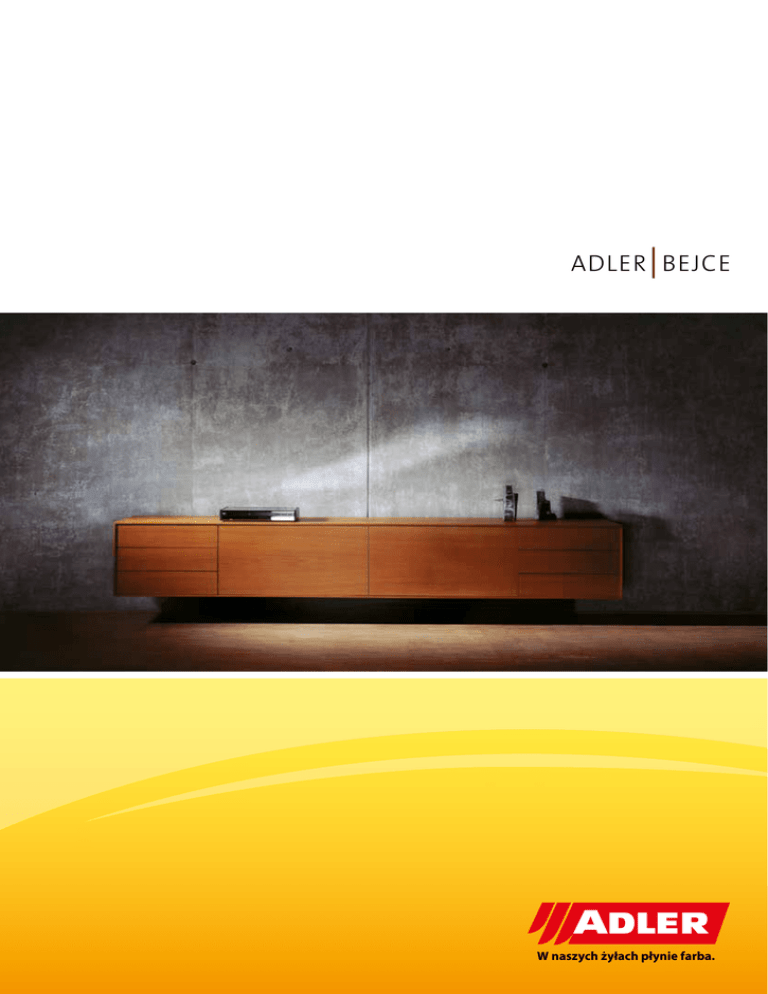 ADLER BEJCE W naszych żyłach płynie farba. W naszych żyłach płynie farba. Spis treści Lepsze bejcowanie z produktami ADLER 05 BEJCE ROZPUSZCZALNIKOWE 31 Systemy bejc 07 ADLER Rustica 33 ADLER Spritzbeize 35 ADLER Neosol 37 BEJCE WODNE 09 ADLER Aqua-Classic 11 ADLER Aqua-Positiv 13 PRODUKTY DODATKOWE 39 ADLER Aqua-Neoantik 15 ADLER Legnofix 40 ADLER Aqua-Colora 17 ADLER Patinabeize 41 ADLER Aqua-Alpin 21 Produkty dodatkowe związane z bejcowaniem 42 ADLER Aqua-Style 23 ADLER Positiv-Plus 25 USŁUGI PREMIUM ZWIĘKSZAJĄCE WARTOŚĆ PAŃSTWA PRACY 43 ADLER Positiv-Plus-Wachsbeize 27 ADLER Aqua-Wischbeize 29 3 W naszych żyłach płynie farba. LEPSZE BEJCOWANIE – Z PRODUKTAMI ADLER: ADLER „Z całym naszym sercem” We wszystko, w co się angażujemy, wkładamy całe nasze serce. Ta filozofia pozwoliła nam stać się wiodącym specjalistą w dziedzinie uszlachetniania powierzchni. Firma ADLER to tradycyjne tyrolskie przedsiębiorstwo rodzinne, zaliczające się ze swoimi 450 pracownikami do przodujących producentów lakierów, farb i środków ochrony drewna w Austrii. Historia jego sukcesu zaczęła się od małego sklepu z farbami, który w 1934 roku w Schwaz otworzył Johann Berghofer. Dzisiaj z zakładu produkcyjnego w Schwaz wyjeżdża rocznie około 15 000 ton lakieru, wysyłanego do ponad 25 krajów na całym świecie. Do klientów firmy ADLER należą oprócz stolarzy, producentów mebli, okien i drzwi, także malarze i osoby wykonujące remonty w domach. Jakość i ochrona środowiska stanowiły od zawsze nasze priorytety. Nowoczesne odcienie barw podkreślają naturalne piękno drewna. Już w 1994 roku firma ADLER udowodniła swoją odpowiedzialność ekologiczną – uruchomiono jeden z najnowocześniejszych w Europie ośrodków ochrony środowiska i recyklingu. Świadczy o tym też certyfikat Responsible-Care, przyznawany firmie ADLER nieprzerwanie od 1994 roku. Ścisłe kontrole zapewniają stałą jakość wszystkich produktów firmy ADLER. Kontrola jakości rozpoczyna się już przy dostawie surowców i kończy na gotowym produkcie opuszczającym zakład ADLER. Liczne europejskie instytuty badawcze kontrolują i potwierdzają na bieżąco wysoką jakość oraz odpowiedzialność ekologiczną firmy ADLER. Drewno jako materiał odnawialny wytwarza w mieszkaniu przyjemną atmosferę, w której człowiek znajduje spokój i odprężenie. Bejce do drewna firmy ADLER nadają meblom indywidualny wygląd. Już od wielu stuleci próbowano podkreślić naturalne piękno drewna przez jego zabarwianie. W ramach tej tradycji firma ADLER oferuje szeroki zestaw bejc, uwzględniających zarówno najróżnorodniejsze wymagania aranżacji wnętrz jak i różnych gatunków drewna. W laboratoriach firmy ADLER specjaliści stale pracują nad interesującymi odcieniami barw bejc, które dodatkowo dają się szybciej i łatwiej przerabiać. Firma ADLER zawsze trzyma rękę na pulsie i oferuje naj- modniejsze rozwiązania spełniające najróżnorodniejsze życzenia odpowiadające aktualnym trendom. Drewno ma mieć wygląd antyczny? Ma być jak z przytulnej wiejskiej izby? Proszę bardzo. Lub raczej nowoczesne, futurystyczne? Nie ma problemu. Od „Neoantik” przez „Classic” do „Style” – firma ADLER nie odmawia nikomu spełniania życzeń. Oprócz upiększania wyglądu drewna, bejce firmy ADLER wyrównują małe nierówności powierzchni oraz barwę drewna i pomagają mu zadziwiać szlachetnym wyglądem. Bejce firmy ADLER dają decydujący wkład do podwyższenia oceny wyglądu Państwa mebli. OCCUPATIONAL HEALTH & SAFETY ADVISORY SERVICES 5 SYSTEMY BEJCOWANIA DLA RÓŻNYCH GATUNKÓW DREWNA RODZAJ DREWNA W naszych żyłach płynie farba. AQUA CLASSIC AQUA POSITIV AQUA NEOANTIK AQUA COLORA AQUA ALPIN AQUA STYLE POSITIV PLUS POSITIV-PLUSWACHSBEIZE AQUAWISCHBEIZE RUSTICA SPRITZBEIZE NEOSOL Abachi ++ – ++ ++ – – O – – ++ ++ ++ Anatolia ++ – ++ ++ – – – – – ++ ++ + Anegre ++ – ++ ++ – O – – ++ + ++ ++ Brzoza ++ – + ++ – ++ – – O – O ++ Buk ++ – + ++ – ++ – – + O O ++ Czereśnia ++ – O ++ – + – – ++ O O ++ Daglezja – ++ + O ++ O ++ + – – – – Dąb ++ – ++ ++ – + O – + ++ ++ + Grusza ++ – O ++ – + – – + – – + Iroko ++ – ++ ++ – – – – + ++ ++ + Jesion ++ – ++ ++ – + – – + ++ ++ + Jodła – ++ + + ++ O ++ ++ – – – O Klon ++ – + ++ – ++ – – + – – ++ Koto ++ – ++ ++ – O – – O ++ ++ + Limba – ++ O O ++ O ++ ++ – – – O Mahoń ++ – + ++ – O – – + ++ ++ + Modrzew – ++ O O ++ O ++ ++ – – – O Olcha ++ – + ++ – ++ – – O – O ++ Orzech ++ – ++ ++ – O – – + + ++ ++ Palisander + – O + – – – – + ++ ++ ++ Ramin ++ – ++ ++ – O – – O ++ ++ + Senesza ++ – ++ ++ – + – – O ++ ++ + Śliwa ++ – O ++ – + – – O O O + Sosna – ++ O O ++ O ++ ++ – – – O Odżywiczyć drewno bogate w żywicę! Sosna oregońska – ++ O – ++ – ++ ++ – – – – Odżywiczyć drewno bogate w żywicę! Świerk – ++ + + ++ O ++ ++ – – – O Tanganika ++ – O ++ – O – – – ++ ++ + Teak + – O + – – – – – ++ ++ + Wenge + – O + – – – – + ++ ++ + Wiąz ++ – ++ ++ – O – – O ++ ++ + ++ Nadaje się doskonale + Nadaje się O Nadaje się warunkowo UWAGI Odżywiczyć drewno bogate w żywicę! – Nie nadaje się 7 BEJCE WODNE 9 Dąb W naszych żyłach płynie farba. 1333 40013 Bernstein 1333 40017 Nussbaum Hell 1333 40018 Nussbaum Dunkel1333 40022 Antik 1333 40020 1333 40011 Vanille 1333 40012 Curry 1333 40013 Safran 1333 40014 Lichtbraun 1333 40015 1333 40016 Bernstein 133 340017 Nussbaum Hell 1333 40018 Cherry 1333 40019 Antik 1333 40020 1333 40021 Nussbaum Dunkel1333 40022 Kakao 1333 40023 Wenge 1333 40024 Espresso 1333 40025 Bambus 1333 40011 Vanille 1333 40012 Curry 1333 40013 Curry 1333 40013 Nussbaum Dunkel1333 40022 Thymian 1333 40016 Curry 1333 40013 Nussbaum Hell 1333 40018 Nussb