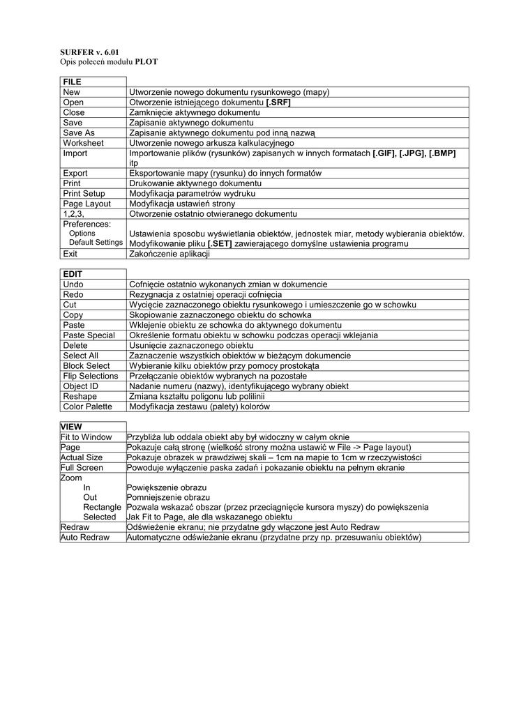 SURFER v. 6.01 Opis poleceń modułu PLOT FILE New Open Close Save Save As Worksheet Import Export Print Print Setup Page Layout 1,2,3, Preferences: Utworzenie nowego dokumentu rysunkowego (mapy) Otworzenie istniejącego dokumentu [.SRF] Zamknięcie aktywnego dokumentu Zapisanie aktywnego dokumentu Zapisanie aktywnego dokumentu pod inną nazwą Utworzenie nowego arkusza kalkulacyjnego Importowanie plików (rysunków) zapisanych w innych formatach [.GIF], [.JPG], [.BMP] itp Eksportowanie mapy (rysunku) do innych formatów Drukowanie aktywnego dokumentu Modyfikacja parametrów wydruku Modyfikacja ustawień strony Otworzenie ostatnio otwieranego dokumentu Options Ustawienia sposobu wyświetlania obiektów, jednostek miar, metody wybierania obiektów. Default Settings Modyfikowanie pliku [.SET] zawierającego domyślne ustawienia programu Exit Zakończenie aplikacji EDIT Undo Redo Cut Copy Paste Paste Special Delete Select All Block Select Flip Selections Object ID Reshape Color Palette Cofnięcie ostatnio wykonanych zmian w dokumencie Rezygnacja z ostatniej operacji cofnięcia Wycięcie zaznaczonego obiektu rysunkowego i umieszczenie go w schowku Skopiowanie zaznaczonego obiektu do schowka Wklejenie obiektu ze schowka do aktywnego dokumentu Określenie formatu obiektu w schowku podczas operacji wklejania Usunięcie zaznaczonego obiektu Zaznaczenie wszystkich obiektów w bieżącym dokumencie Wybieranie kilku obiektów przy pomocy prostokąta Przełączanie obiektów wybranych na pozostałe Nadanie numeru (nazwy), identyfikującego wybrany obiekt Zmiana kształtu poligonu lub polilinii Modyfikacja zestawu (palety) kolorów VIEW Fit to Window Page Actual Size Full Screen Zoom In Out Rectangle Selected Redraw Auto Redraw Przybliża lub oddala obiekt aby był widoczny w całym oknie Pokazuje całą stronę (wielkość strony można ustawić w File -> Page layout) Pokazuje obrazek w prawdziwej skali – 1cm na mapie to 1cm w rzeczywistości Powoduje wyłączenie paska zadań i pokazanie obiektu na pełnym ekranie Powiększenie obrazu Pomniejszenie obrazu Pozwala wskazać obszar (przez przeciągnięcie kursora myszy) do powiększenia Jak Fit to Page, ale dla wskazanego obiektu Odświeżenie ekranu; nie przydatne gdy włączone jest Auto Redraw Automatyczne odświeżanie ekranu (przydatne przy np. przesuwaniu obiektów) DRAW Text Polygon Polyline Symbol Rectangle Rounded Rect Ellipse Line Attributes Fill Attributes Text Attributes Symbol Attributes ARRANGE Move to Front Move to Back Combine Break Apart Rotate Free Rotate Align Objects GRID Data Function Math Calculus Matrix Smooth Spline Smooth Blank Utility Convert Extract Transform Volume Slice Residuals Grid Node Editor Tworzenie obiektu tekstowego Rysowanie poligonu Rysowanie polilinii (linii łamanej) Wstawianie symbolu (punktu) Rysowanie prostokąta (przy wciśniętym klawiszu CTRL rysowany jest kwadrat) Rysowanie prostokąta z zaokrąglonymi narożnikami Rysowanie elipsy (przy wciśniętym klawiszu CTRL rysowany jest okrąg) Zmiana domyślnych atrybutów linii wybranych obiektów Zmiana domyślnych atrybutów wypełnienia wybranych obiektów Zmiana domyślnych atrybutów zaznaczonego tekstu Zmiana domyślnych atrybutów symbolu (punktu) Przesunięcie wybranego obiektu na wierzch Przesunięcie wybranego obiektu pod spód Połączenie wybranych obiektów, utworzenie jednego obiektu Rozbicie obiektu powstałego przez połączenie obiektów poleceniem combine Obrót wybranego obiektu o podany kąt Swobodne obracanie obiektu przy użyciu myszy Wyrównanie wybranych obiektów na stronie Utworzenie gridu (siatki) [.GRD] z pliku zawierającego dane X, Y, Z Utworzenie gridu [.GRD] dla funkcji matematycznej z = f(X, Y) Wykonywanie działań algebraicznych na plikach [.GRD] Różne obliczenia (analizy) pliku [.GRD], np. obliczenie spadków terenu Wygładzanie pliku [.GRD] przy użyciu algorytmów macierzowych Wygładzanie pliku [.GRD] przy użyciu algorytmu „splain” (zmiana gęstości gridu) „Wyczyszczenie” części pliku [.GRD ] przy pomocy obiektu poligonowego Zamiana formatu pliku [.GRD], z binarnego na ASCII (lub odwrotnie), tworzenie plików X, Y, Z [.DAT] z pliku [.GRD] Utworzenie pliku [.GRD] przez wycięcie danych z większego pliku. Zmiana współrzędnych (X i Y) punktów w pliku [.GRD] Obliczenia objętości zawartych pomiędzy dwoma powierzchniami [.GRD] lub pomiędzy jedną powierzchnią i płaszczyzną o Z = const Utworzenie pliku zawierającego dane do wykreślenia przekroju. Wykreślenie przekroju jest możliwe w programie GRAPHER. Obliczenie różnicy pomiędzy podanym gridem a danymi X, Y, Z Umożliwia modyfikację wartości Z dla pojedyńczych węzłów gridu MAP Load BaseMap Wczytanie mapy bazowej (wektorowej) [.BLN], [.DXF] zawierającej obiekty liniowe i/lub poligonowe, względnie obrazu rastrowego [.GIF], [.JPG], [.BMP] i podobnych. Utworzenie mapy izoliniowej z pliku [.GRD] Wyświetlenie mapy punktów z pliku [.DAT] Utworzenie mapy punktów z pliku [.DAT], klasyfikacja punktów Tworzenie mapy rastrowej z pliku [.GRD] Tworzenie mapy „cieniowanej” z pliku [.GRD] Utworzenie 3-wymiarowego wykresu powierzchni Contour Post Classed Post Image Shaded Relief Surface Axis Show Edit Scale Grid Lines Scale Bar Background Digitize 3D View Scale Limits Stack Maps Overlay Maps Edit Overlays Wyświetlanie/ukrywanie osi układu współrzędnych. Edycja atrybutów wybranej osi układu współrzędnych. Zmiana skali wybranej osi . Wyświetlanie linii siatki na mapie Wyświetlenie podziałki mapy Sterowanie atrybutami tła mapy Digitalizacja (odczytywanie współrzędnych z mapy) i zapisanie danych do pliku Sterowanie widokiem 3-wymiarowym Definiowanie skali dla wybranej mapy Definiowanie granic mapy Wyrównanie (ustawienie) kilku map na stronie Nałożenie kilku wybranych map i utworzenie jednego obiektu Edycja poszczególnych elementów obiektu składającego się z kilku nałożonych map WINDOW New View Tile Cascade Arrange Icons 1,