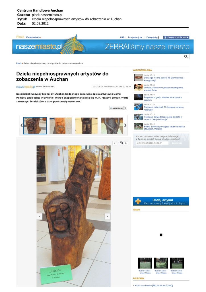 Centrum Handlowe Auchan Gazeta: plock.naszemiasto.pl Tytu³: Dzie³a niepe³nosprawnych artystów do zobaczenia w Auchan Data: 02.08.2012 Płock Zmień miasto » WYDARZENIA ROZRYWKA RSS | Zarejestruj się | Zaloguj się KATALOG FIRM OGŁOSZENIA TURYSTYKA SPORT | Zaloguj przez facebook MIESZKANIA WARSZAWA Płock » Dzieła niepełnosprawnych artystów do zobaczenia w Auchan WYDARZENIA DNIA Dzieła niepełnosprawnych artystów do zobaczenia w Auchan Daniel Świerżewski dzisiaj 13:20 Dlaczego nie ma pasów na Sienkiewicza i Kolegialnej? dzisiaj 11:54 2012-08-01, Aktualizacja: 2012-08-02 13:29 Zdobądź nawet 40 tysięcy na rozkręcenie własnej firmy Do niedzieli wszyscy klienci CH Auchan będą mogli podziwiać dzieła artystów z Domu dzisiaj 11:53 Prognoza pogody: Możliwe silne burze z gradem Pomocy Społecznej w Brwilnie. Wśród eksponatów znajdują się m.in. rzeźby i obrazy. Warto zaznaczyć, że niektóre z dzieł powstawały nawet rok. dzisiaj 10:28 skomentuj Policjanci zatrzymali 17-letniego sprawcę rozbojów 0 dzisiaj 10:15 Policjanci odwiedzają płockie osiedla w ramach "Akcji-Animacja" dzisiaj 09:49 Budka Suflera śpiewająco także na boisku [ZDJĘCIA, WIDEO] Chcesz dostawać najważniejsze informacje z Twojego miasta? Zapisz się do newslettera! 1/9 [email protected] Zapisz się Dodaj artykuł WIDEO Budka Suflera Urząd Miasta Budka Suflera Urząd Miasta Budka Suflera Urząd Miasta POLECAMY KSW 18 w Płocku [RELACJA NA ŻYWO] Centrum Handlowe Auchan Gazeta: plock.naszemiasto.pl Tytu³: Dzie³a niepe³nosprawnych artystów do zobaczenia w Auchan Data: 02.08.2012 Zachęcamy do śledzenia relacji na żywo z gali KSW 18 w Płocku! Rozpoczynamy w sobotę o godz. 19.30! fot. RedComm - Celem wystawy jest ukazanie mieszkańcom Płocka osób niepełnosprawnych, jako pełnowartościowych obywateli ze swoimi zainteresowaniami i możliwościami artystycznymi. Cieszę się bardzo z kolejnej okazji do pokazania efektów pracy naszych artystów. Staramy się ich wspierać Serwis Specjalny: Korupcja w Orlenie - wszystko o zatrzymaniach w PKN Orlen Premiery kinowe. Polecamy, na co iść do kina Orlen Arena w Płocku - wszystko o naszej hali organizując tego typu wystawy w kraju i zagranicą" - powiedziała Beata Karpińska, dyrektor Domu Pomocy Społecznej w Brwilnie. OGŁOSZENIA NIERUCHOMOŚCI Czytaj także: Otwarcie wystawy fotografii w Domu Darmstadt Mieszkanie 3-pokojowe, 74 m2, 1 piętro 270 000 zł Sprzedam mieszkanie na ulicy Gradowskiego 15. Na pierwszym piętrze o powierz Codziennie najświeższe informacje z Płocka na Twoją skrzynkę. Zapisz się do newslettera! Mieszkanie 3-pokojowe, 74 m2, parter 310 000 zł Mieszkanie/74m2/ + boks garażowy /16,50 m2/. Oferta bezpośrednia - tel. 601- Zobacz więcej na dom.gratka.pl » OGŁOSZENIA MOTORYZACYJNE < Poprzedni artykuł Ciekawy | 1 Następny artykuł > Użyteczny | 0 Inspirujący | 0 Pobieżny | 0 Opel Vectra 20900.00 zł Samochód zadbany, rok produkcji grudzień 2004, pierwsza rejestracja 2005. W numerze VIN rocznik 2005. Cena do negoc Słaby temat | 0 Kia Sportage 37500.00 zł Witam, Mam do sprzedania samochód marki KIA Sportage z 2006r. data pierwszej rejestracji 07.2007r. auto jest garażo Tagi: auchan płock wystawa, dom pomocy społecznej brwilno, obrazy auchan płock wystawa, wystawa auchan, wystawa niepełnosprawnych Zobacz więcej na moto.gratka.pl » OGŁOSZENIA PRACODAWCÓW Nauczyciel przedszkola Warszawa KOMENTARZE 5 6 Dodając komentarz akceptujesz regulamin. Dodaj komentarz Nowo otwarty żłobek na Ursynowie zatrudni opiekunkę do dzieci w wieku od 1 do 3 lat. Poszukujemy doświadczonej osoby po pedagogice przedszkolnej lub po ... Konsultant / agent sprzedaży bezpośredniej Warszawa, Wrocław, Poznań Dołącz do Oriflame: - kupuj kosmetyki TANIEJ - zarabiaj pieniądze pokazując katalog innym - zdobywaj nagrody baw się doskonale! Zapraszam na moją stro... Pracownik Sprzatajacy Warszawa Clar System - zatrudni osoby do sprzatania biur i magazynów Poczty Polskiej na terenie WarszawySłużew Węzeł Rozdzielniczy ul. Łączyny 8 Wymagane: do... Brak komentarzy. Możesz być pierwszy! Zobacz więcej na praca.gratka.pl » ZOBACZ KONIECZNIE Koncerty Rozkłady jazdy Płocka kronika policyjna LOTTO Futbol na wesoło Gry komputerowe Najnowsze wieści w serwisie alekoncerty.pl Zaplanuj swoją podróż z Naszym Miastem!... Co się dzieje w naszym mieście? Sprawdź... Zobacz wyniki losowań! Piłkarskie plotki, sportowe plotki, WAGs,... Gry wideo i komputerowe, recenzje Serwisy branżowe: Serwisy partnerskie: Dzienniki regionalne: Serwisy tematyczne: > Ogłoszenia > Grupa wydawnicza > Wiadomości Trójmiasto > Echo Miasta > Mieszkania Płock > Wiadomości > Wiadomości Łódź > Deweloperzy > Domy Płock > Motoryzacja > Najnowsze Informacje > Aktualności > Wiadomości Śląsk > Wiadomości Kraków > Nekrologi > Samochody Płock > Praca > Praca Płock > Samochody > Program TV > Piłka nożna > Wiadomości Wrocław > Wiadomości Poznań > Wiadomości Lublin > Ogłoszenia drobne > Turystyka > Dziennik Polski > Express Ilustrowany Na górę strony Centrum Handlowe Auchan Gazeta: plock.naszemiasto.pl Tytu³: Dzie³a niepe³nosprawnych artystów do zobaczenia w Auchan Data: 02.08.2012 O NaszymMieście Marketing Reklama Kontakt Praca Prywatność Regulamin Mapa serwisu (c) 2000-2012 Polskapresse Sp. z o.o. Polskapresse sp. z.o.o informuje, że wszystkie treści ukazujące się w serwisie naszemiasto.pl podlegają ochronie. Dowiedz się więcej. Jesteś zainteresowany kupnem treści? Dowiedz się więcej.
