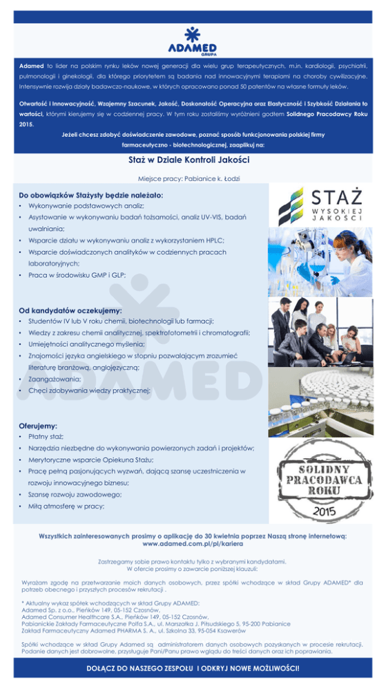 Adamed to lider na polskim rynku leków nowej generacji dla wielu grup terapeutycznych, m.in. kardiologii, psychiatrii, pulmonologii i ginekologii, dla którego priorytetem są badania nad innowacyjnymi terapiami na choroby cywilizacyjne. Intensywnie rozwija działy badawczo-naukowe, w których opracowano ponad 50 patentów na własne formuły leków. Otwartość i Innowacyjność, Wzajemny Szacunek, Jakość, Doskonałość Operacyjna oraz Elastyczność i Szybkość Działania to wartości, którymi kierujemy się w codziennej pracy. W tym roku zostaliśmy wyróżnieni godłem Solidnego Pracodawcy Roku 2015. Jeżeli chcesz zdobyć doświadczenie zawodowe, poznać sposób funkcjonowania polskiej firmy farmaceutyczno - biotechnologicznej, zaaplikuj na: Staż w Dziale Kontroli Jakości Miejsce pracy: Pabianice k. Łodzi Do obowiązków Stażysty będzie należało: • Wykonywanie podstawowych analiz; • Asystowanie w wykonywaniu badań tożsamości, analiz UV-VIS, badań uwalniania; • Wsparcie działu w wykonywaniu analiz z wykorzystaniem HPLC; • Wsparcie doświadczonych analityków w codziennych pracach laboratoryjnych; • Praca w środowisku GMP i GLP; Od kandydatów oczekujemy: • Studentów IV lub V roku chemii, biotechnologii lub farmacji; • Wiedzy z zakresu chemii analitycznej, spektrofotometrii i chromatografii; • Umiejętności analitycznego myślenia; • Znajomości języka angielskiego w stopniu pozwalającym zrozumieć literaturę branżową, anglojęzyczną; • Zaangażowania; • Chęci zdobywania wiedzy praktycznej; Oferujemy: • Płatny staż; • Narzędzia niezbędne do wykonywania powierzonych zadań i projektów; • Merytoryczne wsparcie Opiekuna Stażu; • Pracę pełną pasjonujących wyzwań, dającą szansę uczestniczenia w rozwoju innowacyjnego biznesu; • Szansę rozwoju zawodowego; • Miłą atmosferę w pracy; Wszystkich zainteresowanych prosimy o aplikację do 30 kwietnia poprzez Naszą stronę internetową: www.adamed.com.pl/pl/kariera Zastrzegamy sobie prawo kontaktu tylko z wybranymi kandydatami. W ofercie prosimy o zawarcie poniższej klauzuli: Wyrażam zgodę na przetwarzanie moich danych osobowych, przez spółki wchodzące w skład Grupy ADAMED* dla potrzeb obecnego i przyszłych procesów rekrutacji . * Aktualny wykaz spółek wchodzących w skład Grupy ADAMED: Adamed Sp. z o.o., Pieńków 149, 05-152 Czosnów, Adamed Consumer Healthcare S.A., Pieńków 149, 05-152 Czosnów, Pabianickie Zakłady Farmaceutyczne Polfa S.A., ul. Marszałka J. Piłsudskiego 5, 95-200 Pabianice Zakład Farmaceutyczny Adamed PHARMA S. A., ul. Szkolna 33, 95-054 Ksawerów DO NASZEGO ZESPOŁU I pozyskanych ODKRYJ NOWE MOŻLIWOŚCI! Spółki wchodzące w skład Grupy Adamed sąDOŁĄCZ administratorem danych osobowych w procesie rekrutacji. Podanie danych jest dobrowolne, przysługuje Pani/Panu prawo wglądu do treści danych oraz ich poprawiania. DOŁĄCZ DO NASZEGO ZESPOŁU I ODKRYJ NOWE MOŻLIWOŚCI!