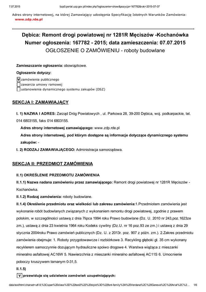 7.07.2015 bzp0.portal.uzp.gov.pl/index.php?ogloszenie=show&pozycja=167782&rok=20150707 Adres strony internetowej, na której Zamawiający udostępnia Specyfikację Istotnych Warunków Zamówienia: www.zdp.rde.pl Dębica: Remont drogi powiatowej nr 1281R Męciszów Kochanówka Numer ogłoszenia: 167782 2015; data zamieszczenia: 07.07.2015 OGŁOSZENIE O ZAMÓWIENIU roboty budowlane Zamieszczanie ogłoszenia: obowiązkowe. Ogłoszenie dotyczy: V zamówienia publicznego zawarcia umowy ramowej ustanowienia dynamicznego systemu zakupów (DSZ) SEKCJA I: ZAMAWIAJĄCY I. 1) NAZWA I ADRES: Zarząd Dróg Powiatowych , ul. Parkowa 28, 39200 Dębica, woj. podkarpackie, tel. 014 6803155, faks 014 6803155. Adres strony internetowej zamawiającego: www.zdp.rde.pl Adres strony internetowej, pod którym dostępne są informacje dotyczące dynamicznego systemu zakupów: I. 2) RODZAJ ZAMAWIAJĄCEGO: Administracja samorządowa. SEKCJA II: PRZEDMIOT ZAMÓWIENIA II.1) OKREŚLENIE PRZEDMIOTU ZAMÓWIENIA II.1.1) Nazwa nadana zamówieniu przez zamawiającego: Remont drogi powiatowej nr 1281R Męciszów Kochanówka. II.1.2) Rodzaj zamówienia: roboty budowlane. II.1.4) Określenie przedmiotu oraz wielkości lub zakresu zamówienia:1.Przedmiotem zamówienia jest wykonanie robót budowlanych związanych z wykonaniem remontu drogi powiatowej, zgodnie z prawem polskim, w szczególności ustawą z dnia 7lipca 1994 roku Prawo budowlane (Dz. U. 2010 nr 243,poz.1623ze zm.), ustawą z dnia 23 kwietnia 1964 roku Kodeks cywilny (Dz.U. nr 16 poz.93 ze zm.) i ustawą z dnia 29 stycznia 2004roku Prawo zamówień publicznych (Dz. U. z 2013r. poz. 907 z późn. zm.). 2.Zakres przedmiotu zamówienia obejmuje: 1. Roboty przygotowawcze i rozbiórkowe 3. Recykling głęboki gł. 35 cm wykonany recyklerem samoczynnie dozującym hydrauliczne spoiwo drogowe 4. Warstwa wiążąca z mieszanki mineralno asfaltowej AC16W 5. Nawierzchnia z mieszanki mineralno asfaltowej AC11S 6. Umocnienie poboczy kruszywem łamanym 031,5. II.1.5) V przewiduje się udzielenie zamówień uzupełniających: data:text/html;charset=utf8,%3Cspan%20class%3D%22text2%22%20style%3D%22fontfamily%3A%20Verdana%2C%20Geneva%2C%20Arial%2C%2… 1/6 7.07.2015 bzp0.portal.uzp.gov.pl/index.php?ogloszenie=show&pozycja=167782&rok=20150707 Określenie przedmiotu oraz wielkości lub zakresu zamówień uzupełniających Zamawiający przewiduje zamówienia uzupełniające, o których mowa w art. 67 ust.1 pkt 6 u.P.z.p., stanowiących nie więcej niż 50% wartości zamówienia podstawowego polegających na wykonaniu: 1. Roboty przygotowawcze i rozbiórkowe 3. Recykling głęboki gł. 35 cm wykonany recyklerem samoczynnie dozującym hydrauliczne spoiwo drogowe 4. Warstwa wiążąca z mieszanki mineralno asfaltowej AC16W 5. Nawierzchnia z mieszanki mineralno asfaltowej AC11S 6. Umocnienie poboczy kruszywem łamanym 0 31,5 II.1.6) Wspólny Słownik Zamówień (CPV): 45.23.31.402. II.1.7) Czy dopuszcza się złożenie oferty częściowej: nie. II.1.8) Czy dopuszcza się złożenie oferty wariantowej: nie. II.2) CZAS TRWANIA ZAMÓWIENIA LUB TERMIN WYKONANIA: Zakończenie: 30.09.2015. SEKCJA III: INFORMACJE O CHARAKTERZE PRAWNYM, EKONOMICZNYM, FINANSOWYM I TECHNICZNYM III.1) WADIUM Informacja na temat wadium: 4000,00zł III.2) ZALICZKI III.3) WARUNKI UDZIAŁU W POSTĘPOWANIU ORAZ OPIS SPOSOBU DOKONYWANIA OCENY SPEŁNIANIA TYCH WARUNKÓW III. 3.1) Uprawnienia do wykonywania określonej działalności lub czynności, jeżeli przepisy prawa nakładają obowiązek ich posiadania Opis sposobu dokonywania oceny spełniania tego warunku Zamawiający nie wprowadza szczegółowego opisu spełniania tego warunku. Ocena spełniania niniejszego warunku zostanie dokonana w oparciu o dostarczone oświadczenie o spełnianiu warunków udziału w postępowaniu, wg formuły: spełnia nie spełnia. III.3.2) Wiedza i doświadczenie Opis sposobu dokonywania oceny spełniania tego warunku Wykonawca zdolny do należytego wykonania udzielanego zamówienia to taki, który wykaże się wiedzą i doświadczeniem w wykonaniu (zakończeniu) w okresie ostatnich 5 lat przed upływem terminu składania ofert , a jeżeli okres prowadzenia działalności jest krótszy w tym okresie, co najmniej: Dwóch zadań polegających na wykonaniu robót budowlanych o wartości co najmniej 150 000 zł brutto każde z nich, które polegały na wykonaniu: 1. Roboty przygotowawcze i rozbiórkowe 3. Recykling głęboki gł. 35 cm wykonany recyklerem samoczynnie dozującym hydrauliczne spoiwo drogowe 4. Warstwa wiążąca z mieszanki mineralno asfaltowej AC16W 5. Nawierzchnia z mieszanki mineralno asfaltowej AC11S 6. Umocnienie poboczy kruszywem łamanym 031,5; Ocena spełniania niniejszego warunku zostanie dokonana w oparciu o dostarczone dokumenty w data:text/html;charset=utf8,%3Cspan%20class%3D%22text2%22%20style%3D%22fontfamily%3A%20Verdana%2C%20Geneva%2C%20Arial%2C%2… 2/6 7.07.2015 bzp0.portal.uzp.gov.pl/index.php?ogloszenie=show&pozycja=167782&rok=20150707 postępowaniu, wg formuły: spełnia nie spełnia III.3.3) Potencjał techniczny Opis sposobu dokonywania oceny spełniania tego warunku Zamawiający nie wprowadza szczegółowego opisu spełniania tego warunku. Ocena spełniania niniejszego warunku zostanie dokonana w oparciu o dostarczone oświadczenie o spełnianiu warunków udziału w postępowaniu, wg formuły: spełnia nie spełnia. III.3.4) Osoby zdolne do wykonania zamówienia Opis sposobu dokonywania oceny spełniania tego warunku Zamawiający uzna powyższy warunek za spełniony, jeżeli Wykonawca wykaże się, że dysponuje osobami zdolnymi, które będą uczestniczyć w wykonywaniu zamówienia, legitymując się doświadczeniem odpowiednim do funkcji, jakie zostaną im powierzone. Wykonawca przedstawi wraz z ofertą , na funkcję wymienioną poniżej osobę spełniającą następujące minimalne wymagania: osoba proponowana do pełnienia funkcji kierownika budowy ( 1 osoba) uprawnienia budowlane do kierowania robotami