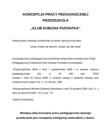 KONCEPCJA PRACY PEDAGOGICZNEJ PRZEDSZKOLA „KLUB KUBUSIA PUCHATKA” Dewizą pracy naszego przedszkola są słowa Janusza Korczaka: „Kiedy śmieje się dziecko, śmieje się cały świat” Koncepcja pracy pedagogicznej przedszkola opracowana została przez Radę Pedagogiczną Przedszkola Klub Kubusia Puchatka na podstawie: -Rozporządzenia MEN z dnia 7 października 2009 r w sprawie nadzoru pedagogicznego (Dz. U ,Nr 168, poz. 1324) Ustawa z dnia 19 marca 2009r. o zmianie ustawy o systemie oświaty oraz zmianie innych ustaw ( Dz. U. Nr. 56 poz, 458) -Rozporządzenia Ministra Edukacji Narodowej z dnia 23 grudnia 2008 r.(Dz, U. z dnia 15 stycznia 2009 r. Nr 4, poz. 17) -Statut Przedszkola Wiodącą ideą koncepcji pracy pedagogicznej naszego przedszkola jest rozwijanie inteligencji wielorakich u dzieci. Koncepcja pracy pedagogicznej przedszkola oparta jest na założeniach Howarda Gardnera (psychologa Harvard University), który na podstawie wieloletnich badań stwierdził, iż mózg każdego człowieka ma specyficzną „mapę” talentów, z którą ten przychodzi na świat. Od środowiska w jakim dziecko dorasta zależy rozwój bądź regres tych naturalnych predyspozycji. H.Gardner ogłosił teorię ośmiu typów inteligencji, których ośrodki zlokalizowane są w różnych częściach mózgu. Wyróżnił następujące inteligencje: językową, matematyczno-logiczną, wizualno-przestrzenną, ruchową, muzyczną, przyrodniczą, interpersonalną, intrapersonalną. Każde dziecko posiada inną, niepowtarzalną „mapę” inteligencji, ma swoje mocne i słabe strony. Wszystkie rodzaje inteligencji są równie cenne i każdy rodzaj inteligencji można i trzeba rozwijać. CELE OGÓLNE: - przedszkole osiąga cele zgodnie z polityką oświatową państwa - przedszkole doskonali efekty swojej pracy - w przedszkolu dba się o prawidłowy przebieg i doskonalenie procesów edukacyjnych - procesy zachodzące w przedszkolu służą realizacji przyjętej przez przedszkole koncepcji pracy - przedszkole współpracuje ze środowiskiem na rzecz własnego rozwoju i rozwoju lokalnego - przedszkole jest integralną częścią środowiska, w którym działa - zarządzanie zapewnia funkcjonowanie przedszkola zgodnie z przyjętą koncepcją pracy CELE SZCZEGÓŁOWE - wspomaganie dzieci w rozwijaniu uzdolnień oraz kształtowanie czynności intelektualnych potrzebnych im w codziennych sytuacjach i w dalszej edukacji - budowanie systemu wartości, w tym wychowywanie dzieci tak, żeby lepiej orientowały się w tym, co jest dobre, a co złe - kształtowanie u dzieci odporności emocjonalnej koniecznej do racjonalnego radzenia sobie w nowych i trudnych sytuacjach, w tym także do łagodnego znoszenia stresów i porażek – rozwijanie umiejętności społecznych dzieci, niezbędnych w poprawnych relacjach z dziećmi i dorosłymi - stwarzanie warunków sprzyjających wspólnej i zgodnej zabawie oraz nauce dzieci o zróżnicowanych możliwościach fizycznych i intelektualnych - troska o zdrowie dzieci i ich sprawność fizyczną; zachęcanie do uczestnictwa w zabawach i grach sportowych - budowanie dziecięcej wiedzy o świecie przyrodniczym, społecznym i technicznym oraz rozwijanie umiejętności prezentowania swoich przemyśleń w sposób zrozumiały dla innych - wprowadzenie dzieci w świat wartości estetycznych i rozwijanie umiejętności wypowiadania się poprzez muzykę, małe formy teatralne oraz sztuki plastyczne - kształtowanie u dzieci poczucia przynależności społecznej (do rodziny, grupy rówieśniczej i wspólnoty narodowej) oraz postawy patriotycznej - zapewnienie dzieciom lepszych szans edukacyjnych poprzez wspieranie ich ciekawości, aktywności i samodzielności, a także kształtowanie tych wiadomości i umiejętności, które są ważne w edukacji szkolnej. WIZJA PRZEDSZKOLA Przedszkole Klub Kubusia Puchatka jest placówką nastawioną na wszechstronny rozwój dziecka. U nas poprzez zabawę poznaje świat i nawiązuje relacje z otoczeniem. Każdemu dziecku staramy się stawiać zadania odpowiednie do jego możliwości. Pragniemy, aby nasi wychowankowie osiągnęli gotowość szkolną i odnosili sukcesy w szkole, godnie reprezentując w ten sposób naszą placówkę. Nawiązujemy współpracę z rodzicami, ponieważ to ona pozwala nam na poprawę jakości pracy przedszkola, w taki sposób, aby z dnia na dzień stawało się ono lepsze. Zapewniamy dzieciom dobry i równy start w szkole. MISJA PRZEDSZKOLA Dla nas każde dziecko jest ważne. Dokładamy wszelkich starań, aby w naszym przedszkolu dzieci czuły się bezpieczne i akceptowane. Zapewniamy odpowiednie warunki sprzyjające harmonijnemu rozwojowi, staramy się uczyć naszych podopiecznych samodzielności, a także otwartości na zdobywanie nowych doświadczeń. Inspirujemy dzieci do działania i twórczości. Ważna jest dla nas jednostka. Wiemy, że każde dziecko jest inne i posiada zróżnicowane potrzeby, dlatego też stosujemy indywidualne podejście do naszych podopiecznych Poprzez zabawę pragniemy nauczyć nasze pociechy najcenniejszych rzeczy i wartości. O NASZEJ PLACÓWCE Nasza placówka zlokalizowana jest z dala od ruchliwej ulicy, w zacisznej okolicy, co jest naszym ogromnym atutem. Mieści się w wolnostojącym budynku. Przedszkolny ogród jest duży, ogrodzony wysokimi krzewami, wyposażony w sprzęt do zajęć i zabaw ruchowych. Przedszkole zatrudnia 13 pracowników, w tym 10 nauczycieli (w tym prowadzących zajęcia dodatkowe) i 3 pracowników obsługi. BAZA PRZEDSZKOLA Placówka posiada 3 sale dydaktyczne- odpowiednio wyposażone do wieku dzieci. Główną salę zabaw- na której organizowane są zajęcia z zabaw ruchowych, teatralnych, muzyczno-rytmicznych, koncerty, uroczystości. Zaplecze kuchenne, sanitarne i administracyjne. Sale przedszkolne posiadają pomoce dydaktyczne, gry, zabawki, klocki i wiele innych. WARUNKI PRACY Nasza placówka jest bajeczna i kolorowa. Staramy się nieustannie doskonalić naszą ba