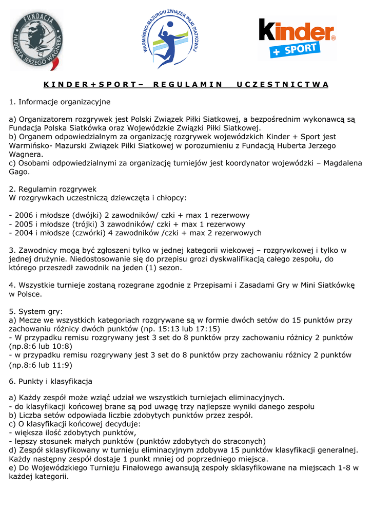 KINDER+SPORT– REGULAMIN UCZESTNICTWA 1. Informacje organizacyjne a) Organizatorem rozgrywek jest Polski Związek Piłki Siatkowej, a bezpośrednim wykonawcą są Fundacja Polska Siatkówka oraz Wojewódzkie Związki Piłki Siatkowej. b) Organem odpowiedzialnym za organizację rozgrywek wojewódzkich Kinder + Sport jest Warmińsko- Mazurski Związek Piłki Siatkowej w porozumieniu z Fundacją Huberta Jerzego Wagnera. c) Osobami odpowiedzialnymi za organizację turniejów jest koordynator wojewódzki – Magdalena Gago. 2. Regulamin rozgrywek W rozgrywkach uczestniczą dziewczęta i chłopcy: - 2006 i młodsze (dwójki) 2 zawodników/ czki + max 1 rezerwowy - 2005 i młodsze (trójki) 3 zawodników/ czki + max 1 rezerwowy - 2004 i młodsze (czwórki) 4 zawodników /czki + max 2 rezerwowych 3. Zawodnicy mogą być zgłoszeni tylko w jednej kategorii wiekowej – rozgrywkowej i tylko w jednej drużynie. Niedostosowanie się do przepisu grozi dyskwalifikacją całego zespołu, do którego przeszedł zawodnik na jeden (1) sezon. 4. Wszystkie turnieje zostaną rozegrane zgodnie z Przepisami i Zasadami Gry w Mini Siatkówkę w Polsce. 5. System gry: a) Mecze we wszystkich kategoriach rozgrywane są w formie dwóch setów do 15 punktów przy zachowaniu różnicy dwóch punktów (np. 15:13 lub 17:15) - W przypadku remisu rozgrywany jest 3 set do 8 punktów przy zachowaniu różnicy 2 punktów (np.8:6 lub 10:8) - w przypadku remisu rozgrywany jest 3 set do 8 punktów przy zachowaniu różnicy 2 punktów (np.8:6 lub 11:9) 6. Punkty i klasyfikacja a) Każdy zespół może wziąć udział we wszystkich turniejach eliminacyjnych. - do klasyfikacji końcowej brane są pod uwagę trzy najlepsze wyniki danego zespołu b) Liczba setów odpowiada liczbie zdobytych punktów przez zespół. c) O klasyfikacji końcowej decyduje: - większa ilość zdobytych punktów, - lepszy stosunek małych punktów (punktów zdobytych do straconych) d) Zespół sklasyfikowany w turnieju eliminacyjnym zdobywa 15 punktów klasyfikacji generalnej. Każdy następny zespół dostaje 1 punkt mniej od poprzedniego miejsca. e) Do Wojewódzkiego Turnieju Finałowego awansują zespoły sklasyfikowane na miejscach 1-8 w każdej kategorii. 7. Dokumenty uprawniające do gry: a) Zgłoszenie zespołu do pobrania ze strony www.wmzps.org do Koordynatora projektu OBOWIĄZKOWO w wyznaczonym terminie (2 tygodnie przez turniejem) b) Dopuszczalne jest wycofanie się z turnieju w terminie JEDNEGO tygodnia przed zawodami. Po tym terminie zespół zostaje zdyskwalifikowany i nie może wziąć udziału w tym i następnym turnieju. c) Ważna zgoda rodziców na udział dziecka w turnieju (brak pisemnej zgody jest równoznaczny z niedopuszczeniem zawodnika) d) Skład zespołu obowiązuje przez cały czas trwania rozgrywek e) Legitymacja szkolna lub dokument tożsamości ze zdjęciem. 8. Zgłoszenie zespołu do turnieju a) Zgłoszenie należy przesłać drogą elektroniczną w nieprzekraczalnym terminie, określonym przez Koordynatora Wojewódzkiego na adres [email protected]. Druki przesłane z opóźnieniem nie będą przyjmowane. b) Każdy zespół ma prawo zgłosić Trenera i Opiekuna. Otrzymują oni specjalny identyfikator przy weryfikacji zespołów. c) Przy boisku może znajdować się TYLKO 1 osoba (Opiekun LUB Trener) d) Sędziowie mają prawo do odmowy rozpoczęcia / kontynuacji zawodów w przypadku znajdowania się więcej niż jednej osoby przy boisku. e) Karta zgłoszeniowa jest do pobrania na stronie www.wmzps.org w zakładce „Do pobrania” 9. Podczas zawodów pełną odpowiedzialność i opiekę za zawodników i kibiców danej drużyny ponosi Trener lub Opiekun desygnowany przy zgłoszeniu. 10. Organizator lokalny zapewnia opiekę medyczną. 11. Koordynatorzy nie odpowiadają za rzeczy dzieci pozostawione w szatniach oraz w miejscu rozgrywania zawodów. 12. Wszelkie sprawy sporne rozstrzyga Koordynator Wojewódzki w porozumieniu z Sędzią Głównym zawodów. Decyzja jest ostateczna i nie podlega weryfikacji. 13. Sędzią Głównym wszystkich zawodów, osobą odpowiedzialną za system rozgrywek i Sędzią Głównym w kategorii „dwójki” jest Adam Awiżeń ([email protected] lub tel.792-980-510) Sędzią Głównym w kategorii „trójki” i „czwórki” jest Marek Kurmin (tel. 500-432-677) 13. Organizator zapewnia piłki meczowe. Piłki do rozgrzewki leżą w gestii klubów. 14. Zespoły które zajmą 2 (dwa) pierwsze miejsca w Finale Wojewódzkim Turnieju Finałowym uzyskają bezpośredni awans do Turnieju Centralnego o Puchar Kinder+Sport.