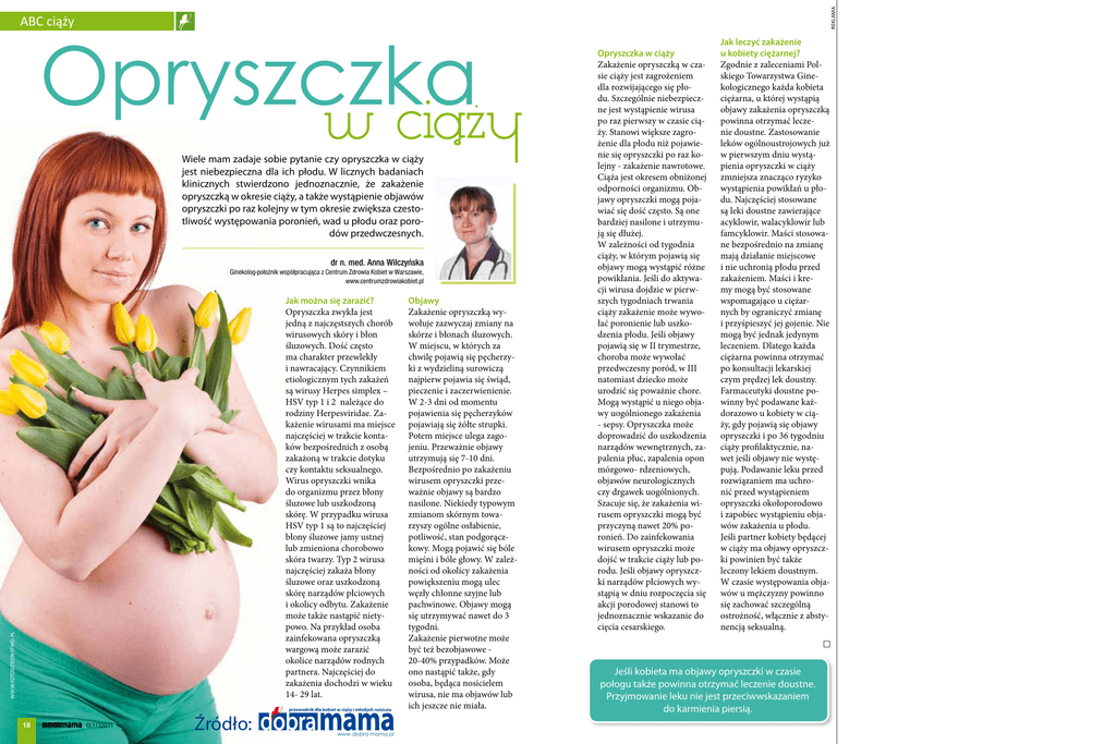 REKLAMA ABC ciąży Opryszczka w ciąży Wiele mam zadaje sobie pytanie czy opryszczka w ciąży jest niebezpieczna dla ich płodu. W licznych badaniach klinicznych stwierdzono jednoznacznie, że zakażenie opryszczką w okresie ciąży, a także wystąpienie objawów opryszczki po raz kolejny w tym okresie zwiększa czestotliwość występowania poronień, wad u płodu oraz porodów przedwczesnych. dr n. med. Anna Wilczyńska Ginekolog-położnik współpracująca z Centrum Zdrowia Kobiet w Warszawie, www.centrumzdrowiakobiet.pl WWW.FOTODZIECINSTWO.PL Jak można się zarazić? Opryszczka zwykła jest jedną z najczęstszych chorób wirusowych skóry i błon śluzowych. Dość często ma charakter przewlekły i nawracający. Czynnikiem etiologicznym tych zakażeń są wirusy Herpes simplex – HSV typ 1 i 2 należące do rodziny Herpesviridae. Zakażenie wirusami ma miejsce najczęściej w trakcie kontaków bezpośrednich z osobą zakażoną w trakcie dotyku czy kontaktu seksualnego. Wirus opryszczki wnika do organizmu przez błony śluzowe lub uszkodzoną skórę. W przypadku wirusa HSV typ 1 są to najczęściej błony śluzowe jamy ustnej lub zmieniona chorobowo skóra twarzy. Typ 2 wirusa najczęściej zakaża błony śluzowe oraz uszkodzoną skórę narządów płciowych i okolicy odbytu. Zakażenie może także nastąpić nietypowo. Na przykład osoba zainfekowana opryszczką wargową może zarazić okolice narządów rodnych partnera. Najczęściej do zakażenia dochodzi w wieku 14- 29 lat. 18 6(11)2011 Źródło: przewodnik dla kobiet w ciąży i młodych rodziców www.dobra-mama.pl Objawy Zakażenie opryszczką wywołuje zazwyczaj zmiany na skórze i błonach śluzowych. W miejscu, w których za chwilę pojawią się pęcherzyki z wydzieliną surowiczą najpierw pojawia się świąd, pieczenie i zaczerwienienie. W 2-3 dni od momentu pojawienia się pęcherzyków pojawiają się żółte strupki. Potem miejsce ulega zagojeniu. Przeważnie objawy utrzymują się 7-10 dni. Bezpośrednio po zakażeniu wirusem opryszczki przeważnie objawy są bardzo nasilone. Niekiedy typowym zmianom skórnym towarzyszy ogólne osłabienie, potliwość, stan podgorączkowy. Mogą pojawić się bóle mięśni i bóle głowy. W zależności od okolicy zakażenia powiększeniu mogą ulec węzły chłonne szyjne lub pachwinowe. Objawy mogą się utrzymywać nawet do 3 tygodni. Zakażenie pierwotne może być też bezobjawowe 20-40% przypadków. Może ono nastąpić także, gdy osoba, będąca nosicielem wirusa, nie ma objawów lub ich jeszcze nie miała. Opryszczka w ciąży Zakażenie opryszczką w czasie ciąży jest zagrożeniem dla rozwijającego się płodu. Szczególnie niebezpieczne jest wystąpienie wirusa po raz pierwszy w czasie ciąży. Stanowi większe zagrożenie dla płodu niż pojawienie się opryszczki po raz kolejny - zakażenie nawrotowe. Ciąża jest okresem obniżonej odporności organizmu. Objawy opryszczki mogą pojawiać się dość często. Są one bardziej nasilone i utrzymują się dłużej. W zależności od tygodnia ciąży, w którym pojawią się objawy mogą wystąpić różne powikłania. Jeśli do aktywacji wirusa dojdzie w pierwszych tygodniach trwania ciąży zakażenie może wywołać poronienie lub uszkodzenia płodu. Jeśli objawy pojawią się w II trymestrze, choroba może wywołać przedwczesny poród, w III natomiast dziecko może urodzić się poważnie chore. Mogą wystąpić u niego objawy uogólnionego zakażenia - sepsy. Opryszczka może doprowadzić do uszkodzenia narządów wewnętrznych, zapalenia płuc, zapalenia opon mózgowo- rdzeniowych, objawów neurologicznych czy drgawek uogólnionych. Szacuje się, że zakażenia wirusem opryszczki mogą być przyczyną nawet 20% poronień. Do zainfekowania wirusem opryszczki może dojść w trakcie ciąży lub porodu. Jeśli objawy opryszczki narządów płciowych wystąpią w dniu rozpoczęcia się akcji porodowej stanowi to jednoznacznie wskazanie do cięcia cesarskiego. Jak leczyć zakażenie u kobiety ciężarnej? Zgodnie z zaleceniami Polskiego Towarzystwa Ginekologicznego każda kobieta ciężarna, u której wystąpią objawy zakażenia opryszczką powinna otrzymać leczenie doustne. Zastosowanie leków ogólnoustrojowych już w pierwszym dniu wystąpienia opryszczki w ciąży zmniejsza znacząco ryzyko wystąpienia powikłań u płodu. Najczęściej stosowane są leki doustne zawierające acyklowir, walacyklowir lub famcyklowir. Maści stosowane bezpośrednio na zmianę mają działanie miejscowe i nie uchronią płodu przed zakażeniem. Maści i kremy mogą być stosowane wspomagająco u ciężarnych by ograniczyć zmianę i przyśpieszyć jej gojenie. Nie mogą być jednak jedynym leczeniem. Dlatego każda ciężarna powinna otrzymać po konsultacji lekarskiej czym prędzej lek doustny. Farmaceutyki doustne powinny być podawane każdorazowo u kobiety w ciąży, gdy pojawią się objawy opryszczki i po 36 tygodniu ciąży profilaktycznie, nawet jeśli objawy nie występują. Podawanie leku przed rozwiązaniem ma uchronić przed wystąpieniem opryszczki okołoporodowo i zapobiec wystąpieniu objawów zakażenia u płodu. Jeśli partner kobiety będącej w ciąży ma objawy opryszczki powinien być także leczony lekiem doustnym. W czasie występowania objawów u mężczyzny powinno się zachować szczególną ostrożność, włącznie z abstynencją seksualną. Jeśli kobieta ma objawy opryszczki w czasie połogu także powinna otrzymać leczenie doustne. Przyjmowanie leku nie jest przeciwwskazaniem do karmienia piersią.