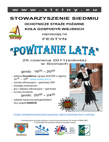 w w w . s i c i n y . e u STOWARZYSZENIE SIEDMIU OCHOTNICZE STRAŻE POŻARNE KOŁA GOSPODYŃ WIEJSKICH zapraszają na FESTYN 25 czerwca 2011(sobota) w Sicinach godz. 1600 - 2000 pokazy Szczudlarzy z grupy AVATAR z Legnicy 16 00 – 1900 www.avatar.art.pl turniej rekreacyjno – sportowy OSP występy artystyczne gry i zabawy rekreacyjno – sportowe turniej strzelecki godz. 2000 - 2400 zabawa taneczna pod gwiazdami Gra zespół DARECKI STOISKA Z WYŚMIENITYM MIEJSCOWYM JADŁEM ORAZ OBFICIE ZAOPATRZONY BUFET Z NAPOJAMI Przedsięwzięcie otrzymało dotację w ramach przyznanej pomocy Oś Leader w PROW 2007 – 13 DZIAŁANIE 414 wdrażanie lokalnych strategii rozwoju.
