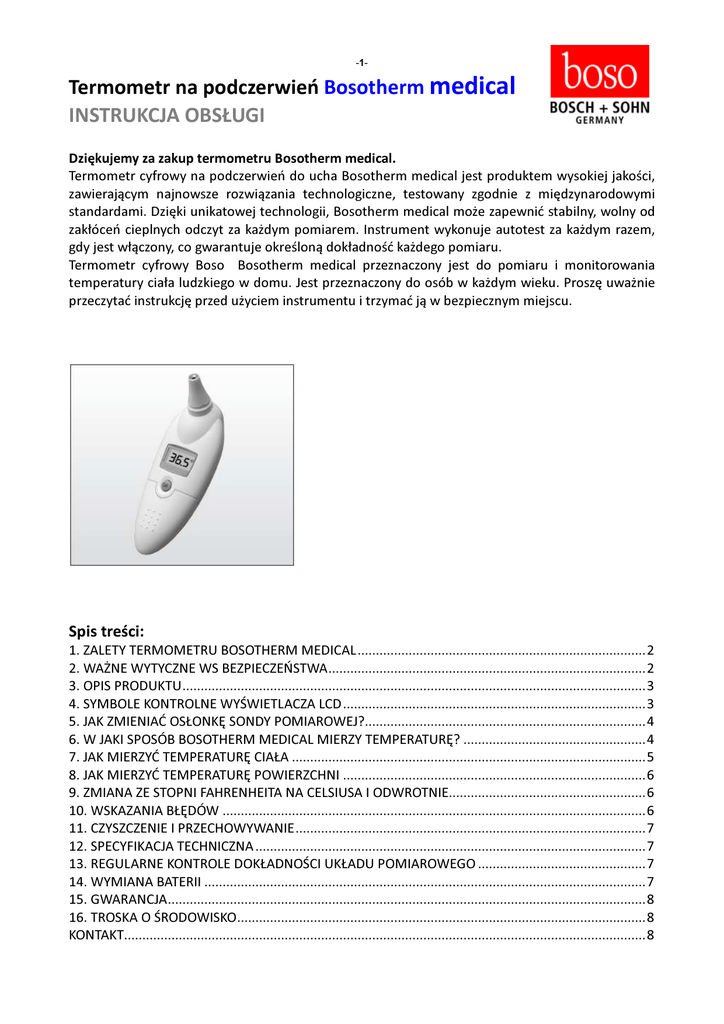 -1- Termometr na podczerwień Bosotherm medical INSTRUKCJA OBSŁUGI Dziękujemy za zakup termometru Bosotherm medical. Termometr cyfrowy na podczerwień do ucha Bosotherm medical jest produktem wysokiej jakości, zawierającym najnowsze rozwiązania technologiczne, testowany zgodnie z międzynarodowymi standardami. Dzięki unikatowej technologii, Bosotherm medical może zapewnić stabilny, wolny od zakłóceń cieplnych odczyt za każdym pomiarem. Instrument wykonuje autotest za każdym razem, gdy jest włączony, co gwarantuje określoną dokładność każdego pomiaru. Termometr cyfrowy Boso Bosotherm medical przeznaczony jest do pomiaru i monitorowania temperatury ciała ludzkiego w domu. Jest przeznaczony do osób w każdym wieku. Proszę uważnie przeczytać instrukcję przed użyciem instrumentu i trzymać ją w bezpiecznym miejscu. Spis treści: 1. ZALETY TERMOMETRU BOSOTHERM MEDICAL...............................................................................2 2. WAŻNE WYTYCZNE WS BEZPIECZEŃSTWA.......................................................................................2 3. OPIS PRODUKTU...............................................................................................................................3 4. SYMBOLE KONTROLNE WYŚWIETLACZA LCD...................................................................................3 5. JAK ZMIENIAĆ OSŁONKĘ SONDY POMIAROWEJ?.............................................................................4 6. W JAKI SPOSÓB BOSOTHERM MEDICAL MIERZY TEMPERATURĘ? ..................................................4 7. JAK MIERZYĆ TEMPERATURĘ CIAŁA .................................................................................................5 8. JAK MIERZYĆ TEMPERATURĘ POWIERZCHNI ...................................................................................6 9. ZMIANA ZE STOPNI FAHRENHEITA NA CELSIUSA I ODWROTNIE......................................................6 10. WSKAZANIA BŁĘDÓW ....................................................................................................................6 11. CZYSZCZENIE I PRZECHOWYWANIE................................................................................................7 12. SPECYFIKACJA TECHNICZNA ...........................................................................................................7 13. REGULARNE KONTROLE DOKŁADNOŚCI UKŁADU POMIAROWEGO ..............................................7 14. WYMIANA BATERII .........................................................................................................................7 15. GWARANCJA...................................................................................................................................8 16. TROSKA O ŚRODOWISKO................................................................................................................8 KONTAKT...............................................................................................................................................8 -2- 1. ZALETY TERMOMETRU BOSOTHERM MEDICAL Użycie wielokrotne (szeroki zakres pomiarowy) Bosotherm medical oferuje szeroki zakres pomiarowy od 0° C do 100,0° C (32.0° F do 212,0° F); produkt może być stosowany jako termometr do pomiaru temperatury ciała niemowląt, dzieci i dorosłych w uchu. Poza tym to także może być użyty do pomiaru temperatury powierzchni: • temperatura powierzchni mleka w butelce do karmienia dziecka • Temperaturę powierzchni wody kąpieli dziecka • Temperatura otoczenia Pomiar w ciągu 1 sekundy. Innowacyjna technologia podczerwieni pozwala na pomiar temperatury w uchu w ciągu tylko 1 sekundy. Dokładnie i wiarygodnie. Dzięki unikatowej konstrukcji sondy, zaawansowany czujnik podczerwieni i kompletny proces kalibracji tej jednostki zapewnia bardzo dokładne i wiarygodne pomiary temperatury w uchu. Automatyczna pamięć. Produkt wyświetla ostatnie odczyty automatycznie przez 2 sekundy, kiedy urządzenie jest włączone. Bezpiecznie i higienicznie • Nie ma ryzyka stłuczenia szkła lub połknięcia rtęci. • Sondy jednorazowe zapewniają pełną higienę stosowania Bosotherm medical. Alarm w przypadku gorączki 10 krótkich sygnałów alarmowych informuje pacjenta, że może on mieć gorączkę 2. WAŻNE WYTYCZNE WS BEZPIECZEŃSTWA • • • • • • Nigdy nie używaj termometru do celów innych niż te, do których został przeznaczony. Należy uważać na dzieci podczas stosowania. Zawsze używaj termometru z wykorzystaniem nowej, nieuszkodzonej osłony sondy dla każdego z pomiarów, aby zapobiec infekcji. Należy używać tylko oryginalnych osłon boso (kod katalogowy 114-BO-520-7-086). Nigdy nie zanurzać Bosotherm medical w wodzie lub innych płynach (nie jest wodoszczelny). Przy czyszczeniu i dezynfekcji należy postępować zgodnie z instrukcjami zawartymi w sekcji "Czyszczenie i przechowywanie". Przechowywać urządzenie i osłony sondy z dala od bezpośredniej ekspozycji na słońce i przechowywać je w wolnym od kurzu, suchym pomieszczeniu, w temperaturze pomiędzy 10 ° 40°. Nie używaj termometru, jeśli są oznaki uszkodzenia. W razie uszkodzenia, nie próbuj naprawiać instrumentu! Proszę skontaktować się z autoryzowanym dealerem lub bezpośrednio Boso Bosch+Sohn. Bosotherm medical składa się z precyzyjnych części o najwyższej jakości wykonania. Nie rzucać instrumentem! Chronić go przed silnymi uderzeniami i wstrząsami. Nie rozkręcać instrumentu i czujnika! -3- Uwagi: • Należy przechowywać osłonki sondy w miejscu niedostępnym dla dzieci. • Korzystanie z termometru na podczerwień nie może być substytutem konsultacji z lekarzem. • Termometr nie jest wodoszczelny! Proszę nigdy nie zanurzaj go w cieczy! • Woskowina w przewodzie słuchowym może powodować zaniżone odczyty temperatury. Upewnij się, że kanał słuchowy jest czysty, aby uniknąć błędnych odczytów. • Elektryc