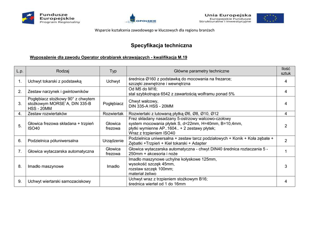 Wsparcie kształcenia zawodowego w kluczowych dla regionu branżach Specyfikacja techniczna Wyposażenie dla zawodu Operator obrabiarek skrawających - kwalifikacja M.19 L.p. Rodzaj 1. Uchwyt tokarski z podstawką 2. Zestaw narzynek i gwintowników Główne parametry techniczne Typ Uchwyt średnica Ø160 z podstawką do mocowania na frezarce; szczęki zewnętrzne i wewnętrzna Od M5 do M16; stal szybkotnąca 6542 z zawartością wolframu ponad 5% Pogłębiacz stożkowy 90° z chwytem stożkowym MORSE`A, DIN 335-B HSS - 20MM Zestaw rozwiertaków Pogłębiacz Chwyt walcowy, DIN 335-A HSS - 20MM Rozwiertak 5. Głowica frezowa składana + trzpień ISO40 Głowica frezowa 6. Podzielnica półuniwersalna 7. Głowica wytaczarska automatyczna Głowica frezowa 8. Imadło maszynowe Imadło 9. Uchwyt wiertarski samozaciskowy Rozwiertaki z lutowaną płytką Ø6, Ø8, Ø10, Ø12 Frez składany nasadzany 5-ostrzowy walcowo-czołowy system mocowania płytek S, d=22mm, H=40mm, B=10,4mm, płytki wymienne AP..1604.. + 2 zestawy płytek; Wraz z trzpieniem ISO40 Podzielnica uniwersalna + zestaw tarcz podziałowych + Konik + Koła zębate + Zębatki +Trzpień + Kieł tokarski + Adapter Głowica wytaczarska automatyczna - chwyt DIN40 średnica roztaczania 5 250mm + akcesoria i noże Imadło maszynowe uchylne kołyskowe 125mm, wysokość szczęk 45mm, rozstaw szczęk 100mm; materiał żeliwo Uchwyt wraz z trzpieniem stożkowym B16; średnica wierteł od 1 do 16mm 3. 4. Urządzenie Ilość sztuk 4 4 4 4 2 2 1 3 4 10. Suwmiarka elektroniczna wodoodporna 150mm 11. Suwmiarka kieszonkowa z śrubą blokującą 150mm 12. Oprawka z tulejkami zaciskowymi 13. Zestaw frezów 2-ostrzowych trzpieniowych uniwersalnych 14. Zestaw płytek skrawających* * Wsparcie kształcenia zawodowego w kluczowych dla regionu branżach Suwmiarka odporna na wodę, oleje, płyny chłodzące itp. zgodnie z klasą IP Suwmiarka 67ze stali nierdzewnej; przełącznik mm/cale Suwmiarka ze stali nierdzewnej, hartowana, skala mm/cale, Suwmiarka powierzchnie z podziałkami chromowane na mat; noniusz o dokładności 1/20 i 1/128", i długości 39 mm Oprawka z tulejkami zaciskowymi ER25; Oprawka zakres tulejek od 3 do 16mm (14 sztuk); część chwytowa DIN40 Frezy 2-ostrzowe trzpieniowe uniwersalne z chwytem walcowym WELDON Frezy powłoka (materiał) materiał PM HSS-E TiAIN; średnice Ø10, Ø12, Ø14, Ø16 Płytki do aluminium i stali GX M1 1op.(10szt.); Płytki MC 05-5-1.50 Płytki 1op.(5szt); Płytki CCMT 09T304EN-ZM 1op.(10szt) Element, którego nie obejmuje gwarancja 5 5 1 5 1