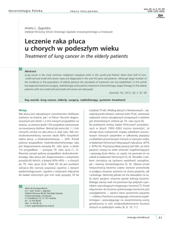 Gerontologia Polska tom 20, nr 3, 81–90 ISSN 1425–4956 PRACA POGLĄDOWA Aneta L. Zygulska Oddział Kliniczny Kliniki Onkologii Szpitala Uniwersyteckiego w Krakowie Leczenie raka płuca u chorych w podeszłym wieku Treatment of lung cancer in the elderly patients Abstract Lung cancer is the most common malignant neoplasm both in the world and Poland. More than half of non-small-cell and small-cell cancer cases are diagnosed in the over 65 years old patients. Although large number of the incidence in the population of elderly persons the standards of treatment are not established. In this article locoregional treatment (surgery, radiotherapy) and systemic treatment (chemotherapy, target therapy) in the elderly patients with non-small-cell and small-cell cancer are discussed. Gerontol. Pol. 2012; 20, 3: 81–90 Key words: lung cancer, elderly, surgery, radiotherapy, systemic treatment Wstęp Rak płuca jest najczęstszym nowotworem złośliwym zarówno na świecie, jak i w Polsce. Rocznie diagnozowanych jest około 1,2 mln nowych przypadków na świecie, co stanowi około 12% wszystkich zachorowań na nowotwory złośliwe. Niemal tyle samo (ok. 1,1 mln chorych) umiera na raka płuca w skali roku. Rak niedrobnokomórkowy stanowi około 80% wszystkich raków płuca, a drobnokomórkowy — 20%. Ponad połowa przypadków niedrobnokomórkowego raka jest diagnozowana powyżej 65. roku życia, a około 1/3 przypadków — powyżej 70. roku życia [1, 2]. Również ponad połowa przypadków drobnokomórkowego raka płuca jest diagnozowana u pacjentów przeszło 65-letnich, a kolejne 30%–40% — u chorych po 70. roku życia [3,4]. Wiek 65 lat jest punktem odcięcia dla starszej populacji zgodnie z danymi epidemiologicznymi, zgodnie z kryteriami włączenia do badań klinicznych jest nim wiek powyżej 70 lat Adres do korespondencji: dr n. med. Aneta L. Zygulska Oddział Kliniczny Kliniki Onkologii Szpitala Uniwersyteckiego w Krakowie ul. Śniadeckich 10, 31–531 Kraków tel.: 12 424 88 88 faks: 12 424 89 10 e-mail: [email protected] (rzadziej 75 lat). Według danych z literaturowych , najczęściej punkt odcięcia stanowi wiek 70 lat , ponieważ większość zmian narządowych związanych z wiekiem jest stwierdzanych właśnie po 70. roku życia [5]. Na podstawie analizy badań klinicznych prowadzonych w latach 1995–2002 można stwierdzić, że istnieje duża rozbieżność między odsetkiem procentowym starszych pacjentów w całkowitej populacji a odsetkiem procentowym chorych w starszym wieku w badaniach klinicznych dotyczących raka płuca (67% v. 35%) [4]. Przyczyną takiej sytuacji jest fakt, że starsi pacjenci cierpią na wiele schorzeń współistniejących i zażywają dużo leków, co często nie pozwala im na udział w badaniach klinicznych [5, 6]. Ponadto z wiekiem zmniejsza się zarówno wydolność narządów, jak i rezerwy hematologiczne [5, 6]. Obawa przed toksycznością leczenia często stanowi przeszkodę w podjęciu leczenia zarówno ze strony pacjenta, jak i onkologa. Niemniej jednak nie ma dowodów na to, że starsi pacjenci znacznie gorzej tolerują leczenie. Dlatego starszy wiek nie powinien być jedynym czynnikiem warunkującym rezygnację z leczenia [7]. Przed włączeniem do leczenia systemowego konieczne jest uwzględnienie — oprócz stanu sprawności pacjenta — indeksu Charlsona oceniającego schorzenia współistniejące i pozwalającego na wszechstronną ocenę geriatryczną w celu zindywidualizowania leczenia chorych w podeszłym wieku [8, 9, 10, 11]. www.gp.viamedica.pl 81 Gerontologia Polska 2012, tom 20, nr 3 Rokowanie w przypadku rozpoznania raka płuca jest złe. Wśród chorych powyżej 75. roku życia jest mniejsze prawdopodobieństwo wykonania pełnej diagnostyki i otrzymania optymalnego leczenia (zarówno chirurgicznego, napromienianiem, jak i chemioterapii) w porównaniu z młodszymi pacjentami [12]. Chorzy na raka płuca poniżej 45. roku życia częściej są objawowi w chwili diagnozy (m.in. częściej zgłaszają ból w klatce piersiowej) [13]. Wraz z wiekiem wzrasta odsetek bezobjawowych pacjentów. Szacuje się, że ten odsetek waha się między 18% (wśród pacjentów poniżej 60. roku życia) a 24% (w grupie 70-letnich i starszych chorych) [13]. Różnica ta ma związek z częstszym wykonywaniem rtg klatki piersiowej z powodu schorzeń współistniejących u osób w podeszłym wieku. To z kolei przyczynia się do wcześniejszego rozpoznania raka płuca [13, 14]. Leczenie lokoregionalne Leczenie chirurgiczne niedrobnokomórkowego raka płuca Resekcja płata lub oszczędzająca płuco anatomiczna resekcja z wycięciem węzłów chłonnych są rekomendowanymi rodzajami zabiegów operacyjnych wykonywanymi we wczesnych stadiach zaawansowania niedrobnokomórkowego raka płuca. W I stadium zaawansowania klinicznego 5-letnie przeżycie po lobektomii wynosi 45–65% w porównaniu do 6% odsetka przeżyć w przypadku chorych nieoperowanych. Dlatego pacjenci z dobrym stanem sprawności (PS = 0,1), brakiem przeciwwskazań do zabiegu operacyjnego z przyczyn pozaonkologicznych i z odpowiednią wydolnością płuc powinni być kwalifikowani do resekcji płuca [15]. Związek między wiekiem a przeżyciem na raka płuca jest tematem wielu publikacji od kilku dekad. Wiek (70 lat i powyżej) jest znanym niezależnym czynnikiem prognostycznym przeżycia po leczeniu chirurgicznym [16, 17, 18, 19]. Wiadomo jednak, że nie powinno się rezygnować z zabiegu operacyjnego wyłącznie z powodu podeszłego wieku pacjenta [16, 17, 20, 21]. Poza tym starsi pacjenci mają gorszy stan sprawności i często chorują na chorobę niedokrwienną serca, przebyli zawał mózgu lub mają zaburzenia oddechowe, co zwiększa ryzyko pooperacyjne i przyczynia się do ostrożnego kwalifikowania do leczenia operacyjnego [14]. Szacuje się, że wśród chorych poniżej 45. roku życia jedynie 6% ma chorobę w I lub II stadium zaawansowania klinicznego, aż 33% chorych w tej grupie wi