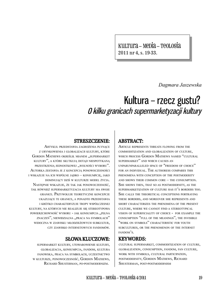 Kultura – Media – Teologia 2011 nr 4, s. 19-33. Dagmara Jaszewska Kultura – rzecz gustu? O kilku granicach supermarketyzacji kultury STRESZCZENIE: ARTYKUŁ PRZEDSTAWIA ZAGROŻENIA PŁYNĄCE Z URYNKOWIENIA I GLOBALIZACJI KULTURY, KTÓRE GORDON MATHEWS OKREŚLIŁ MIANEM „SUPERMARKET KULTURY”, A KTÓRE SKUTKUJĄ DOTĄD NIESPOTYKANĄ PRZESTRZENIĄ JEDNOSTKOWEJ „WOLNOŚCI WYBORU”. AUTORKA ZESTAWIA JE Z KONCEPCJĄ PONOWOCZESNOŚCI I WSKAZUJE NA ICH WSPÓLNE JĄDRO – KONSUMPCJĘ, JAKO DOMINUJĄCY DZIŚ W KULTURZE MODEL ŻYCIA. NASTĘPNIE WSKAZUJE, ŻE TAK JAK PONOWOCZESNOŚĆ, ABSTRACT: ARTICLE REPRESENTS THREATS FLOWING FROM THE COMMODITIZATION AND GLOBALIZATION OF CULTURE, WHICH PROCESS GORDON MATHEWS NAMED “CULTURAL SUPERMARKET” AND WHICH CAUSES AN UNPARUNPARALLELED SPACE OF "FREEDOM OF CHOICE” FOR AN INDIVIDUAL. THE AUTHORESS COMPARES THIS PHENOMENA WITH CONCEPTION OF THE POSTMODERITY UKAZUJĄCE TE GRANICE, A PONADTO PRZEDSTAWIA – THE CONSUMPTION. SHE SHOWS THEN, THAT SO AS POSTMODERNITY, AS THE SUPERMARKETIZATION OF CULTURE HAS IT’S BORDERS TOO. SHE CALLS THE THEORETICAL CONCEPTIONS PORTRAYING THESE BORDERS, AND MOREOVER SHE REPRESENTS AND I KRÓTKO CHARAKTERYZUJE TROPY WSPÓŁCZESNEJ SHORT CHARACTERIZES THE PHENOMENA OF THE PRESENT TAK RÓWNIEŻ SUPERMARKETYZACJA KULTURY MA SWOJE GRANICE. PRZYWOŁUJE TEORETYCZNE KONCEPCJE KULTURY, NA KTÓRYCH NIE REALIZUJE SIĘ STEREOTYPOWA - JAK KONSUMPCJA „PEŁNA ZNACZEŃ”, NIEWIDZIALNA „PRACA NA SYMBOLACH” WIDOCZNA W ZJAWISKU MŁODZIEŻOWYCH SUBKULTUR, CZY ZJAWISKO INTERNETOWYCH FANDOMÓW. POWIERZCHOWNOŚĆ WYBORU SŁOWA KLUCZOWE: SUPERMARKET KULTURY, UTOWAROWIENIE KULTURY, GLOBALIZACJA, KONSUMPCJA, FANDOM, KULTURA FANOWSKA, PRACA NA SYMBOLACH, UCZESTNICTWO W KULTURZE, PONOWOCZESNOŚĆ, GORDON MATHEWS, RICHARD SHUSTERMAN, PO-POSTMODERNIZM. AND SHOWS THEIR COMMON CORE CULTURE, WHERE WE CANNOT FIND A STEREOTYPICAL VISION OF SUPERFICIALITY OF CHOICE - FOR EXAMPLE THE CONSUMPTION "FULL OF THE MEANINGS”, THE INVISIBLE "WORK ON SYMBOLS” CHARACTERISTIC FOR YOUTH SUBCULTURES, OR THE PHENOMENON OF THE INTERNET FANDOM’S. KEYWORDS: CULTURAL SUPERMARKET, COMMODITIZATION OF CULTURE, GLOBALIZATION, CONSUMPTION, FANDOM, FAN CULTURE, WORK WITH SYMBOLS, CULTURAL PARTICIPATION, POSTMODERNITY, GORDON MATHEWS, RICHARD SHUSTERMAN, POST-POSTMODERNISM Kultura – Media – Teologia 4/2011 19 SUPERMARKET KULTURY P ojęcie supermarket kultury zostało wprowadzone do dyskursu współczesnej antropologii przez Gordona Mathewsa1 na oznaczenie nowej kondycji kultury (zwanej chętnie ponowoczesną). Na skutek globalizacji i dotąd niespotykanego kontaktu kulturowego trudno jest już mówić dziś o całościach, takich jak kultura narodowa czy kultura etniczna, dochodzi zaś do powstawania kulturowych hybryd, widocznych w wymieszanych tożsamościach współczesnych ludzi. Choć kwestia istnienia „całości kulturowych” była od dawna w antropologii poddawana krytyce2 (a i coraz częściej słyszymy głosy krytyczne wobec „nowości” dzisiejszej sytuacji kulturowej 3), to zdaniem wielu badaczy (w tym Gordona Mathewsa), sytuacja dzisiejszej kultury jest szczególna, a typowe dla niej przejście „od świata korzeni” do „świata wyboru” nabiera szczególnego sensu. Tym, co powoduje tę bezprecedensowość, jest wszechobecna kultura masowa oraz logika (późnego, jak chce Jameson4) kapitalizmu. Choć od zawsze istniał kontakt kulturowy, wymiana kulturowa – to dziś istnieje on w skali niebywałej (popularność i dostępność podróży zagranicznych, a przede wszystkim rola mediów tworzących ze świata „globalną wioskę”). I tak, Mathews za wieloma badaczami współczesnej kultury podkreśla, że skoro dziś na ekranie telewizora widzimy cały świat, a to, co obce, inne, wydaje się swojskie – to łatwo być dziś antropologiem, relatywistą kulturowym, obeznanym z innością.5 Łatwo też ulec złudzeniu, w sytuacji „feerii pomysłów i tożsamości” prezentowanych na okrągło we współczesnych mediach6, można bez ograniczeń ową inność wprowadzać we własne życie. Z drugiej strony, zdaniem Mathewsa, miejsce państwa coraz bardziej wypiera dziś rynek – i to on odgrywa coraz większą rolę, również w kwestiach kulturowych. Te dwa zjawiska uzupełniają się więc i wzmacniają. Supermarketyzacja oznacza przejęcie zasad rynkowych, mechanizmu konsumpcji względem kultury - obyczaje, wierzenia, style życia zostają wpisane w rynek i mamy do nich łatwiejszy, niż kiedykolwiek wcześniej, dostęp. Niespotykana dotąd skala globalizacji, międzynarodowy obieg informacji, Internet, telewizja o światowym zasięgu stwarzają pole inspiracji, potencjalnej wymiany kulturowej. W telewizji czy Internecie oglądamy programy z całego świata, przedstawiające różne idee, 1 2 3 4 5 6 20 Autor wspomina jednakże, że termin ten był już sporadycznie w użyciu. Prawdopodobnie jako pierwszy użył go S. Hall w eseju The Question of Cultural Identity zamieszczonym w książce: S. Hall, D. Held, T. McGrew (red.), Modernity and Its Futures, Cambridge, 1992, s. 303. Zob. G. Mathews, Supermarket kultury. Kultura globalna a tożsamość jednostki, Warszawa 2005, s. 283. G. Mathews przytacza debatę nad współczesną antropologią, która już od czasów B. Malinowskiego narzekała na to, że przedmiot jej badań – lokalne, etniczne kultury – nieustannie jej umykał i zanikał . Tamże, s. 270 Według niektórych badaczy, jak R. Robertson, J. Friedman, globalizacja i wynikająca z niej tendencja do przejmowania elementów obcych kultur, a więc zanik mitycznego „świata korzeni”, miała już miejsce wieki temu. Niektórzy badacze wiążą to zjawisko z pojawieniem się pierwszych cywilizacji handlowych, inni – religii uniwersalnych, jak chrześcijaństwo, buddyzm . Tamże, s. 257. F. Jameson Postmodernizm i społeczeństwo konsumpcyjne, w: R. Nycz (red.), Postmodernizm. Antologia przekładów, Kraków 1998.