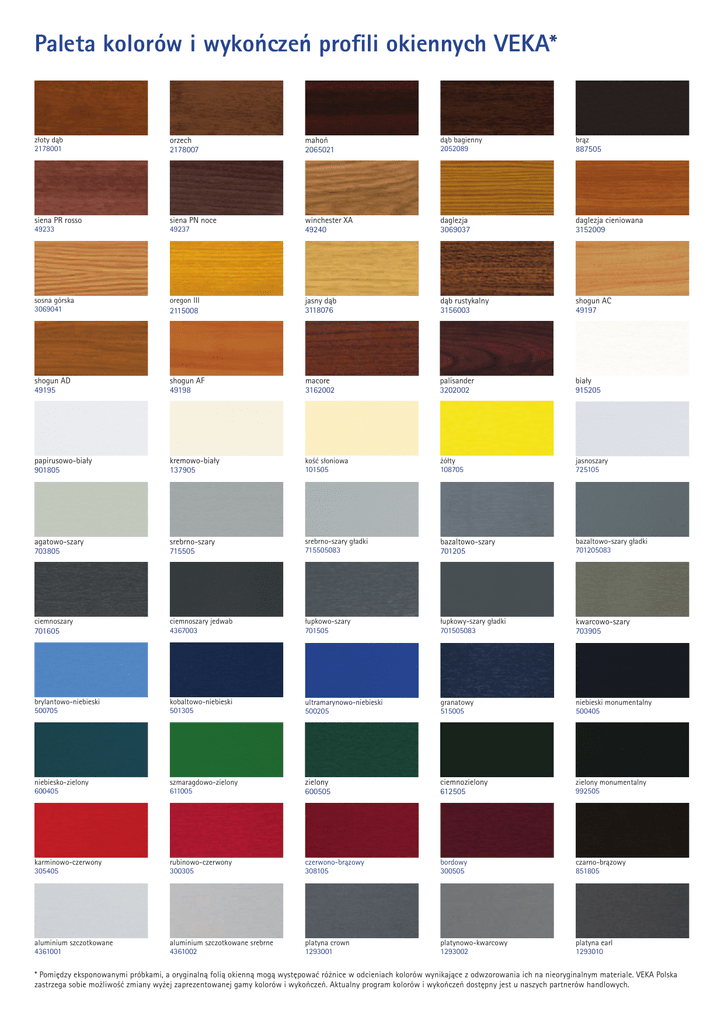 Paleta kolorów i wyko•cze• pro•li okiennych VEKA* z!oty d•b 2178001 orzech 2178007 maho• 2065021 d•b bagienny 2052089 br•z siena PR rosso siena PN noce 49233 49237 winchester XA 49240 daglezja 3069037 daglezja cieniowana 3152009 sosna górska 3069041 oregon III 2115008 jasny d•b 3118076 d•b rustykalny 3156003 shogun AC 49197 shogun AD 49195 shogun AF 49198 macore 3162002 palisander 3202002 bia!y 915205 papirusowo-bia!y 901805 kremowo-bia!y 137905 ko•• s!oniowa 101505 •ó!ty 108705 jasnoszary 725105 agatowo-szary 703805 srebrno-szary 715505 srebrno-szary g!adki 715505083 bazaltowo-szary 701205 bazaltowo-szary g!adki 701205083 ciemnoszary 701605 ciemnoszary jedwab 4367003 !upkowo-szary 701505 !upkowy-szary g!adki 701505083 kwarcowo-szary 703905 brylantowo-niebieski 500705 kobaltowo-niebieski 501305 ultramarynowo-niebieski 500205 granatowy 515005 niebieski monumentalny 500405 niebiesko-zielony 600405 szmaragdowo-zielony 611005 zielony 600505 ciemnozielony 612505 zielony monumentalny 992505 karminowo-czerwony 305405 rubinowo-czerwony 300305 czerwono-br•zowy 308105 bordowy 300505 czarno-br•zowy 851805 aluminium szczotkowane 4361001 aluminium szczotkowane srebrne 4361002 platyna crown 1293001 platynowo-kwarcowy 1293002 platyna earl 1293010 887505 * Pomi•dzy eksponowanymi próbkami, a oryginaln• foli• okienn• mog• wyst•powa• ró•nice w odcieniach kolorów wynikaj•ce z odwzorowania ich na nieoryginalnym materiale. VEKA Polska zastrzega sobie mo•liwo•• zmiany wy•ej zaprezentowanej gamy kolorów i wyko•cze•. Aktualny program kolorów i wyko•cze• dost•pny jest u naszych partnerów handlowych.