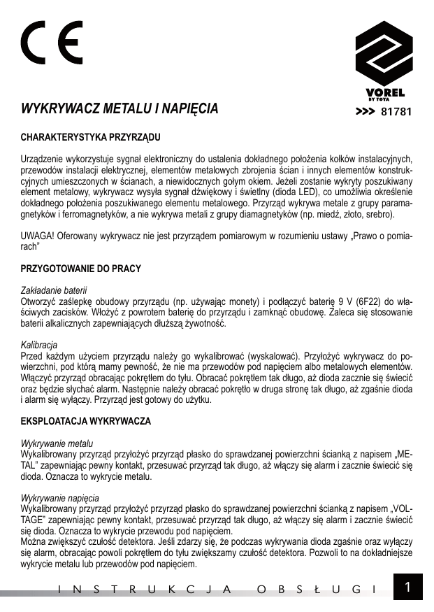 WYKRYWACZ METALU I NAPIĘCIA 81781 CHARAKTERYSTYKA PRZYRZĄDU Urządzenie wykorzystuje sygnał elektroniczny do ustalenia dokładnego położenia kołków instalacyjnych, przewodów instalacji elektrycznej, elementów metalowych zbrojenia ścian i innych elementów konstrukcyjnych umieszczonych w ścianach, a niewidocznych gołym okiem. Jeżeli zostanie wykryty poszukiwany element metalowy, wykrywacz wysyła sygnał dźwiękowy i świetlny (dioda LED), co umożliwia określenie dokładnego położenia poszukiwanego elementu metalowego. Przyrząd wykrywa metale z grupy paramagnetyków i ferromagnetyków, a nie wykrywa metali z grupy diamagnetyków (np. miedź, złoto, srebro). UWAGA! Oferowany wykrywacz nie jest przyrządem pomiarowym w rozumieniu ustawy „Prawo o pomiarach” PRZYGOTOWANIE DO PRACY Zakładanie baterii Otworzyć zaślepkę obudowy przyrządu (np. używając monety) i podłączyć baterię 9 V (6F22) do właściwych zacisków. Włożyć z powrotem baterię do przyrządu i zamknąć obudowę. Zaleca się stosowanie baterii alkalicznych zapewniających dłuższą żywotność. Kalibracja Przed każdym użyciem przyrządu należy go wykalibrować (wyskalować). Przyłożyć wykrywacz do powierzchni, pod którą mamy pewność, że nie ma przewodów pod napięciem albo metalowych elementów. Włączyć przyrząd obracając pokrętłem do tyłu. Obracać pokrętłem tak długo, aż dioda zacznie się świecić oraz będzie słychać alarm. Następnie należy obracać pokrętło w druga stronę tak długo, aż zgaśnie dioda i alarm się wyłączy. Przyrząd jest gotowy do użytku. EKSPLOATACJA WYKRYWACZA Wykrywanie metalu Wykalibrowany przyrząd przyłożyć przyrząd płasko do sprawdzanej powierzchni ścianką z napisem „METAL” zapewniając pewny kontakt, przesuwać przyrząd tak długo, aż włączy się alarm i zacznie świecić się dioda. Oznacza to wykrycie metalu. Wykrywanie napięcia Wykalibrowany przyrząd przyłożyć przyrząd płasko do sprawdzanej powierzchni ścianką z napisem „VOLTAGE” zapewniając pewny kontakt, przesuwać przyrząd tak długo, aż włączy się alarm i zacznie świecić się dioda. Oznacza to wykrycie przewodu pod napięciem. Można zwiększyć czułość detektora. Jeśli zdarzy się, że podczas wykrywania dioda zgaśnie oraz wyłączy się alarm, obracając powoli pokrętłem do tyłu zwiększamy czułość detektora. Pozwoli to na dokładniejsze wykrycie metalu lub przewodów pod napięciem. I N S T R U K C J A O B S Ł U G I 1 W przypadku nie stwierdzenia obecności przewodu pod napięciem w kontrolowanym obszarze należy dodatkowo upewnić się o sprawności wykrywacza poprzez sprawdzenie jego działania w miejscu, gdzie jest na pewno instalacja elektryczna pod napięciem. UWAGA! Nie będzie wykrywane napięcie w przewodach ekranowanych. W takim przypadku można wykryć jedynie metal. Pocieranie, lub uderzanie wykrywaczem o badaną powierzchnie może wytworzyć pole elektrostatyczne, które zafałszuje wynik detekcji. Uwaga! Ze względów bezpieczeństwa zaleca się sprawdzenie i zlokalizowanie przewodów instalacji elektrycznej pod napięciem przed innymi pracami, typu wiercenie, czy kucie. OCHRONA ŚRODOWISKA Symbol wskazujący na selektywne zbieranie zużytego sprzętu elektrycznego i elektronicznego. Zużyte urządzenia elektryczne są surowcami wtórnymi - nie wolno wyrzucać ich do pojemników na odpady domowe, ponieważ zawierają substancje niebezpieczne dla zdrowia ludzkiego i środowiska! Prosimy o aktywną pomoc w oszczędnym gospodarowaniu zasobami naturalnymi i ochronie środowiska naturalnego przez przekazanie zużytego urządzenia do punktu składowania zużytych urządzeń elektrycznych. Aby ograniczyć ilość usuwanych odpadów konieczne jest ich ponowne użycie, recykling lub odzysk w innej formie. 2008 Rok produkcji: Production year: Produktionsjahr: Год выпуска: Рік випуску: Pagaminimo metai: Ražošanas gads: Rok výroby: Rok výroby: Gyártási év: Anul producţiei utilajului: Año de fabricación: TOYA S.A. ul. Sołtysowicka 13-15, 51-168 Wrocław, Polska; Importator: TOYA ROMANIA S.A., Şoseaua Odăii nr 109-123, Bucureşti, Sector 1 2 I N S T R U K C J A O B S Ł U G I