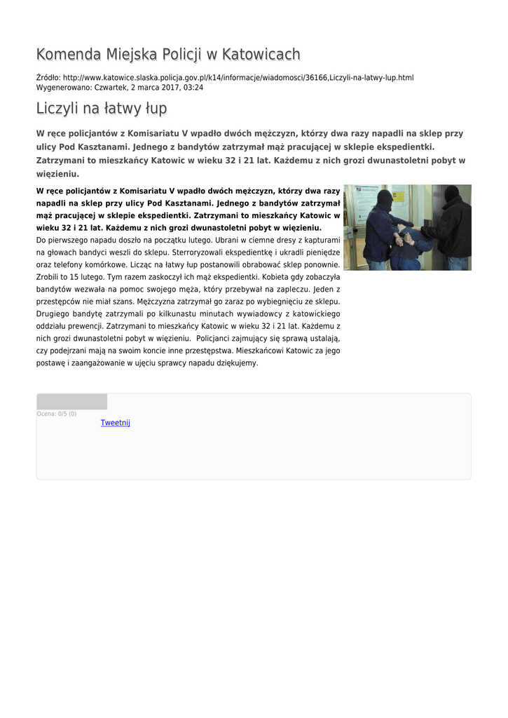 Komenda Miejska Policji w Katowicach Źródło: http://www.katowice.slaska.policja.gov.pl/k14/informacje/wiadomosci/36166,Liczyli-na-latwy-lup.html Wygenerowano: Czwartek, 2 marca 2017, 03:24 Liczyli na łatwy łup W ręce policjantów z Komisariatu V wpadło dwóch mężczyzn, którzy dwa razy napadli na sklep przy ulicy Pod Kasztanami. Jednego z bandytów zatrzymał mąż pracującej w sklepie ekspedientki. Zatrzymani to mieszkańcy Katowic w wieku 32 i 21 lat. Każdemu z nich grozi dwunastoletni pobyt w więzieniu. W ręce policjantów z Komisariatu V wpadło dwóch mężczyzn, którzy dwa razy napadli na sklep przy ulicy Pod Kasztanami. Jednego z bandytów zatrzymał mąż pracującej w sklepie ekspedientki. Zatrzymani to mieszkańcy Katowic w wieku 32 i 21 lat. Każdemu z nich grozi dwunastoletni pobyt w więzieniu. Do pierwszego napadu doszło na początku lutego. Ubrani w ciemne dresy z kapturami na głowach bandyci weszli do sklepu. Sterroryzowali ekspedientkę i ukradli pieniędze oraz telefony komórkowe. Licząc na łatwy łup postanowili obrabować sklep ponownie. Zrobili to 15 lutego. Tym razem zaskoczył ich mąż ekspedientki. Kobieta gdy zobaczyła bandytów wezwała na pomoc swojego męża, który przebywał na zapleczu. Jeden z przestępców nie miał szans. Mężczyzna zatrzymał go zaraz po wybiegnięciu ze sklepu. Drugiego bandytę zatrzymali po kilkunastu minutach wywiadowcy z katowickiego oddziału prewencji. Zatrzymani to mieszkańcy Katowic w wieku 32 i 21 lat. Każdemu z nich grozi dwunastoletni pobyt w więzieniu. Policjanci zajmujący się sprawą ustalają, czy podejrzani mają na swoim koncie inne przestępstwa. Mieszkańcowi Katowic za jego postawę i zaangażowanie w ujęciu sprawcy napadu dziękujemy. Ocena: 0/5 (0) Tweetnij
