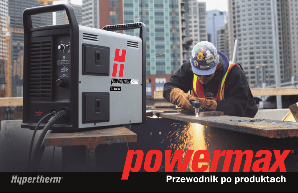 powermax Przewodnik po produktach ® 1 Wprowadzenie Wprowadzenie 1 Terminologia 2 Rzut oka na technologię plazmową 3 Zasady działania 4 Wywiad z klientem 5 Informacje ogólne 6 Tabela charakterystyk cięcia 7 Specyfikacja systemu 8 Powermax190c 9 Powermax30 11 Powermax45 13 Powermax1000 G3 Series 15 Powermax1250 G3 Series 17 Powermax1650 G3 Series 19 Akcesoria 21 Hypertherm projektuje i produkuje najbardziej na świecie zaawansowane systemy do cięcia plazmowego, stosowane w najróżniejszych gałęziach przemysłu, jak przemysł okrętowy, różne branże produkcyjne i naprawa pojazdów. Nasza oferta produktów obejmuje ręczne i zmechanizowane systemy cięcia plazmowego oraz materiały eksploatacyjne, a także układy CNC do kontroli ruchów i wysokości. Systemy Hypertherm cieszą się zaufaniem ze względu na szybkość i precyzję cięcia metalu, a także niezawodność, której efektem jest zwiększona produktywność i rentowność w dziesiątkach tysięcy firm. • Liczne patenty technologii plazmowej pozwalają ręcznym systemom Hypertherm maksymalizować jakość i szybkość cięcia, oraz żywotność części eksploatacyjnych przy jednoczesnym optymalnym zasilaniu. • Systemy gwarantują trwałość i bezpieczeństwo nawet w najtrudniejszych warunkach pracy. • Zaplecze produkcyjne i niezrównany poziom pomocy technicznej Hypertherm przekładają się na coraz większą wydajność, wartość i niezawodność. • Systemy Powermax mają pełną, trzyletnią gwarancję Hyperthermu na układ zasilania i 12 miesięczną na palnik. Gwarancja obejmuje wszystkie części. Wprowadzenie Spis treści Terminologia Cięcie plazmowe: Proces, w którym gaz o własnościach przewodzących jest kontrolowany i sterowany. Na palniku zamontowane są elementy eksploatacyjne, zwężające i sterujące strumieniem zjonizowanego gazu lub łuku plazmowego, pozwalając na cięcie popularnych metali. Conical Flow™: zgłoszony do ochrony patentowej proces takiego ukierunkowania gazu osłonowego, by uzyskać bardziej skupiony łuk, o wyższej gęstości energetycznej, co skutkuje węższą szczeliną i mniejszą ilością żużla. DSP (cyfrowe przetwarzanie sygnału): Metoda cyfrowego kontrolowania funkcjonowaniem systemu dla polepszenia wydajności i niezawodności, dzięki obniżeniu liczby części. ETR™ (Easy Torch Removal): Wyjątkowa konstrukcja złącza, pozwalająca na łatwą zamianę palników ręcznych i maszynowych. HyLife®: Elektrody o przedłużonej trwałości w porównaniu do standardowych urządzeń, korzystające z tej samej, opatentowanej technologii, jaką stosuje się w zaawansowanych układach zmechanizowanych Hypertherm. Kątowość: Miara kąta cięcia plazmowego. KSN: Komputerowe sterowanie numeryczne Linie połukowe: Wgłębienia w ciętej powierzchni, będące efektem działania łuku plazmowego. Łuk Coaxial-assist™: Opatentowana technologia generowania łuku plazmowego zwiększająca szybkość cięcia o 20% względem standardowych urządzeń. Obwód Auto-voltage™: Czujnik wejścia, pozwalający na pracę systemu przy różnych napięciach zasilania bez konieczności zmiany okablowania. Obwód Boost Conditioner™: Technologia kompensacji zmian napięcia zasilania. Obwód pomocniczy Dual-threshold™: Technologia Hypertherm, istotnie zmniejszająca zużycie dyszy, poprzez zwiększanie prądu pomocniczego dokładnie wtedy, gdy jest potrzebny. Powercool™: konstrukcja stosowana w celu dostarczenia chłodnego powietrza do radiatora i zwiększenia w ten sposób niezawodności urządzenia. Konstrukcja ta zapewnia lepsze chłodzenie całego systemu oraz bardziej efektywne chłodzenie przetwornicy i modułu mocy – dwóch elementów, najbardziej narażonych na przeciążenia termiczne. Start przez kontakt: Opatentowana technologia wytwarzania łuku pomocniczego, bez nadmiernej interferencji wysokich częstotliwości. Strefa udaru cieplnego: obszar metalu wokół cięcia, który został zmodyfikowany przez łuk plazmowy. Szczelina: Szerokość cięcia wykonanego łukiem plazmowym. Żużel: Stopiony materiał, zestalający się na spodzie lub na wierzchu płyty. Terminologia Fast Connect™: zgłoszony do ochrony patentowej system złącza palnika, który umożliwia łatwe i szybkie podłączanie i odłączanie palnika do i od zasilacza. FineCut™: Linia akcesoriów eksploatacyjnych Hypertherm istotnie podnoszących jakość cięcia cienkich blach poprzez wytwarzanie węższych szczelin, mniejszej ilości żużlu oraz praktyczny brak stref przegrzania. 2 3 Rzut oka na technologię plazmową Tnące systemy plazmowe potrafią: Elektroda Zalety cięcia plazmą w porównaniu z palnikiem paliwowo-tlenowym • Ciąć dowolny metal przewodzący prąd elektryczny • Plazma potrafi ciąć metale bez zawartości żelaza; palnik tlenowo-paliwowy-nie • Robić względnie czyste i proste cięcia bez wypączeń • Plazma szybciej tnie lepsze przewodniki • Ciąć znacznie szybciej niż inne technologie • Zastąpić wiele innych narzędzi • Żłobić dowolny metal przewodzący • Można ich używać z większością wypalaczy ścieżkowych i wycinarek kształtów • Działają również w terenie zasilane z prądnic spalinowych Wymagania dla cięcia łukiem plazmowym Do wytworzenia łuku plazmowego potrzebne są trzy elementy. • Po cięciu plazmowym konieczna jest niewielka obróbka wtórna Strumień koncentryczny Coaxial-assist™ • Plazma zapewnia niższe koszty użytkowania • Istotnie mniejsze strefy przegrzania Element obrabiany • Praktycznie brak wypaczeń • Plazma tnie także powierzchnie malowane, brudne i zardzewiałe • Metoda startu: włączenie wysokiej częstotliwości, przez kontakt (preferowane) Typowa technologia palnika Hypertherm Powermax • Technologia plazmy jest bezpieczniejsza; brak łatwopalnych gazów Typowa konfiguracja materiałów eksploatacyjnych Hypertherm Powermax • Gaz roboczy: Powietrze, Azot itp • Źródło zasilania: Zasil