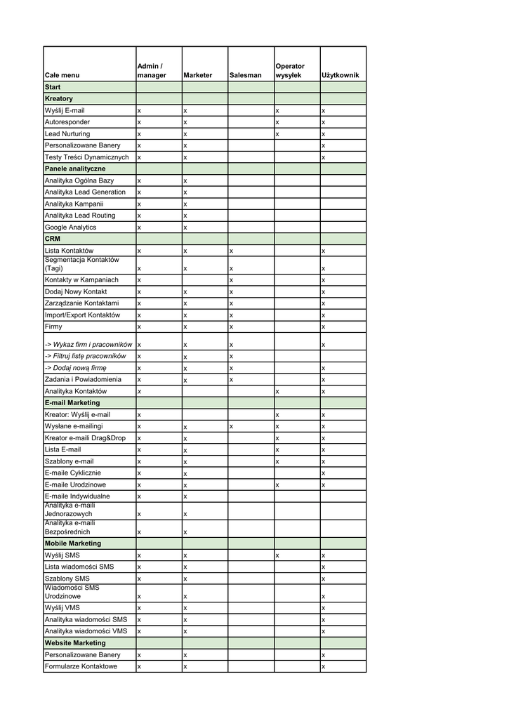 Admin / manager Marketer Operator wysyłek Użytkownik Wyślij E-mail x Autoresponder x x x x x x Lead Nurturing x x x x x Personalizowane Banery x x x Testy Treści Dynamicznych x x x Analityka Ogólna Bazy x x Analityka Lead Generation x x Analityka Kampanii x x Analityka Lead Routing x x Google Analytics x x Lista Kontaktów Segmentacja Kontaktów (Tagi) x x x x x x x x Kontakty w Kampaniach x x x Dodaj Nowy Kontakt x x x x Zarządzanie Kontaktami x x x x Import/Export Kontaktów x x x x Firmy x x x x -> Wykaz firm i pracowników x x Całe menu Salesman Start Kreatory Panele analityczne CRM x x -> Filtruj listę pracowników x x x -> Dodaj nową firmę x x x x Zadania i Powiadomienia x x x x Analityka Kontaktów x x x x x x x x E-mail Marketing Kreator: Wyślij e-mail x Wysłane e-mailingi x Kreator e-maili Drag&Drop x x x Lista E-mail x x x x Szablony e-mail x x x x E-maile Cyklicznie x x E-maile Urodzinowe x x E-maile Indywidualne Analityka e-maili Jednorazowych Analityka e-maili Bezpośrednich x x x x x x Wyślij SMS x x Lista wiadomości SMS x x x Szablony SMS Wiadomości SMS Urodzinowe x x x x x x Wyślij VMS x x x Analityka wiadomości SMS x x x Analityka wiadomości VMS x x x Personalizowane Banery x x x Formularze Kontaktowe x x x x x x x x x x Mobile Marketing Website Marketing Pop-upy x x x MicroSites x x x Landing Page x x x Kreator Landing Page x x x Zarządzanie Wydarzeniami x x x Stwórz Facebook Audience x x Facebook Landing Page x x Sieć reklamowa x x Facebook x x Google Adwords x x Kreator: Lead Nurturing x x x x Kreator: Autoresponder x x x x Dodaj Nową Regułę x Reguły Automatyzacji x x x Macierze Segmentacji x x x Reguła AdHoc x x x Analiza Transakcji x RPM (kłódka) Analityka Wiadomości z Reguł x x x x x Analityka SMS z Reguł x x x Analityka VMS z Reguł x x x Social Media Ad Remarketing Procesy Automatyzacji x Kampanie i Lejki Kampanie i Lejki E-commerce NextGen (kłódka) x x Nazwa sklepu x -> Analityka Zainteresowania Produktem x x -> E-mail Dynamiczny x x -> Ramka Rekomendacji x x Testy A/B Wiadomości x x Testy Treści Dynamicznych x x Repozytorium x x Centrum Pobierania x x Konwersje i zachowanie x x Wysłane Alerty x x Zmiany Tagów x Sprzedaż x Analiza UTM x x x Wyszukiwane frazy x x x Segmenty URL x x x Konta Wysyłkowe x x Konta Użytkowników x Konta Testujące Spam x Skrypty Dedykowane x Integracja x Aplikacje Facebook x x x Testy A/B/X x Repozytorium Raporty Ustawienia x x x x Beacons x Ogólny scoring x Słowniki x Inne x Dane konta x Zmiana hasla x Log zdarzeń x Język x x x x x x x x x x x x x ->Polski x x x x x ->Angielski x x x x x ->Niemiecki x x x x x ->Rosyjski x x x x x