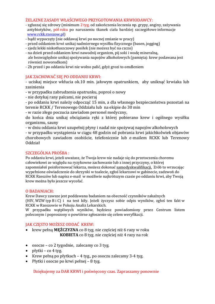 ŻELAZNE ZASADY WŁAŚCIWEGO PRZYGOTOWANIA KRWIODAWCY: - zgłaszaj się zdrowy (minimum 2 tyg. od zakończenia leczenia np. grypy, anginy, zażywania antybiotyków, pół roku po naruszeniu tkanek ciała bardziej szczegółowe informacje www.rckk.rzeszow.pl) - bądź wypoczęty (nie oddawaj krwi po nocnej zmianie w pracy) - przed oddaniem krwi unikaj nadmiernego wysiłku fizycznego (basen, jogging) - zjedz lekki niskotłuszczowy posiłek (nie możesz być na czczo) - na dzień przed oddaniem krwi nawodnij organizm, pij soki i wodę mineralną, ale bezwzględnie unikaj spożywania napojów alkoholowych (pamiętaj: krew podawana jest również noworodkom) - 2h przed i po oddaniu krwi nie wolno palić, gdyż grozi to omdleniem JAK ZACHOWAĆ SIĘ PO ODDANIU KRWI: - uciskaj miejsce wkłucia ok.10 min. jałowym opatrunkiem, aby uniknąć krwiaka lub zasinienia - w przypadku zabrudzenia opatrunku, poproś o nowy - nie dotykaj rany palcami, nie pocieraj - po oddaniu krwi należy odpocząć 15 min, a dla własnego bezpieczeństwa pozostań na terenie RCKK / Terenowego Oddziału lub na ekipie do 30 min - w razie złego poczucia zawiadom personel medyczny, do końca dnia unikaj obciążania ręki z której pobierano krew i ogólnego wysiłku organizmu, sauny - w dniu oddania krwi uzupełnij płyny i nadal nie spożywaj napojów alkoholowych - w przypadku wystąpienia w ciągu 48 godzin od pobrania krwi jakichkolwiek objawów chorobowych zawiadom osobiście, telefonicznie lub e-mailem RCKK lub Terenowy Oddział SZCZEGÓLNA PROŚBA : Po oddaniu krwi, jeżeli uważasz, że Twoja krew nie nadaje się do przetoczenia choremu człowiekowi ze względu na ryzykowne zachowanie lub z innej przyczyny, o której zapomniałeś poinformować lekarza, możesz dokonać samodyskwalifikacji, Zrób to wrzucając wypełnione oświadczenie do skrzynki w toalecie, zgłoś lekarzowi w gabinecie, zadzwoń do RCKK Rzeszów lub napisz e-mail w możliwie najkrótszym czasie po oddaniu krwi, aby Twoją krew można było jeszcze wycofać. O BADANIACH: Krew Dawcy zawsze jest poddawana badaniom na obecność czynników zakaźnych (HIV, WZW typ B i C) i na test kiły. Jeżeli życzysz sobie odpis wyników, zgłoś ten fakt w RCKK w Rzeszowie w Pokoju Analiz Lekarskich. W przypadku wątpliwych wyników, będziesz powiadomiony przez Centrum listem poleconym i poproszony o powtórne zgłoszenie się celem weryfikacji. JAK CZĘSTO MOŻESZ ODDAĆ KREW: krew pełną MĘŻCZYZNA co 8 tyg. nie częściej niż 6 razy w roku KOBIETA co 8 tyg. nie częściej niż 4 razy na rok osocze – co 2 tygodnie, zalecamy co 3 tyg. płytki – co 4 tyg. Krew pełną po płytkach – 4 tyg., po osoczu zalecamy 3-4 tyg. Płytki i osocze po krwi pełnej – 8 tyg. Dziękujemy za DAR KRWI i poświęcony czas. Zapraszamy ponownie