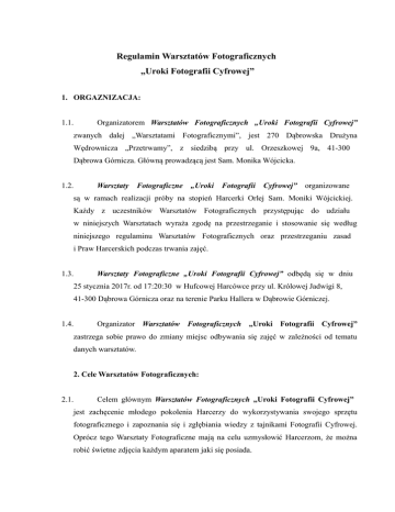 Regulamin Warsztatów Fotograficznych „Uroki Fotografii Cyfrowej” 1. ORGAZNIZACJA: 1.1. Organizatorem Warsztatów Fotograficznych „Uroki Fotografii Cyfrowej” zwanych dalej „Warsztatami Fotograficznymi”, jest 270 Dąbrowska Drużyna Wędrownicza „Przetrwamy”, z siedzibą przy ul. Orzeszkowej 9a, 41-300 Dąbrowa Górnicza. Główną prowadzącą jest Sam. Monika Wójcicka. 1.2. Warsztaty Fotograficzne „Uroki Fotografii Cyfrowej” organizowane są w ramach realizacji próby na stopień Harcerki Orlej Sam. Moniki Wójcickiej. Każdy z uczestników Warsztatów Fotograficznych przystępując do udziału w niniejszych Warsztatach wyraża zgodę na przestrzeganie i stosowanie się według niniejszego regulaminu Warsztatów Fotograficznych oraz przestrzeganiu zasad i Praw Harcerskich podczas trwania zajęć. 1.3. Warsztaty Fotograficzne „Uroki Fotografii Cyfrowej” odbędą się w dniu 25 stycznia 2017r. od 17:20:30 w Hufcowej Harcówce przy ul. Królowej Jadwigi 8, 41-300 Dąbrowa Górnicza oraz na terenie Parku Hallera w Dąbrowie Górniczej. 1.4. Organizator Warsztatów Fotograficznych „Uroki Fotografii Cyfrowej” zastrzega sobie prawo do zmiany miejsc odbywania się zajęć w zależności od tematu danych warsztatów. 2. Cele Warsztatów Fotograficznych: 2.1. Celem głównym Warsztatów Fotograficznych „Uroki Fotografii Cyfrowej” jest zachęcenie młodego pokolenia Harcerzy do wykorzystywania swojego sprzętu fotograficznego i zapoznania się i zgłębiania wiedzy z tajnikami Fotografii Cyfrowej. Oprócz tego Warsztaty Fotograficzne mają na celu uzmysłowić Harcerzom, że można robić świetne zdjęcia każdym aparatem jaki się posiada. 2.2. Harcerze po Warsztatach Fotograficznych będą: Wiedzieli czym jest Fotografia Cyfrowa oraz znali jej rodzaje. Potrafili wymienić Techniki Fotografii Cyfrowej. Znali zastosować poznaną wiedzę podczas Warsztatów Fotograficznych w praktyce. Umieli opisać budowę Aparatu Cyfrowego Kompaktowego i Lustrzanki i wskazać jakie zachodzą między nimi różnice, oprócz tego nie będą mieli problemów z doborem dla siebie odpowiedniego sprzętu fotograficznego. 3. Uczestnicy i sprzęt: 3.1. Uczestnikami Warsztatów Fotograficznych „Uroki Fotografii Cyfrowej” jest każdy Harcerz pasjonujący się fotografią. Na Warsztaty Fotograficzne mogą przyjść również osoby fizyczne nie będące związane z Harcerstwem, a chcące pogłębić swoją wiedzę fotograficzną, ponieważ są miłośnikami fotografii i lubią fotografować. 3.2. Każdy uczestnik Warsztatów Fotograficznych „Uroki Fotografii Cyfrowej” przynosi sprzęt fotograficzny taki jaki posiada u siebie w domu. Nawet są mile widziane osoby z aparatem, który mają w telefonie komórkowym. 4. Zgłoszenia: 4.1. Na Warsztaty Fotograficzne „Uroki Fotografii Cyfrowej” obowiązują zapisy poprzez wysłanie wiadomości mejlowej: Zgłaszam się do uczestniczenia w Warsztatach Fotograficznych „Uroki Fotografii Cyfrowej” (imię, nazwisko, wiek, drużyna, nazwa aparatu) na mejla: [email protected] 4.2. Na wysłanie zgłoszeń uczestnicy warsztatów fotograficznych maja czas do dnia 15 stycznia 2017 roku do godziny 20:00. Można się również zapisywać telefonicznie pod następującym numerem telefonu komórkowego: Monika Wójcicka 572 699 392 (proszę o kontakt telefoniczny od godziny 17:00). 4.3. Ilość osób: maksymalna liczba uczestników wynosi do 15 osób. 5. Opłaty: 5.1. Udział w Warsztatach Fotograficznych „Uroki Fotografii Cyfrowej” jest całkowicie bezpłatny. Organizator nie zwraca kosztów dojazdu na miejsce odbywania się warsztatów oraz nie zapewnia ubezpieczenia NNW podczas trwania zajęć. 5.2. Organizator zapewnia ciepły posiłek herbatę/kawę. 5.3. Podczas odbywania się Warsztatów będzie można zakupić świece wykonane techniką Decoupage, które przygotowali Harcerze z 270 DDW „Przetrwamy” w ramach ich akcji zarobkowej i dofinansowanie biwaku drużyny lub kupno mundurów dla nowych członków drużyny. Świece będą kosztować od 5 zł do 15 zł. 6. Wernisaż: 6.1. Podczas trwania Warsztatów Fotograficznych „Uroki Fotografii Cyfrowej” będzie można obejrzeć wernisaż Sam. Moniki Wójcickiej zatytułowany: „Wielokulturowość Lwowa”, który jest również organizowany w ramach realizacji próby na stopień Harcerski Orlej. 7. Prawa i Zasady: 7.1. Podczas trwania Warsztatów Fotograficznych „Uroki Fotografii Cyfrowej” należy przestrzegać Praw Harcerskich oraz regulaminu korzystania z z Domu Harcerza „Zielony Dworek”. 7.2. Na zajęciach obowiązuje umundurowanie harcerskie. Czuwaj Sam. Monika Wójcicka. 270 Dąbrowska Drużyna Wędrownicza „Przetrwamy”