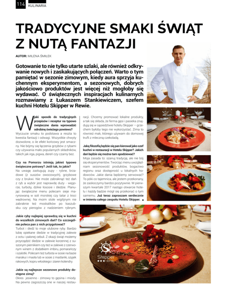 114 KULINARIA TRADYCYJNE SMAKI ŚWIĄT Z NUTĄ FANTAZJI AUTOR: MILENA ŚMIŁEK Gotowanie to nie tylko utarte szlaki, ale również odkrywanie nowych i zaskakujących połączeń. Warto o tym pamiętać w sezonie zimowym, kiedy aura sprzyja kuchennym eksperymentom, a sezonowych, dobrych jakościowo produktów jest więcej niż mogłoby się wydawać. O świątecznych inspiracjach kulinarnych rozmawiamy z Łukaszem Stankiewiczem, szefem kuchni Hotelu Skipper w Rewie. W jaki sposób do tradycyjnych przepisów i receptur na typowo świąteczne dania wprowadzić odrobinę świeżego powiewu? Wyczucie smaku to podstawa a reszta to kwestia fantazji i odwagi. Wszystkie chwyty dozwolone, o ile efekt końcowy jest smaczny. Nie bójmy się łączenia grzybów z rybami czy używania mało popularnych składników, takich jak irga, pigwa, dereń czy czarny bez. Czy na Pomorzu istnieją jakieś typowo świąteczne potrawy? Jeśli tak, to jakie? Na uwagę zasługują zupy - rybne, brzadowe (z suszów owocowych), grzybowe czy z brukwi. Nie może zabraknąć też dań z ryb a wybór jest naprawdę duży - węgorze, turboty, dzikie łososie i śledzie. Planując świąteczne menu polecam sieje marynowaną w soli morskiej czy tatar z troci wędrownej. Na moim stole wigilijnym nie zabraknie też moskalików po kaszubsku czy pierogów z nadzieniem rybnym. Jakie ryby najlepiej sprawdzą się w kuchni do wszelkich zimowych dań? Co szczególnie poleca pan z nich przygotować? Turbot i śledź to moje ulubione ryby. Bardzo lubię opiekane śledzie w tradycyjnej zalewie z octu i palonej cebuli. Z okazji świąt możemy przyrządzić śledzie w zalewie korzennej z suszonym piernikiem czy też w zalewie z czerwonym winem z dodatkiem imbiru, pomarańczy i szalotki. Polecam też turbota w sosie na bazie marakui i masła lub w sosie z maślanki, szyjek rakowych, kopru włoskiego i ziaren kolendry. Jakie są najlepsze sezonowe produkty dostępne zimą? Okres jesienno - zimowy to gęsina i miody. Na pewno zagoszczą one w naszej restau- racji. Chcemy promować lokalne produkty, a tak się składa, że ferma gęsi i pasieka znajdują się w sąsiedztwie hotelu Skipper – grzechem byłoby tego nie wykorzystać. Zima to również mak, którego używam do domowej trufli z mleczną czekoladą. Jaką filozofią będzie się pan kierował jako szef kuchni w restauracji w Hotelu Skipper? Jakich dań będzie się można tam spodziewać? Moja zasada to: szanuj tradycję, ale nie bój się eksperymentów. Tworząc menu uwzględniam sezonowość produktów, bogactwo regionu oraz dostępność u lokalnych hodowców. Jakie dania będziemy serwować? To póki co tajemnica, ale jestem przekonany, że zaskoczymy bardzo pozytywnie. W pierwszym kwartale 2017 nastąpi otwarcie hotelu i każdy będzie mógł się przekonać o tym samemu. Już teraz zapraszam serdecznie w imieniu całego zespołu Hotelu Skipper.