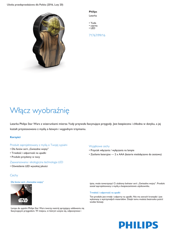 Ulotka przedsprzedażowa dla Polska (2016, Luty 20) Philips Latarka • Yoda • czarna • LED 71767/99/16 Włącz wyobraźnię Latarka Philips Star Wars z wizerunkami mistrza Yody przywoła fascynujące przygody. Jest bezpieczna i chłodna w dotyku, a jej kształt przystosowano z myślą o łatwym i wygodnym trzymaniu. Korzyści Produkt zaprojektowany z myślą o Twojej sypialni • Dla fanów serii „Gwiezdne wojny” • Trwałość i odporność na upadki • Produkt przydatny w nocy Wyjątkowe cechy • Przycisk włączania / wyłączania na lampie • Zasilanie bateryjne — 2 x AAA (baterie niedołączone do zestawu) Zaawansowana i ekologiczna technologia LED • Oświetlenie LED wysokiej jakości Cechy Dla fanów serii „Gwiezdne wojny” śpisz, może towarzyszyć Ci ulubiony bohater serii „Gwiezdne wojny”. Produkt został zaprojektowany z myślą o bezpieczeństwie użytkownika. Trwałość i odporność na upadki Ten produkt jest trwały i odporny na upadki. Nie ma ostrych krawędzi i jest wykonany z wytrzymałych materiałów. Dzięki temu możesz beztrosko puścić wodze fantazji. Lampa do sypialni Philips Star Wars tworzy nastrój sprzyjający oddawaniu się fascynującym przygodom. W miejscu, w którym uczysz się, odpoczywasz i Nocny kompan dla dziecka Przycisk włączania / wyłączania na lampie Latarka Philips Star Wars rozświetla ciemności podczas pełnej przygód nocnej wyprawy do łazienki lub innego miejsca w domu. Ma atrakcyjny kształt przystosowany do łatwego i wygodnego trzymania. Dyskretnie umieszczony na oprawie przycisk umożliwia łatwe włączanie i wyłączanie światła. Oświetlenie LED wysokiej jakości Technologia LED zastosowana w tej lampie firmy Philips to wyjątkowe rozwiązanie opracowane przez firmę Philips. Natychmiast się włącza, pozwala na uzyskanie optymalnej wydajności oświetlenia oraz podkreśla i ożywia kolory w Twoim domu. Zasilanie bateryjne — 2 x AAA Ta lampa jest zasilana 2 bateriami AAA. Odpowiednie są wszystkie baterie w tym rozmiarze, jednak nie należy używać jednocześnie różnych typów baterii. Baterie nie są dołączone do zestawu. Specyfikacje Prosimy pamiętać, że jest to ulotka przedsprzedażowa. Treść ulotki jest zgodna z naszą najlepszą wiedzą w momencie publikacji i w odniesieniu do danego kraju (podane powyżej). Treść ulotki może ulec zmianie bez powiadomienia. Firma Philips nie ponosi odpowiedzialności za treść ulotki. Stylistyka i wykończenie Materiał Kolor syntetyk czarny Dodatkowe funkcje/akcesoria w zestawie Przycisk włączania / wyłączania na lampie Wbudowane diody LED Precyzyjne wiązki światła Możliwość przenoszenia TAK TAK TAK Nie TAK IP20 ochrona przed przedmiotami powyżej 12,5 mm brak ochrony przed wodą III — bezpieczne, bardzo niskie napięcie Serwis Gwarancja 2 lata Wymiary i waga opakowania 9,2 cm 5,5 cm 2,8 cm 0,036 kg Dane techniczne Zasilanie sieciowe Liczba źródeł światła Moc źródła światła w zestawie Łączna moc strumienia świetlnego oprawy w lumenach Klasa ochronności TAK Wymiary i waga produktu Wysokość Długość Szerokość Waga netto Oprawa z możliwością przyciemniania LED Współczynnik IP Wysokość Długość Szerokość Waga 3,5 cm 15 cm 18 cm 0,079 kg Różne 3V 1 0,3 W 5 lm Opracowano z myślą o Styl Typ Pokój dziecka Salon i sypialnia Pełen ekspresji Latarka Dane wkrótce ulegną zmianie 2016, Luty 20 Dane wkrótce ulegną zmianie 2016, Luty 20 Version: 1.0.1 EAN: 8718696130674 © 2016 Koninklijke Philips Electronics N.V. Wszelkie prawa zastrzeżone Dane mogą ulec zmianie bez uprzedniego powiadomienia. Znak towarowy jest własnością Koninklijke Philips Electronics N.V. lub odpowiednich podmiotów . www.philips.com
