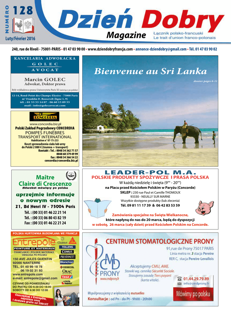 128 Luty/Février 2016 Magazine 240, rue de Rivoli - 75001-PARIS • 01 47 03 90 00 • www.dziendobryfrancja.com • [email protected] • Tél. 01 47 03 90 02 KANCEL ARIA ADWOKAC K A G O L E C AVOCAT Marcin GOLEC Bienvenue au Sri Lanka dossier pages 6-11 Adwokat, Doktor prawa Były wykładowca prawa Uniwersytetu Paris XI (mówiący po polsku) 12-14, Rond-Point des Champs-Elysées - 75008 Paris m° Franklin D. Roosevelt (ligne 1, 9) tél. : 01 53 53 14 07 - 06 60 15 09 55 mail : [email protected] www.concordia.biz.pl Polski Zakład Pogrzebowy CONCORDIA POMPES FUNÈBRES TRANSPORT INTERNATIONAL Habilitation n° 07-75-233 Koszt sprowadzenia ciała lub urny do Polski 2 080 € (trumna + transport) Kontakt : Tel. : 0048 34 362 71 57 0048 60 379 49 99 fax : 0048 34 366 54 22 [email protected] Maître Claire di Crescenzo Adwokat mówiàcy po polsku uprzejmie informuje o nowym adresie LEADER-POL M.A. POLSKIE PRODUKTY SPOŻYWCZE I PRASA POLSKA W każdą niedzielę i święta (9°° - 20°°) na Placu przed Kościołem Polskim w Paryżu (Concorde) SKLEP : 230 rue Paul et Camille THOMOUX 93330 - NEUILLY SUR MARNE Wszytkie dostępne produkty (lub zlecenia) 21, Bd Henri IV - 75004 Paris Tél. 09 81 11 17 39 & 06 42 83 53 59 Tél. : (00 33) 01 46 22 21 14 Tél. : (00 33) 06 80 43 82 19 Fax : (00 33) 01 46 22 21 24 Zamówienia specjalne na Święta Wielkanocne, które napłyną do nas do 20 marca, będą do dyspozycji w sobotę, 26 marca (cały dzień) przed Kościołem Polskim na Concorde. Polska, Polska... cała Polska ! Dzięki A.F.P.E. Dzień Dobry - najlepsze linie lotnicze biorą Was pod swoje skrzydła ! VOLS LOTY Lundi (1) Mardi (2) Mercredi (3) PoniedzialekWtorek Sroda Jeudi (4) Vendredi (5) Samedi (6) Dimanche (7) Czwartek Piatek Sobota Niedziela Warszawa - Beauvais06:20-08:4506:20-08:4506:20-08:45 Beauvais - Warszawa09:15-11:3009:15-11:3009:15-11:30 Warszawa - Beauvais 13:00-15:3013:00-15:3013:00-15:3013:00-15:3013:00-15:3013:00-15:3013:00-15:30 Beauvais - Warszawa 15:55-18:1015:55-18:1015:55-18:1015:55-18:1015:55-18:1015:55-18:1015:55-18:10 Krakow - Beauvais 06:40-08:4506:40-08:4506:40-08:4506:40-08:45 Beauvais - Krakow 09:20-11:3009:20-11:3009:20-11:3009:20-11:30 Paris CDG - Krakow 07:25-11:4007:25-11:4007:25-11:4007:25-11:4007:25-11:4011:20-13:4513:45-16:00 Krakow - Paris CDG 10:10-12:3010:10-12:3010:10-12:3010:10-12:3010:10-12:3013:55-16:1516:30-18:50 Gdansk - Beauvais 10:15-12:30 10:15-12:30 Beauvais - Gdansk 13:00-15:00 13:00-15:00 Poznan - Beauvais 14:00-16:00 14:00-16:00 Beauvais - Poznan 16:30-18:25 16:30-18:25 Katowice - Beauvais 11:35-13:45 11:35-13:45 Beauvais - Katowice 20:15-22:20 18:55-21:00 Wroclaw - Beauvais 18:55-21:0018:55-21:0018:55-21:0018:55-21:00 Beauvais - Wroclaw 21:25-23:2021:25-23:2021:25-23:2021:25-23:20 Wroclaw - Beauvais 19:30-21:15 19:30-21:15 Beauvais - Wroclaw 21:55-23:4521:25-23:45 Paris CDG - Warszawa Paris CDG - Warszawa Paris CDG - Warszawa Paris CDG - Warszawa Paris CDG - Warszawa Paris CDG - Warszawa Warszawa - Paris CDG Warszawa - Paris CDG Warszawa - Paris CDG Warszawa - Paris CDG Warszawa - Paris CDG Warszawa - Paris CDG 07:30 - 09:45 09:40 - 11:50 10:50 - 13:00 16:00 - 18:10 19:25 - 21:35 19:30 - 21:45 06:40 - 09:10 07:35 - 10:05 12:45 - 15:10 16:20 - 18:45 19:05 - 21:30 19:50 - 22:15 tous les jours tous les jours tous les jours tous les jours tous les jours tous les jours tous les jours tous les jours tous les jours tous les jours tous les jours tous les jours BUS Paris Porte-Maillot >>>Beauvais-Airport durée 1h15 (17 €) Départ impératif de Porte Maillot 3 h 15 avant l'heure de décollage à Beauvais BUS AIR FRANCE Paris Porte-Maillot >>>Roissy CDG durée 40 min. (17 €) BUS RATP RoissyBus (Opéra-Rue Scribe >>> Roissy CDG durée 50 min. € 10.50 (*) RER B Chatelet >>>Roissy CDG durée : 30 minutes (9,75 € *) (*) Forfait 5 zones navigo accepté. CZUJNOŚĆ ! PASAŻEROWIE LECĄCY DO POLSKI Z BEAUVAIS Wielu podróżnych poinformowało nas o KIESZONKOWCACH w autokarze na trasie Paris Porte Maillot i Beauvais Airport jak również w czasie rejestracji bagażu na lotnisku. Do tego, na parkingu dochodzą częste przypadki wandalizowania, a nawet kradzieży. Dyrekcja parkingu lotniska, która nie ma nawet kontrolnych kamer wideo (choć pobiera pieniądze za parkowanie) nie chce ponosić odpowiedzialności za uszkodzone pojazdy ! Zaleca się podróżnym i kierowcom jak najdalej posuniętą czujność. Przekażcie znajomym adres portalu : www.dziendobryfrancja.eu Validité des horaires : 25 octobre 2015 au 27 mars 2016 Polska na wyciągnięcie ręki ! Tanie przeloty do Polski w Biurze A.F.P.E. 240, rue de Rivoli - 75001 Paris Tel. : 01 47 03 90 01 Biuro czynne codziennie od 10:00 do 18:00 (w soboty 10:00 - 12:00) Kupując bilet wcześniej oszczędzasz ! PŁACĄC KARTĄ KREDYTOWĄ OTRZYMASZ BILET TEGO SAMEGO DNIA za pośrednictwem e-mail, faksu lub pocztą nazajutrz. 2 Dzień Dobry dziendobry.fr Moi, j'y vais Vos Loisirs & divertissements aux prix promotionnels (exclusivement) dans le Bureau de DZIEN DOBRY Bâteaux Parisiens La Tour Montparnasse 8€ 10 € 17 € zamiast 23,5 € (dorosły) 20,5 € (dziecko) DISNEYLAND Paris cena stała 50 Musée Grevin € (zamiast 76 €) Pour ceux qui savent compter ou comment passer à un prix exceptionnel un jour de divertissement, le jour de votre choix sans retriction, ni jour imposé à Disneyland Avec l'Oncle Picsou on y gagne à tous les coups ! Comment se rendre à Disneyland ? 1 Park (do wyboru : Studio lub Park Disney) - bez restrykcji (wejście zarówno w dni powszednie jak i niedzielę i święta) - bilety bezdatowe - brak zniżek dla dzieci RER : Ligne A (Direct de Charles de Gaule Etoile - Auber - Châtelet les Halles - Gare de Lyon - Vincennes. Terminus : Marne La Vallée/Chessy ROUTE : Sortie boulevard périphérique : Porte de Bercy, prendre autoroute A4 direction Metz-Nancy, , prendre sortie n° 14, puis suivre les indications (39 km du bld périphérique Paris) AQUABOULEVARD Le plus grand Pa