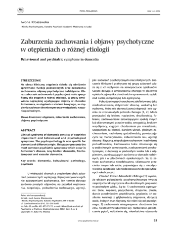 PRACA POGLĄDOWA ISSN 1643–0956 Iwona Kłoszewska I Klinika Psychiatryczna, Katedra Psychiatrii Akademii Medycznej w Łodzi Zaburzenia zachowania i objawy psychotyczne w otępieniach o różnej etiologii Behavioural and psychiatric symptoms in dementia STRESZCZENIE Na obraz kliniczny otępienia składa się obniżenie sprawności funkcji poznawczych oraz zaburzenia zachowania, objawy psychotyczne i afektywne. Obraz zaburzeń zachowania i psychoz jest mało specyficzny dla otępień o różnej etiologii. W pracy omówiono najczęściej występujące objawy w chorobie Alzheimera, w otępieniu z ciałami Lewy’ego, w otępieniu czołowo-skroniowym oraz w otępieniu naczyniopochodnym. Słowa kluczowe: otępienie, zaburzenia zachowania, objawy psychotyczne ABSTRACT Clinical syndrome of dementia consists of cognitive impairment and behavioural and psychological symptoms. The psychopathology is non specific for dementia of different origin. This paper presents the most common psychiatric symptoms which occur in Alzheimer’s disease, Levy bodies’ dementia, frontotemporal and vascular dementia. Key words: dementia, behavioural pathology, psychosis U większości chorych z otępieniem obok zaburzeń poznawczych występują objawy nazywane ogólnie zaburzeniami zachowania. Ten termin dotyczy zarówno prostych objawów, na przykład wędrowania, niepokoju, pobudzenia ruchowego, agresji, Adres do korespondencji: dr hab. med. Iwona Kłoszewska I Klinika Psychiatryczna Katedra Psychiatrii AM w Łodzi ul. Czechosłowacka 8/10, 92–216 Łódź tel./faks (0 prefiks 42) 675 73 72, e-mail: [email protected] Psychiatria w Praktyce Ogólnolekarskiej 2002, tom 2, nr 2 Copyright © 2002 Via Medica jak i zaburzeń psychotycznych oraz afektywnych. Znaczenie kliniczne i praktyczne tej grupy zaburzeń wiąże się z ich wpływem na samopoczucie opiekunów. Często decyzja o umieszczeniu chorego w placówce opiekuńczej wynika z trudności w sprawowaniu opieki nad osobą niespokojną lub agresywną. Pobudzenie psychoruchowe zdefiniowano jako niedostosowaną aktywność słowną, wokalną lub ruchową, która nie stanowi jasnej ekspresji i nie wynika ze zrozumiałych potrzeb chorego [1, 2]. Może przejawiać się lękiem, napięciem, drażliwością, fobiami, zachowaniami zaburzającymi spokój innych lub skierowanymi przeciw sobie, wrogością, brakiem współpracy, ciągłym chodzeniem po mieszkaniu, szarpaniem za klamki, darciem ubrań, głośnym zachowaniem, nadmierną gadatliwością, powtarzającymi się manieryzmami, zaburzeniami snu, agresją słowną i fizyczną, niepokojem ruchowym i nadmierną pobudliwością. Zachowania takie obserwuje się u osób chorych somatycznie, z zaburzeniami psychotycznymi, z depresją w podeszłym wieku lub z otępieniem, przebywających zarówno w domach rodzinnych, jak i w placówkach opiekuńczych. Są to zawsze zachowania nieadekwatne, skierowane przeciwko innym lub sobie, pojawiające się z nieodpowiednią częstością lub niedostosowane do specyficznych okoliczności. Z badań Cohen-Mansfield i Billinga [1] wynika, że objawy pobudzenia psychoruchowego tworzą zespoły charakterystyczne dla określonych grup osób w podeszłym wieku. Są to: 1) zachowania agresywne: bicie, kopanie, popychanie, drapanie, plucie, darcie przedmiotów, przeklinanie, gryzienie; ich nasilenie koreluje z głębokością otępienia, dotyczą osób, których stan fizyczny nie różni się od przeciętnego; 2) zachowania nieagresywne: chodzenie bez celu, niestosowne ubieranie się i rozbieranie, powtarzanie pytań, oddalanie się, niewłaściwe używanie www.psychiatria.med.pl 93 Psychiatria w Praktyce Ogólnolekarskiej 2002, tom 2, nr 2 przedmiotów, ogólne niespokojne zachowanie; występują głównie u chorych otępiałych, których stan somatyczny jest lepszy od przeciętnego; 3) pobudzenie słowne: zgłaszanie skarg, ciągłe zwracanie na siebie uwagi, negatywizm słowny, powtarzanie pytań, krzyk; występują u chorych somatycznie, cierpiących na dolegliwości bólowe. Zrozumienie tych zachowań, ich dokładna analiza powinny skłonić lekarza do podjęcia szybkiej interwencji. Staranne zbadanie chorego umożliwi ustalenie przyczyny i zastosowanie odpowiedniej terapii farmakologicznej, zaś w przypadku zachowań nieszkodliwych spowoduje odstąpienie od niepotrzebnego leczenia. Zachowania nieagresywne, pomimo że niedostosowane, mogą służyć choremu w podtrzymaniu aktywności fizycznej [1, 3, 4]. Zadaniem opiekuna jest stworzenie odpowiednich, a więc bezpiecznych warunków dla ich realizacji bądź też modyfikacja tych zachowań, na przykład zaproponowanie zabawy klockami lub innymi niegroźnymi przedmiotami zamiast zabawy niebezpiecznymi lub kosztownymi przedmiotami. Istniejące wcześniej systemy i kryteria diagnostyczne otępienia nie uwzględniały obecności w jego przebiegu zaburzeń zachowania i objawów psychotycznych. Dziesiąta Rewizja Międzynarodowej Statystycznej Klasyfikacji Chorób i Problemów Zdrowotnych (ICD-10) [5] wprowadziła dodatkowe podkategorie odnotowywane za pomocą piątego znaku dla otępień, którym towarzyszą objawy depresji, urojenia lub omamy. Natomiast zespół ekspertów Międzynarodowego Towarzystwa Psychogeriatrycznego zaproponował wprowadzenie terminu „przedmiotowe i podmiotowe zaburzenia zachowania i objawy psychopatologiczne” (BPSSD, behavioral and psychological signs and symptoms of dementia) dla określenia wszelkich objawów niebędących sensu stricto zaburzeniami funkcji poznawczych [6]. Choroba Alzheimera Najdokładniej poznano i opisano zaburzenia zachowania w przebiegu choroby Alzheimera (AD, Alzheimer’s disease), która jest najczęstszą przyczyną otępienia. Zaburzenia funkcji poznawczych postępują w typowy dla tej choroby sposób, który pozwala na dość dokładne określenie tego, co się będzie działo z chorym w czasie kolejnych stadiów otępienia. Natomiast BPSSD występują w sposób mniej uporządkowany i 