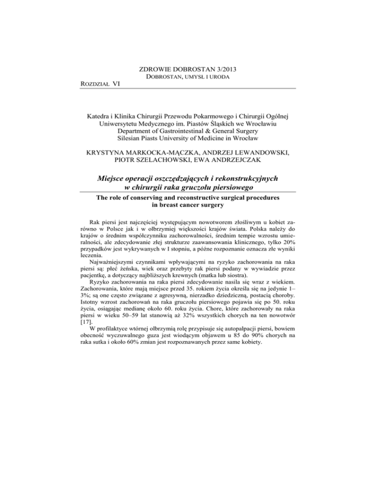 ZDROWIE DOBROSTAN 3/2013 DOBROSTAN, UMYSŁ I URODA ROZDZIAŁ VI Katedra i Klinika Chirurgii Przewodu Pokarmowego i Chirurgii Ogólnej Uniwersytetu Medycznego im. Piastów Śląskich we Wrocławiu Department of Gastrointestinal & General Surgery Silesian Piasts University of Medicine in Wrocław KRYSTYNA MARKOCKA-MĄCZKA, ANDRZEJ LEWANDOWSKI, PIOTR SZELACHOWSKI, EWA ANDRZEJCZAK Miejsce operacji oszczędzających i rekonstrukcyjnych w chirurgii raka gruczołu piersiowego The role of conserving and reconstructive surgical procedures in breast cancer surgery Rak piersi jest najczęściej występującym nowotworem złośliwym u kobiet zarówno w Polsce jak i w olbrzymiej większości krajów świata. Polska należy do krajów o średnim współczynniku zachorowalności, średnim tempie wzrostu umieralności, ale zdecydowanie złej strukturze zaawansowania klinicznego, tylko 20% przypadków jest wykrywanych w I stopniu, a późne rozpoznanie oznacza złe wyniki leczenia. Najważniejszymi czynnikami wpływającymi na ryzyko zachorowania na raka piersi są: płeć żeńska, wiek oraz przebyty rak piersi podany w wywiadzie przez pacjentkę, a dotyczący najbliższych krewnych (matka lub siostra). Ryzyko zachorowania na raka piersi zdecydowanie nasila się wraz z wiekiem. Zachorowania, które mają miejsce przed 35. rokiem życia określa się na jedynie 1– 3%; są one często związane z agresywną, nierzadko dziedziczną, postacią choroby. Istotny wzrost zachorowań na raka gruczołu piersiowego pojawia się po 50. roku życia, osiągając medianę około 60. roku życia. Chore, które zachorowały na raka piersi w wieku 50–59 lat stanowią aż 32% wszystkich chorych na ten nowotwór [17]. W profilaktyce wtórnej olbrzymią rolę przypisuje się autopalpacji piersi, bowiem obecność wyczuwalnego guza jest wiodącym objawem u 85 do 90% chorych na raka sutka i około 60% zmian jest rozpoznawanych przez same kobiety. ZDROWIE I DOBROSTAN NR 3/2013 Dobrostan, umysł i uroda Podstawę diagnostyki oprócz badania fizykalnego, stanowi mammografia i ultrasonografia. U kobiet do 40. roku życia badanie ultrasonograficzne może być samodzielną metodą diagnostyczną, chociaż mammografia nie jest przeciwwskazana, ale jest metodą często nieskuteczną z powodu gęstej gruczołowej budowy piersi. Przy pomocy ultrasonografii można przeprowadzić biopsję aspiracyjną cienkoigłową, gruboigłową i mammotomiczną. Ultrasonografia pozwala również na dokładną lokalizację pola operacyjnego małych zmian przed planowanym zabiegiem operacyjnym [21]. Mammografia jest jednak wciąż podstawową techniką obrazowania gruczołów piersiowych. Badanie to pozwala wykryć wczesne postacie raka gruczołu piersiowego [10]. W ostatnich latach wzrosło znaczenie rezonansu magnetycznego (MR) w diagnostyce raka piersi. Głównymi wskazaniami do wykonania klinicznej mammografii MR jest przedoperacyjne określenie stopnia zaawansowania raka piersi, zwłaszcza wykluczenie wieloogniskowej postaci raka lub ogniska w drugiej piersi. Możliwe jest również różnicowanie zmian pooperacyjnych i po radioterapii oraz poszukiwanie wznowy procesu nowotworowego po uprzednim leczeniu [22]. W związku z burzliwym rozwojem technik obrazowania zmian w gruczole mlecznym zmieniła się rola patologa w diagnostyce tego narządu. Nie samo rozpoznanie raka jest dzisiaj podstawowym zadaniem patologa, a większości przypadków – potwierdzenie tego rozpoznania postawionego na podstawie mammografii i ultrasonografii. Oczekiwania onkologów, to nie tylko ocena morfologicznych czynników prognostycznych i predykcyjnych, czyli odpowiedź na pytania o rokowanie i reakcję na zastosowane leczenie, ale także często o sposób leczenia, tj. czy możliwe jest leczenie celowane. Raki nienaciekające stanowią około 15% wszystkich rozpoznanych nowotworów tego gruczołu – jest to rak wewnątrzprzewodowy i wewnątrzzrazikowy. Rozpoznawane typy histologiczne raków naciekających to: przewodowy, zrazikowy, galaretowaty, rdzeniasty, brodawkowaty, cewkowaty, gruczołowo-torbielowaty, apokrynalny i rak z metaplazją [11]. Zasadniczym kryterium prognostycznym w raku piersi jest zaawansowanie według klasyfikacji TNM. Najsilniejszym czynnikiem rokowniczym jest stan regionalnych węzłów chłonnych. Wielkość guza jest ściśle związana z prawdopodobieństwem wystąpienia wznowy i obecnością przerzutów do węzłów chłonnych. Cechą korzystną rokowniczo jest obecność receptorów estrogenowych i progesteronowych [1]. Do innych czynników należy typ histologiczny oraz stopień złośliwości według skali Richardsona-Blooma [9]. Leczenie raka piersi polega na chirurgicznym usunięciu zmiany, radioterapii, chemioterapii lub hormonoterapii. Sposób leczenia ustala sie na podstawie wyniku badania histopatologicznego i stadium klinicznego zaawansowania choroby [6]. Celem pracy jest pokazanie wpływu przebytego wycięcia piersi na funkcjonowanie kobiety w relacji partnerskiej w kontekście dyskusji, co do wyboru metody leczenia operacyjnego z powodu raka tego gruczołu. 104 Krystyna Markocka-Mączka, Andrzej Lewandowski, Piotr Szelachowski, Ewa Andrzejczak Miejsce operacji oszczędzających i rekonstrukcyjnych w chirurgii raka gruczołu piersiowego MATERIAŁ I METODY BADAWCZE Grupę badaną stanowiło 60 kobiet po wycięciu piersi z powodu raka bez następowych zabiegów odtwórczych zgłaszających się celem badań kontrolnych do Poradni Rehabilitacyjnej Świętokrzyskiego Centrum Onkologii w Kielcach. Badanie przeprowadzono metodą ankietową stosując Kwestionariusz Szczęścia Małżeńskiego wg Kazimierza Pospiszyla [18] w modyfikacji własnej. Każda badana wyrażała pisemnie zgodę na udział w badaniu, a ankieta była anonimowa. Pytania miały charakter zamknięty. Do badanej grupy włączono wyłącznie kobiety zamężne lub żyjące w heteroseksualnych związkach partnerskich, a czas trwania związku obejmował okres przed rozpozna