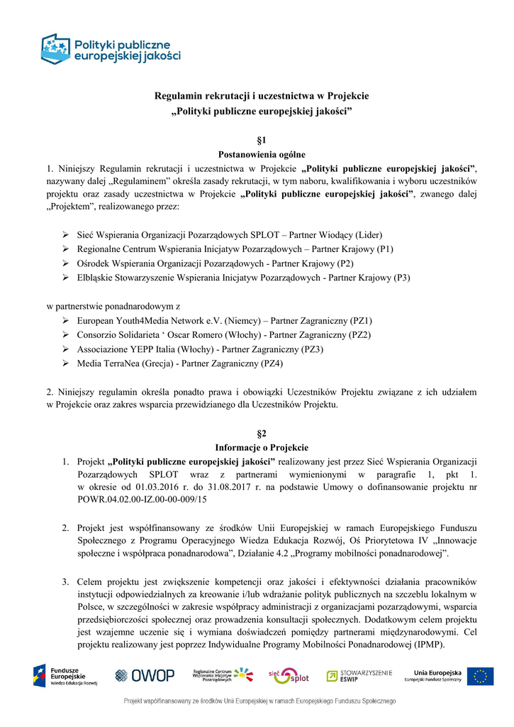 Regulamin rekrutacji i uczestnictwa w Projekcie „Polityki publiczne europejskiej jakości” §1 Postanowienia ogólne 1. Niniejszy Regulamin rekrutacji i uczestnictwa w Projekcie „Polityki publiczne europejskiej jakości”, nazywany dalej „Regulaminem” określa zasady rekrutacji, w tym naboru, kwalifikowania i wyboru uczestników projektu oraz zasady uczestnictwa w Projekcie „Polityki publiczne europejskiej jakości”, zwanego dalej „Projektem”, realizowanego przez: Sieć Wspierania Organizacji Pozarządowych SPLOT – Partner Wiodący (Lider) Regionalne Centrum Wspierania Inicjatyw Pozarządowych – Partner Krajowy (P1) Ośrodek Wspierania Organizacji Pozarządowych - Partner Krajowy (P2) Elbląskie Stowarzyszenie Wspierania Inicjatyw Pozarządowych - Partner Krajowy (P3) w partnerstwie ponadnarodowym z European Youth4Media Network e.V. (Niemcy) – Partner Zagraniczny (PZ1) Consorzio Solidarieta ‘ Oscar Romero (Włochy) - Partner Zagraniczny (PZ2) Associazione YEPP Italia (Włochy) - Partner Zagraniczny (PZ3) Media TerraNea (Grecja) - Partner Zagraniczny (PZ4) 2. Niniejszy regulamin określa ponadto prawa i obowiązki Uczestników Projektu związane z ich udziałem w Projekcie oraz zakres wsparcia przewidzianego dla Uczestników Projektu. §2 Informacje o Projekcie 1. Projekt „Polityki publiczne europejskiej jakości” realizowany jest przez Sieć Wspierania Organizacji Pozarządowych SPLOT wraz z partnerami wymienionymi w paragrafie 1, pkt 1. w okresie od 01.03.2016 r. do 31.08.2017 r. na podstawie Umowy o dofinansowanie projektu nr POWR.04.02.00-IZ.00-00-009/15 2. Projekt jest współfinansowany ze środków Unii Europejskiej w ramach Europejskiego Funduszu Społecznego z Programu Operacyjnego Wiedza Edukacja Rozwój, Oś Priorytetowa IV „Innowacje społeczne i współpraca ponadnarodowa”, Działanie 4.2 „Programy mobilności ponadnarodowej”. 3. Celem projektu jest zwiększenie kompetencji oraz jakości i efektywności działania pracowników instytucji odpowiedzialnych za kreowanie i/lub wdrażanie polityk publicznych na szczeblu lokalnym w Polsce, w szczególności w zakresie współpracy administracji z organizacjami pozarządowymi, wsparcia przedsiębiorczości społecznej oraz prowadzenia konsultacji społecznych. Dodatkowym celem projektu jest wzajemne uczenie się i wymiana doświadczeń pomiędzy partnerami międzynarodowymi. Cel projektu realizowany jest poprzez Indywidualne Programy Mobilności Ponadnarodowej (IPMP). 4. Projekt zakłada udział 560 Uczestników Projektu przedstawicieli trzech rodzajów instytucji z terenu całej Rzeczpospolitej Polskiej : a) organizacji pozarządowych (pracownik, Członek, Wolontariusz)– 248 uczestników b) jednostek samorządu terytorialnego lub ich jednostek organizacyjnych lub komunalnych osób prawnych (pracownik) – 248 uczestników c) organizacji pracodawców/ związków zawodowych (pracownik, Członek) – 64 uczestników 5. Rekrutacja w poszczególnych województwach prowadzona jest poprzez biura partnerów regionalnych: Biuro Regionalne nr 1 - Biuro Sieci SPLOT prowadzi rekrutację uczestników projektu z obszaru województw: łódzkie, mazowieckie, wielkopolskie, podkarpackie; Biuro Regionalne nr 2 Ośrodek Wspierania Organizacji Pozarządowych z siedzibą w Białymstoku prowadzi rekrutację uczestników projektu z obszaru województw: lubelskie, podlaskie, świętokrzyskie, małopolskie; Biuro Regionalne nr 3 Elbląskie Stowarzyszenie Wspierania Inicjatyw Pozarządowych prowadzi rekrutację uczestników projektu z obszaru województw: warmińsko – mazurskie, pomorskie, zachodniopomorskie i kujawsko-pomorskie; Biuro Regionalne nr 4 Regionalne Centrum Wspierania Inicjatyw Pozarządowych z siedzibą we Wrocławiu prowadzi rekrutację uczestników projektu z obszaru województw: dolnośląskie, lubuskie, opolskie, śląskie; §3 Warunki uczestnictwa w Projekcie 1. Uczestnik Projektu musi spełniać łącznie następujące kryteria obowiązkowe (formalne) rekrutacji zgodnie z wnioskiem o dofinansowanie projektu: 1.1. zajmuje się w praktyce wdrażaniem lub kreowaniem polityk publicznych głównie w zakresie współpracy administracji publicznej z organizacjami pozarządowymi (NGO) wsparciem przedsiębiorczości społecznej lub prowadzeniem konsultacji społecznych, 1.2. jest osobą zatrudnioną lub formalnie związaną z podmiotem (NGO, administracja publiczna, związki zawodowe, organizacje pracodawców) aktywnym w obszarze wdrażania lub kreowania polityk publicznych, tj. realizuje zadania publiczne lub jest w stanie wykazać aktywne zaangażowanie w działania na rzecz wdrażania/kreowania/doskonalenia obszaru polityk publicznych będącego przedmiotem wyjazdu zagranicznego, 1.3. zna język angielski lub inny akceptowalny w Instytucji Przyjmującej przynajmniej na poziomie B2, 1.4. posiada zgodę kierownika Instytucji Wysyłającej na wyjazd, 1.5. przedstawi pisemne zobowiązanie do niezrezygnowania z zatrudnienia/związania z Instytucją Wysyłającą przez przynajmniej 1 rok od momentu powrotu z mobilności. §4 Zasady rekrutacji 1. Rekrutacja prowadzona jest w 4 biurach regionalnych wskazanych w §2 pkt. 5 2. Etapy rekrutacji: 2.1. akcja informacyjna - udostępnienie zainteresowanym podmiotom dokumentacji tj. regulaminu rekrutacji, formularzy zgłoszeniowych, informacji o projekcie; 2.2. złożenie dokumentów - złożenie w wyznaczonym terminie osobiście lub listownie (liczy się data wpływu formularza rekrutacyjnego) formularzy rekrutacyjnych do właściwego biura partnera regionalnego Projektu; 2.3. ocena formalna i merytoryczna (w tym kryteria premiujące) złożonych formularzy rekrutacyjnych pod kątem formalnym i merytorycznym, sprawdzenie przyznanych punktów; 2.4. stworzenie listy uczestników zakwalifikowanych i listy rezerwowej. 3. Formularz rekrutacyjny należy złożyć wyłącznie w terminie rekrutacji zgodnym z Harmonogramem rekrutacji dostępnym na stronach Partnerów. 4. For