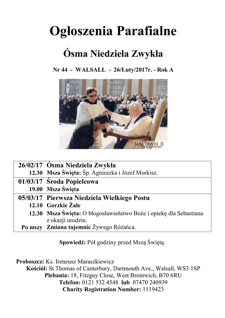 Ogłoszenia Parafialne Ósma Niedziela Zwykła Nr 44 - WALSALL - 26/Luty/2017r. - Rok A 26/02/17 Ósma Niedziela Zwykła 12.30 Msza Święta: Śp. Agnieszka i Józef Morkisz. 01/03/17 Środa Popielcowa 19.00 Msza Święta 05/03/17 Pierwsza Niedziela Wielkiego Postu 12.10 Gorzkie Żale 12.30 Msza Święta: O błogosławieństwo Boże i opiekę dla Sebastiana z okazji urodzin. Po mszy Zmiana tajemnic Żywego Różańca. Spowiedź: Pόł godziny przed Mszą Świętą. Proboszcz: Ks. Ireneusz Maraszkiewicz Kościόł: St Thomas of Canterbury, Dartmouth Ave., Walsall, WS3 1SP Plebania: 18, Fitzguy Close, West Bromwich, B70 6RU Telefon: 0121 532 4548 lub 07470 240939 Charity Registration Number: 1119423 Dzisiejsze Czytania: Pierwsze Czytanie - Iz 49,14-15;; Psalm Responsoryjny - Ps 62,2-3.6-9; Drugie Czytanie - 1 Kor 4,1-5; Śpiew przed Ewangelią - Mt 6,33; Ewangelia - Mt 6,24-34 -------------------------------------------------------------------Środa Popielcowa: W środę Popielec i rozpoczęcie Wielkiego Postu. Msze św. z obrzędem posypania głów popiołem w West Bromwich o godz.16.30, a w Walsall o godz.19.00. W Środę Popielcową obowiązuje tzw. post ścisły – powstrzymanie się od pokarmów mięsnych [od 14 roku życia ], jeden posiłek do syta i dwa niepełne [od 18 roku życia do końca]. Post nie obowiązuje ludzi chorych. -------------------------------------------------------------------Gorzkie Żale: W przyszłą niedzielę 20 min. przed mszami będziemy śpiewać Gorzkie Żale. -------------------------------------------------------------------W Czasie Wielkiego Postu: Zakazane jest przyozdabianie ołtarza kwiatami, zaś gra na organach jest dozwolona tylko dla potrzymania śpiewu. Wyjątek od tej zasady stanowią: niedziela „Laetare” (4 Niedziela Wielkiego Postu), uroczystości i swięta. -------------------------------------------------------------------Żywy Różaniec: W przyszłą niedzielę po mszach św. zmiana tajemnic różańcowych. -------------------------------------------------------------------Papieskie Intencje Apostolstwa Modlitwy na Marzec Ewangelizacyjna: Aby prześladowani chrześcijanie doświadczyli wsparcia całego Kościoła przez modlitwę i w postaci pomocy materialnej. -------------------------------------------------------------------Pierwsza komunia: We wtorek 28 lutego katecheza dla dzieci przygotowujących się do I Komunii św. ------------------------------------------------------------------Bierzmowanie: Dzisiaj po Mszy św. w West Bromwich spotkanie z kandydatami do bierzmowania. W przyszłą niedzielę po mszy w West Bromwich kolejne spotkanie z kandydatami do bierzmowania. -------------------------------------------------------------------Taca: 19/02 - £139.00 i 1€ Bóg Zapłac! Połowa (£69.50) przekazana Angielskiej Parafii. --------------------------------------------------------------------Rozważanie: Izrael w okresie doświadczeń żalił się: „Pan mnie opuścił, Pan o mnie zapomniał” (Iz 49, 14). Lecz Bóg przez usta Proroka odpowiada: „Czyż może niewiasta zapomnieć o swym niemowlęciu, ta, która kocha syna swego łona? A nawet gdyby ona zapomniała, Ja nie zapomnę o tobie” (tamże 15). Jest niedorzecznością przypuszczać, że Bóg opuszcza stworzenie, które powołał z miłości do życia. Mimo to, zwłaszcza kiedy doświadczenia wzmagają się, ludzie bardzo łatwo wątpią o miłości Boga i Jego ojcowskiej obecności. Jezus, objawiając Boga — Ojca, wiele razy powracał do tego tematu. „Nie troszcie się zbytnio o swoje życie, o to co macie jeść i pić, ani o swoje ciało, czym się macie przyodziać” (Mt 6, 25). Człowiek ma pełno utrapień i zmartwień, ponieważ zbytnio liczy na własne siły, bardziej wierzy własnej inicjatywie niż Opatrzności, wierzy bardziej w środki ludzkie niż pomoc Boga. Pogrąża się w ten sposób w sprawy doczesne, poszukuje pieniędzy w taki sposób, że nie znajduje już więcej czasu ani serca, by zająć się Bogiem. Jezus zaczyna przemówienie o ufności w Opatrzność stwierdzając: „Nikt nie może dwom panom służyć” (tamże 24). Pieniądz jest najgorszym władcą, dręczy człowieka odbierając mu wolność służenia i kochania Boga i braci. Bóg natomiast, jedyny i najwyższy Pan, jest tak dobry, że kiedy człowiek oddaje się na Jego służbę i rzuca się z ufnością w Jego ramiona, uwalnia go od trosk życia, zapewniając o swojej opatrzności oraz czyniąc wspaniałomyślnym względem innych. „Jeśli ziele, które dziś jest, a jutro do pieca będzie rzucone. Bóg tak przyodziewa, to czyż nie tym bardziej was, malej wiary?” (tamże 30). W rzeczy samej, właśnie mała wiara czyni człowieka tak nieufnym wobec Boga, a tak bardzo zatroskanym o siebie. Jezus osądza takie postępowanie jako godne pogan: „O to wszystko poganie zabiegają” (tamże 32). To tak, jak gdyby mówił: kto ma wiarę, nie może tak postępować, jakby Opatrzność nie istniała. Również chrześcijanin łatwo może przyjąć taką postawę czysto doczesną: nie widzieć już dalej poza widnokrąg ziemski i wierzyć tylko w to, co się trzyma w ręce. Trzeba „nawrócić się” i przejąć się duchem ewangelicznym. Nie na to, aby się zwolnić od pracy i obowiązków własnego stanu, lecz usiłując pilnie nie zaniedbać tego „jednego, co potrzeba” (Łk 10, 41) i wierzyć, że gdzie człowiek nie może dojść, tam sięga Opatrzność Ojca niebieskiego. „Starajcie się naprzód o królestwo [Boga] i o Jego sprawiedliwość, a to wszystko będzie wam dodane” (Mt 6, 33), Panie, Boże mój, jesteś bardzo wielki... Owocem swoich dziel nasycasz ziemię. Każesz rosnąć trawie dla bydła i roślinom, by człowiekowi służyły, aby z roli dobywał pożywienie, wino, które rozwesela serce ludzkie, oliwę, co rozpogadza twarde, chleb, by krzepił serce ludzkie. Drzewa, Panie, mają wody do syta, cedry Libanu, któreś zasadził. Tam ptactwo zakład