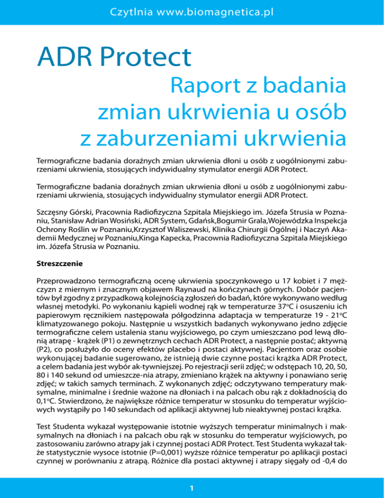 Czytlnia www.biomagnetica.pl ADR Protect Raport z badania zmian ukrwienia u osób z zaburzeniami ukrwienia Termograficzne badania doraźnych zmian ukrwienia dłoni u osób z uogólnionymi zaburzeniami ukrwienia, stosujących indywidualny stymulator energii ADR Protect. Termograficzne badania doraźnych zmian ukrwienia dłoni u osób z uogólnionymi zaburzeniami ukrwienia, stosujących indywidualny stymulator energii ADR Protect. Szczęsny Górski, Pracownia Radiofizyczna Szpitala Miejskiego im. Józefa Strusia w Poznaniu, Stanisław Adrian Wosiński, ADR System, Gdańsk,Bogumir Grala,Wojewódzka Inspekcja Ochrony Roślin w Poznaniu,Krzysztof Waliszewski, Klinika Chirurgii Ogólnej i Naczyń Akademii Medycznej w Poznaniu,Kinga Kapecka, Pracownia Radiofizyczna Szpitala Miejskiego im. Józefa Strusia w Poznaniu. Streszczenie Przeprowadzono termograficzną ocenę ukrwienia spoczynkowego u 17 kobiet i 7 mężczyzn z miernym i znacznym objawem Raynaud na kończynach górnych. Dobór pacjentów był zgodny z przypadkową kolejnością zgłoszeń do badań, które wykonywano według własnej metodyki. Po wykonaniu kąpieli wodnej rąk w temperaturze 37oC i osuszeniu ich papierowym ręcznikiem następowała półgodzinna adaptacja w temperaturze 19 - 21oC klimatyzowanego pokoju. Następnie u wszystkich badanych wykonywano jedno zdjęcie termograficzne celem ustalenia stanu wyjściowego, po czym umieszczano pod lewą dłonią atrapę - krążek (P1) o zewnętrznych cechach ADR Protect, a następnie postać; aktywną (P2), co posłużyło do oceny efektów placebo i postaci aktywnej. Pacjentom oraz osobie wykonującej badanie sugerowano, że istnieją dwie czynne postaci krążka ADR Protect, a celem badania jest wybór ak-tywniejszej. Po rejestracji serii zdjęć; w odstępach 10, 20, 50, 80 i 140 sekund od umieszcze-nia atrapy, zmieniano krążek na aktywny i ponawiano serię zdjęć; w takich samych terminach. Z wykonanych zdjęć; odczytywano temperatury maksymalne, minimalne i średnie ważone na dłoniach i na palcach obu rąk z dokładnością do 0,1oC. Stwierdzono, że największe różnice temperatur w stosunku do temperatur wyjściowych wystąpiły po 140 sekundach od aplikacji aktywnej lub nieaktywnej postaci krążka. Test Studenta wykazał występowanie istotnie wyższych temperatur minimalnych i maksymalnych na dłoniach i na palcach obu rąk w stosunku do temperatur wyjściowych, po zastosowaniu zarówno atrapy jak i czynnej postaci ADR Protect. Test Studenta wykazał także statystycznie wysoce istotnie (P=0,001) wyższe różnice temperatur po aplikacji postaci czynnej w porównaniu z atrapą. Różnice dla postaci aktywnej i atrapy sięgały od -0,4 do 1 Czytlnia www.biomagnetica.pl +8,4oC, z wartościami średnimi od 1,4 do 2,7oC, zaś maksymalnie od 5,1 do 8,4oC. Ponadto okazało się, że temperatury na obu rękach, w symetrycznych obszarach i w odpowiednich terminach nie różniły się istotnie. Skłania to, aby uznać; znaczny dodatni, praktycznie doraźny wpływ stosowania osobistego stymulatora ADR Protect na ukrwienie obwodowe u osób z jego zaburzeniami. Stwierdzono, że wpływ ten obejmował także dłoń drugostronną do tej, na którą ADR Protect oddziaływał bezpośrednio. Sugeruje to, że oddziaływanie ADR Protect ma cha-rakter ogólno-układowy, a nie tylko lokalny. Wprowadzenie Zastosowanie termografii do ilościowej oceny ukrwienia obwodowego jest od lat nie kwestionowaną domeną tej metody. Własna metodyka, wypracowana w ciągu wieloletniej praktyki, pozwala na przeprowadzenie tej oceny w sposób standaryzowany, ilościowy, w aspekcie spoczynkowym i naczynioruchowym-termoregulacyjnym [1] [2]. Stosowano ją m.in. do oceny ukrwienia obwodowego w chorobie wibracyjnej [3], do oceny ukrwienia wolnych przeszczepów skóry [4], w zaburzeniach neurologicznych [5] [6] [7], do oceny ewolucji adaptacyjnej ukrwienia u dzieci z klas sportowych - pływackich i lekkoatletycznych [8] W poprzedniej pracy badano zmiany ukrwienia kończyn górnych w trakcie 3 - tygodniowego stosowania magnetycznego stymulatora energii wody ADR Protect, stanowiącego wynalazek jednego z autorów (S.W.) [9] Przedmiotem obecnej pracy była ocena ewentualnych bezpośrednich skutków oddziaływani pokrewnego urządzenia - ADR Protect - stanowiącego osobisty stymulator energii. ADR Protect jest osobistym stymulatorem energii, zastrzeżonym w Polskim Urzędzie Patentowym pod numerem P336549. Stymulator ten wykonany jest z elastycznej folii magnetycznej o specyficznym przestrzennym rozkładzie pola magnetycznego. W wyznaczonych punktach naniesiona jest substancja ceramiczna i tlenki metali wykazujące specyficzne oddziaływanie w zakresie fal podczerwonych. Zadaniem ADR Protect jest zwiększenie odporności człowieka na czynniki szkodliwe, poprzez regulację czynnościową organizmu. Stymulator ADR Protect uzyskał między innymi Złoty Medal na 50. Światowym Salonie Innowacji, Wynalazków i Nowych Technologii, BRUSSELS EUREKA 2000; Złoty Medal na 17. Międzynarodowej Wystawie Wynalazków INPEX 2001 Pittsburgh, PA, USA; Złoty Medal na Światowej Wystawie Wynalazków Word Genius Convention 2001, Tokyo. Materiał i metoda Przeprowadzono termograficzną ocenę ukrwienia spoczynkowego u 17 kobiet i 7 mężczyzn z miernym i znacznym objawem Raynaud na kończynach górnych. Dobór pacjentów był zgodny z przypadkową kolejnością zgłoszeń do badania. Badania wykonywano według własnej metodyki. Wiek pacjentów zawierał się w granicach 20-52 lat, średnia wieku wynosiła 37,5 lat, a odchylenie standardowe - 9,0 lat. Po wykonaniu kąpieli wodnej rąk w temperaturze 37°C i osuszeniu ich papierowym ręcznikiem, następowała półgodzinna adaptacja w temperaturze 19 - 21oC klimatyzowanego pokoju. Następnie u wszystkich badanych wykonywano jedno zdjęcie termograficzne celem ustalenia stanu wyjściowego, po czym umieszczano pod lewą dłonią atrapę - krążek (P1) o zewnętrznych cechach ADR Pro