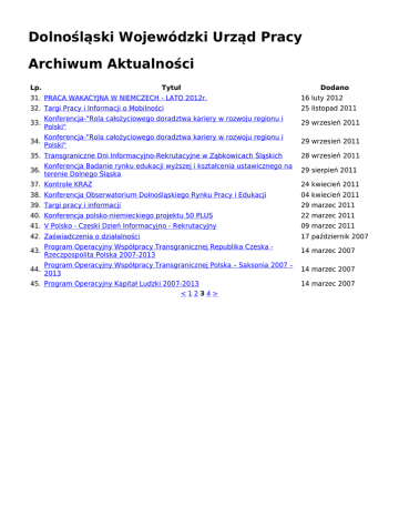Dolnośląski Wojewódzki Urząd Pracy Archiwum Aktualności Lp. Tytuł Dodano 31. PRACA WAKACYJNA W NIEMCZECH - LATO 2012r. 16 luty 2012 32. Targi Pracy i Informacji o Mobilności 25 listopad 2011 33. Konferencja-"Rola całożyciowego doradztwa kariery w rozwoju regionu i Polski" 29 wrzesień 2011 34. Konferencja-"Rola całożyciowego doradztwa kariery w rozwoju regionu i Polski" 29 wrzesień 2011 35. Transgraniczne Dni Informacyjno-Rekrutacyjne w Ząbkowicach Śląskich 28 wrzesień 2011 36. Konferencja Badanie rynku edukacji wyższej i kształcenia ustawicznego na terenie Dolnego Śląska 29 sierpień 2011 37. Kontrole KRAZ 24 kwiecień 2011 38. Konferencja Obserwatorium Dolnośląskiego Rynku Pracy i Edukacji 04 kwiecień 2011 39. Targi pracy i informacji 29 marzec 2011 40. Konferencja polsko-niemieckiego projektu 50 PLUS 22 marzec 2011 41. V Polsko - Czeski Dzień Informacyjno - Rekrutacyjny 09 marzec 2011 42. Zaświadczenia o działalności 17 październik 2007 43. Program Operacyjny Współpracy Transgranicznej Republika Czeska Rzeczpospolita Polska 2007-2013 14 marzec 2007 44. Program Operacyjny Współpracy Transgranicznej Polska – Saksonia 2007 – 2013 14 marzec 2007 45. Program Operacyjny Kapitał Ludzki 2007-2013 <1234> 14 marzec 2007