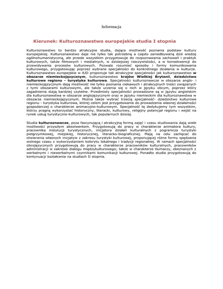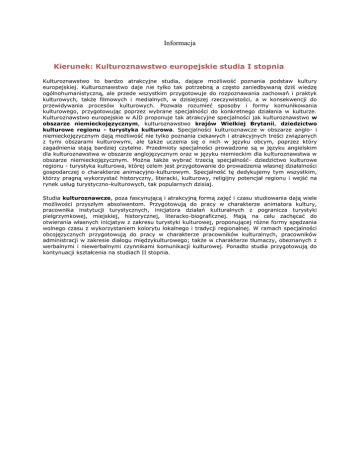 Informacja Kierunek: Kulturoznawstwo europejskie studia I