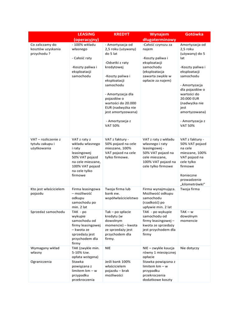 Cozaliczamydo kosztówuzyskania przychodu? VAT–rozliczeniez tytułuzakupui użytkowania Ktojestwłaścicielem pojazdu Sprzedażsamochodu Wymaganywkład własny Ograniczenia LEASING (operacyjny) -100%wkładu własnego -Całośćraty -Kosztypaliwai eksploatacji samochodu KREDYT -Amortyzacjaod 2,5roku(używany) do5lat -Odsetkizraty kredytowej -Kosztypaliwai eksploatacji samochodu -Amortyzacjadla pojazdówo wartoścido20.000 EUR(nadwyżkanie jestamortyzowana) -Amortyzacjaz VAT50% Wynajem długoterminowy -Całośćczynszuza najem -Kosztypaliwai eksploatacji samochodu (eksploatacja zawartazwyklew opłaciezanajem) Gotówka Amortyzacjaod 2,5roku (używany)do5 lat -Kosztypaliwai eksploatacji samochodu -Amortyzacja dlapojazdówo wartoścido 20.000EUR (nadwyżkanie jest amortyzowana) -Amortyzacjaz VAT50% VATzratyz VATzfaktury- VATzratyzwkładu VATzfaktury- wkładuwłasnego 50%pojazdnacele własnegoiraty 50%VATpojazd iraty mieszane,100% leasingowej- nacele leasingowej VATpojazdnacele 50%VATpojazdna mieszane,100% 50%VATpojazd tylkofirmowe. celemieszane, VATpojazdna nacelemieszane, 100%VATpojazdna celetylko 100%VATpojazd celetylkofirmowe firmowe naceletylko firmowe Konieczne prowadzenie „kilometrówki” Firmaleasingowa Twojafirmalub Firmawynajmująca. Twojafirma –możliwość bankew. Możliwośćodkupu odkupu współwłaścicielstwo samochodu samochodupo (rzadkość)po min.2lat upływiemin.2lat TAK-po Tak–pospłacie TAK-powykupie TAK–w wykupie kredytu(w samochoduod dowolnym samochoduod dowolnym firmyleasingowej– momencie firmyleasingowej momencie)–kwota kwotazesprzedaży –kwotaze zesprzedażyjest jestprzychodemdla sprzedażyjest przychodemdla firmy przychodemdla firmy. firmy TAK(zwyklemin. NIE NIE–zwyklekaucja Niedotyczy 5-10%tzw. równy1miesięcznej opłatawstępna) opłacie Stawka Jeślibank100% Stawkapowiązanaz powiązanaz właścicielem limitemkm–w limitemkm–w pojazdu–brak przypadku przypadku możliwości przekroczenia przekroczenia dodatkowekoszty Wymagane dokumenty UbezpieczenieAC wymagane Ktoodpowiadaza serwissamochodu Wcześniejszaspłata możliwa? Limitkilometrów Cowchodziwskład raty dodatkowe kosztyzakażdy kmlubrekalkulacjaoferty -Dowód tożsamości -Zgoda współmałżonka -REGON -NIP -Dokument potwierdzający prowadzenie działalnościgosp. (innyw zależnościod formy) -Zaświadczeniez USouzyskanym dochodzie -Zaświadczenie zUSowysokości podatku -Kopia sprawozdań finansowych TAK Twojafirma– możeszwykupić opcjęizlecićto firmie leasingowej TAKalenie wcześniejniżpo 24miesiącach TAK -WIBOR/LIBOR -Marżafirmy leasingowej -Opłata rejestracyjna -Możliweopłaty zakorzystanie osóbtrzecich, indywidualne ubezpieczaniesię iinne) amortyzacji pojazdu. zakażdykmlubrekalkulacjaoferty -Dowódtożsamości -Zgoda współmałżonka -REGON -NIP -Dokument potwierdzający prowadzenie działalnościgosp. (innywzależności odformy) -ZaświadczeniezUS ouzyskanym dochodzie -Zaświadczeniez USowysokości podatku -Kopiasprawozdań finansowych -Dowódtożsamości Niedotyczy -REGON -NIP -Dokument potwierdzający prowadzenie działalnościgosp. (innywzależności odformy) TAK NIE Twojafirma Doliczonedoopłaty (zwykle) Firma wypożyczająca pojazd(zwykle) TAK(czasami prowizjaok2%za wcześniejsząspłatę) NIE -WIBOR/LIBOR -Marżabanku -Prowizjaza zawarcie -Ubezpieczeniena życie(opcjazwykle) TAKalenie wcześniejniżpo24 miesiącach TAK -WIBOR/LIBOR -Marżafirmy wypożyczającej -Opłatyserwisowe -Ubezpieczenie -Opony Niedotyczy Twojafirma NIE Niedotyczy