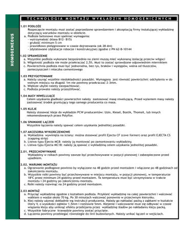 TEC H NO LOG IA M ONTAŻU WYKŁAD ZIN H O MO G ENI C ZNYCH 1.01 PODŁOŻE Rozpoczęcie montażu musi zostać poprzedzone sprawdzeniem i akceptacją firmy instalującej wykładzinę dotyczącą warunków montażu w obiekcie. a. Podłoże betonowe musi spełniać wymagania: - wytrzymałość (klasa B12- B15) - grubość minimum 5 cm - prawidłowo pielęgnowane w czasie dojrzewania (ok 28 dni) - zdylatowane (dylatacje robocze i konstrukcyjne) zgodne z PN 62-B-10144 – – – – 1.02 SPRAWDZENIE a. Wszystkie podłoża wykonane bezpośrednio na ziemi muszą mieć wykonaną izolację przeciw wilgoci b. Wilgotność podłoża nie może przekraczać 2,5%. Musi to zostać sprawdzone odpowiednim miernikiem c. Powierzchnia podłoża musi być jednorodna, bez rys, braków i występów, wolna od tłuszczów, zanieczyszczeń i mleczka cementowego 1.03 PRZYGOTOWANIE a. Należy usunąć wszelkie niedokładności posadzki. Wymagana jest równość powierzchni: odchylenia w do wolnym miejscu na długość 1m nie powinny przekraczać 2-3mm. b. Większe ubytki należy zaszpachlować. c. Podłoża prowate należy przeszlifować. 1.04 MASY NIWELUJĄCE Celem uzyskania gładkości powierzchni należy zastosować masę niwelującą. Przed wylaniem masy należy zastosować środek gruntujący tego samego producenta co masa. 1.05 KLEJE Należy stosować kleje do wykładzin PCW producentów: Uzin, Kiesel, Bostik, Thomsit, lub innych rekomendowanych przez Polyflor. 1.06 SPAWANIE ŁĄCZEŃ Wszystkie łączenia należy spawać celem uzyskania jednolitej posadzki. 1.07 AKCESORIA WYKOŃCZENIOWE a. Wykładzina wywinięta na ściany: można stosować profil Ejecta CF (cove former) oraz profil EJECTA CS (capping strip) b. Listwa typu Ejecta MC8: należy ją montować po zamontowaniu wykładziny. c. Listwa typu Ejecta MC18: należy ją spawać z wykładziną celem uzyskania jednolitej posadzki. 2.01. PRZECHOWYWANIE Wykładziny w rolkach powinny zawsze być przechowywane w pozycji pionowej i zabezpieczone przed upadkiem. 2.02. WARUNKI MONTAŻU a. Ogrzewanie podłogowe powinno by wyłączone na 48 godzin przed montażem i włączone po 48 godzinach od zakończenia montażu. b. Wszystkie rolki powinny być przechowywane w miejscu montażu, w pozycji pionowej, w temperaturze 18ºC przez minimum 24 godziny przed montażem. Ta temperatura musi być utrzymywana w trakcie montażu i 24 godziny po zakończeniu montażu. c. Rolki należy rozwinąć na 24 godziny przed montażem. 2.03 MONTAŻ a. Przyciąć wykładzinę zgodnie z kształtem podłoża. Przykleić wykładzinę na całej powierzchni i walcować wałkiem o wadze około 70 kg. Po 30 minutach walcować ponownie w przeciwnym kierunku. b. Klej należy używać dokładnie wg instrukcji producenta. Należy go nakładać packą z ząbkami w kształcie litery V, o wysokości ząbków 1,5mm i rozstawie 5mm. Klejenie i walcowanie musi się odbywać w czasie wiązania kleju aby uniknąć efektu przebijania przez wykładzinę śladów po nakładaniu kleju packą. c. Wszystkie fabryczne krawędzie powinny zostać przycięte. d. Łączenia powinny przebiegać równolegle do linii budowlanych. Należy unikać łączeń w wejściach. TEC H NO LOG IA M ONTAŻU WYKŁAD ZIN PO LYF LOR e. Wszystkie łączenia należy frezować na 2/3 grubości a następnie spawać sznurem Ejecta weld rod. Po spawaniu ściąć nadmiar sznura: zgrubienie po spawaniu, dokładnie po wystygnięciu. f. Przy wywijaniu wykładzin na ściany należy używać profili Ejecta CF (cove former). Do klejenia powierzchni pionowych należy używać klejów kontaktowych. Wszystkie łączenia pionowe należy spawać. 3.01 ZAKOŃCZENIE MONTAŻU Zamieść i odkurzyć wykładzinę. Usunąć wszystkie zabrudzenia i klej z wykładziny po 24 godzinach od zakończenia montażu używając środka Bendurol Forte firmy Henkel- Ecolab (wg instrukcji producenta). Większe zabrudzenia doczyścić padami ściernymi tej samej firmy. Spłukać czystą wodą i odczekać do wyschnięcia. Usunąć nadmiar wody, który może uszkodzić klej. 3.02 ZABEZPIECZENIE a. Po zakończeniu montażu wykładzinę bez fabrycznego pokrycia poliuretanem należy pokryć warstwą akrylanową np. Lodan lub Gliz Metalic firmy Henkel- Ecolab (wg instrukcji producenta). Po wyschnięciu przykryć folią lub innym materiałem. b. Oddanie do użytku powinno nastąpić nie wcześniej niż po 48 godzinach od zakończenia instalacji. 3.03 ODPAD Odpad o wielkości 4m² powinien być przekazany klientowi na ewentualne naprawy. 3.04. KONSERWACJA Wykładzinę należy czyścić i konserwować wg dokumentu „Utrzymanie w Czystości i Konserwacja Obiektowych Wykładzin Polyflor”.