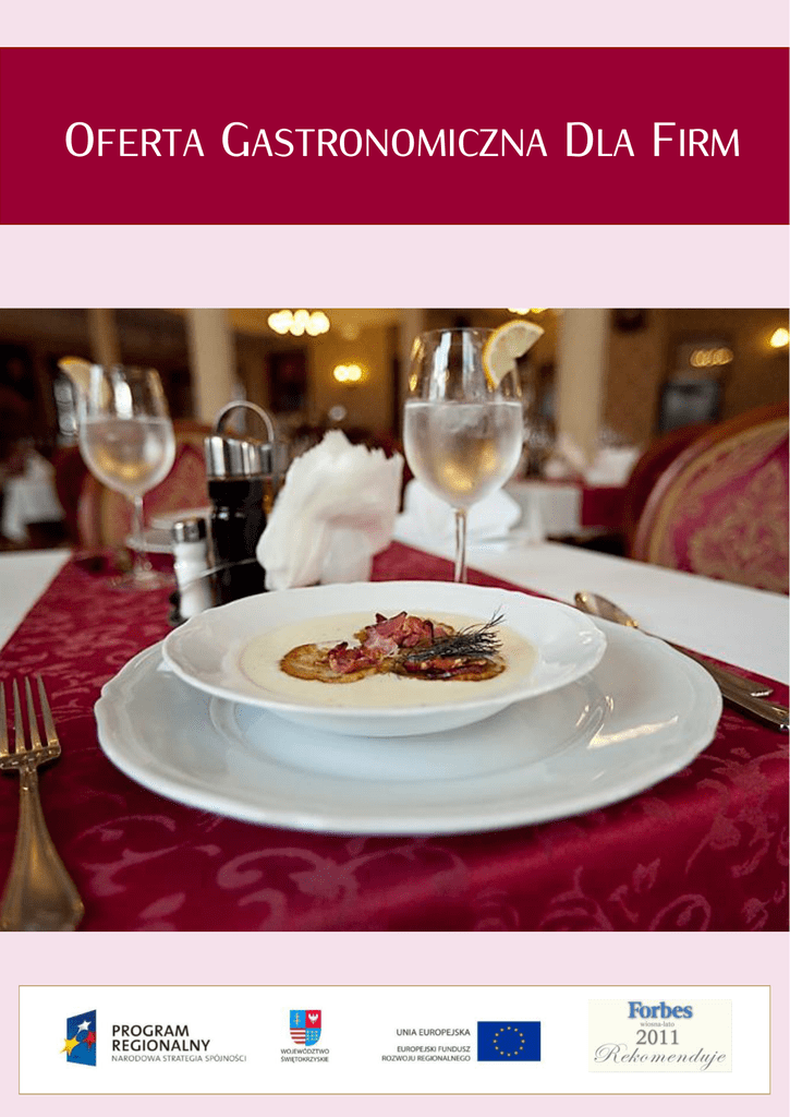 OFERTA GASTRONOMICZNA DLA FIRM ZAKĄSKI, PRZYSTAWKI, SAŁATKI Różyczki z łososia z nadzieniem serowym (5 dkg) Sery pleśniowe (8 dkg) Łosoś ze szpinakiem w otulinie z kapusty pekińskiej z imbirem (100 g) Sałatka z łososia wędzonego i mix sałat (80 g) Wędliny: schab pieczony, karkówka pieczona, łopatka, boczek, szynka pieczona, pasztet, kabanosy, baleron białoruski (150 g) Sałatka makaronowa z rukolą i szynką gotowaną (100 g) Rolada z kaczki (5 dkg) Schab po warszawsku z serem białym i chrzanem (8 dkg) Ryba po grecku (8 dkg) Sałatka z makaronu farfalle i salami (100 g) Sałatka makaronowa z rukolą i szynką gotowaną (100 g) Galantyna z kurczaka (100 g) Galaretka drobiowa (150 g) Schab w galarecie (8 dkg) Pstrąg faszerowany (8 dkg) Filet z kurczaka w panierce z orzeszków ziemnych w sosie curry (5 dkg) Galaretka z nóżek wieprzowych (150 g) Sałatka śledziowa (100 g) Sałatka z tuńczyka na bazie ryżu (100 g) Sałatka z tuńczyka na bazie makaronu (100 g) Sałatka z kurczaka i ananasa (100 g) Sałatka grecka (150 g) Sałatka kebab z kapustą pekińską (80 g) Terrina z kurczaka (7 dkg) Śledź po węgiersku (5 dkg) Śledź w sosie tatarskim (5 dkg) Szparagi w szynce (7 dkg) Sałatka z pieczarek i porów (70 g) Śledź w oleju z cebulką (5 dkg) Jaskółcze gniazdo (100 g) Przysmak z sera camembert z żurawiną (7 dkg) Jaja z musem pieczarkowym (0,5 szt.) Koreczki (2 sztuki) Zespół Dworski Hotel Sarmata*** ul. Zawichojska 2, 27-600 Sandomierz Tel. 15.833.47.00, Fax. 15.833.47.01 [email protected] ZUPY I KREMY Barszcz czerwony z krokietem/ pasztecikiem/ uszkami (250 ml) Barszcz ukraiński (350 ml) Buef Strogonow (250 ml) Flaki wołowe Forszmak w chlebku (250 ml) Gulasz węgierski z kluseczkami ziołowymi (250 ml) Krem borowikowy z groszkiem ptysiowym (250 ml) Krem brokułowy z prażonymi płatkami migdałów (250 ml) Krem z dyni z parmezanem (250 ml) Krem z pieczarek z groszkiem ptysiowym (250 ml) Krem z porów z szynką (250 ml) Krem ze szparagów (250 ml) Rosół z makaronem/ uszkami (350 ml) Zupa cebulowa podana z ciastkiem francuskim (250 ml) Zupa czosnkowa z jajkiem w chlebku (250 ml) Zupa fasolowa przecierana podana z kiełbasą i boczkiem (250 ml) Zupa grzybowa z suszonych borowików z łazankami (350 ml) Zupa krem pomidorowy z grzankami ziołowymi (250 ml) Zupa krem serowa z chipsami z boczku (250 ml) Zupa krem z cukinii (250 ml) Zupa krem z groszku zielonego podana z groszkiem ptysiowym (250 ml) Zupa krem z kalafiora Zupa krem z selerów z groszkiem ptysiowym (250 ml) Zupa krem ze świeżych ogórków (250 ml) Zupa ogórkowa (350 ml) Zupa szczawiowa z jajkiem (350 ml) Zupa z kiszonej kapusty (kwaśnica) (350 ml) Zupa z soczewicy z kiełbasą i grzankami (250 ml) Żur z jajkiem i kiełbasą (350 ml) Zespół Dworski Hotel Sarmata*** ul. Zawichojska 2, 27-600 Sandomierz Tel. 15.833.47.00, Fax. 15.833.47.01 [email protected] DANIE GŁÓWNE Filet z indyka podany na sosie żurawinowo - chrzanowym z kaszą kuskus i brokułami Filet ze szparagami podany z ziemniaczkami i warzywami na sosie maślano-ziołowym (150 g) Gulasz wieprzowy podany z kopytkami i zestawem surówek (150 g) Gulasz wołowy podany z kopytkami i zestawem surówek (150 g) Karkówka pieczona z sosem pieczarkowym z kluskami śląskimi i zestawem surówek Klopsiki w sosie koperkowym z kluskami śląskimi i zestawem surówek (150 g) Kotlet schabowy panierowany faszerowany pieczarkami i serem mozarella podany z ziemniaczkami gotowanymi i zestawem surówek Kotlet schabowy z ziemniaczkami z wody i zestawem surówek (150 g) Łosoś pieczony podany z ziemniaczkami opiekanymi i zestawem surówek (filet 150 g) Pilaw z drobiu z ryżem jaśminowym (100 g) Polędwiczka w otulinie z drobiu (crepinet) na sosie pieczeniowym podana z ziemniaczkami gotowanymi i zestawem warzyw (150 g) Polędwiczki wieprzowe w otulinie z boczku z ziemniaczkami i warzywami (150 g) Przysmak Radziwiłła podany na sosie pieczeniowym z ziemniaczkami gotowanymi i zestawem warzyw (150 g) Pstrąg pieczony podany z warzywami i ryżem (1 szt. - ok. 300 g) Rolada z gęsi z cielęciną podana na sosie z kurek z ziemniaczkami gotowanymi i zestawem warzyw (150 g) Rolada z kaczki podana na sosie śliwkowo - pomarańczowym z ziemniaczkami gotowanymi i duszoną czerwoną kapustą z rodzynkami (150 g) Schab pieczony na sosie pieczeniowym z ziemniaczkami i warzywami Schab z rusztu z ziemniaczkami i miksem warzyw (150 g) Stek z karkówki z ziemniaczkami gotowanymi i kapustą zasmażaną (150 g) Udko faszerowane podane z marchewką zasmażaną i ryżem (150 g) Udko pieczone podane z frytkami i zestawem surówek Udziec pieczony "płonący" z kulkami ziemniaczanymi i surówką pekińską (150 g) Zrazy wołowe podane na sosie pieczeniowym z kaszą gryczaną i buraczkami z chrzanem (150 g) Zespół Dworski Hotel Sarmata*** ul. Zawichojska 2, 27-600 Sandomierz Tel. 15.833.47.00, Fax. 15.833.47.01 [email protected] BUFET CIEPŁY I ZIMNY - 55 Bufet Ciepły Pierogi Mix (ruskie, mięsne, kapusta-grzyby) - 6 szt./os. Panga panierowana - 100g/os. Spaghetti z sosem bolognese - 150g/os. Karkówka pieczona podane w sosie własnym - 100g/os. Skrzydełka pieczone - 2 szt./os. Ziemniaczki opiekane - 100g/os. Bufet Zimny Sałatka z kapusty pekińskiej z ogórkiem i pomidorem - 100g/os. Sałatka jarzynowa - 100g/os. Śledź w oleju - 5 dkg/os. Szynki polskie - wiśniowa, dębowa, sopocka, wiejska - 50g/os. Dodatkowo płatne Bufet kawowo-herbaciany do kolacji bez limitu - 5 zł /os. Bufet słodki - ciasta różne rodzaje 200g/os. - 5 zł/os. Soki, woda w dzbankach na stołach - 5 zł /os. Deska serów /3 rodzaje serów pleśniowych/ 70g/os. - 10zł/os. Zespół Dworski Hotel Sarmata*** ul. Zawichojska 2, 27-600 Sandomierz Tel. 15.833.47.00, Fax. 15.833.47.01 [email protected] ZŁ BUFET CIEPŁY I ZIMNY - 70 ZŁ Ciepły Bufet Pierogi MIX (ruskie, z mięsem, z kapustą i grzybami)- 6szt/os. Łosoś filet pieczony- 5dkg/os. Lasagne bolognese - 100g/os. Ziemniaczki opiekane-