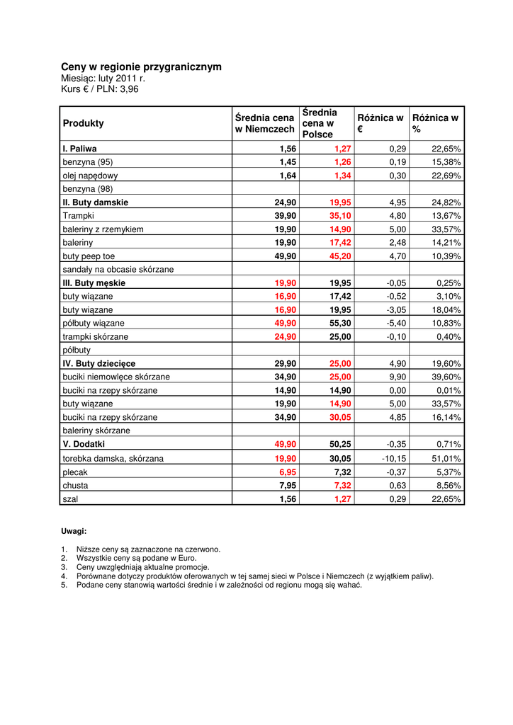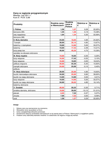 Ceny w regionie przygranicznym Miesiąc: luty 2011 r. Kurs € / PLN: 3,96 Produkty Średnia Średnia cena cena w w Niemczech Polsce Różnica w Różnica w € % I. Paliwa 1,56 1,27 0,29 22,65% benzyna (95) 1,45 1,26 0,19 15,38% olej napędowy 1,64 1,34 0,30 22,69% II. Buty damskie 24,90 19,95 4,95 24,82% Trampki 39,90 35,10 4,80 13,67% baleriny z rzemykiem 19,90 14,90 5,00 33,57% baleriny 19,90 17,42 2,48 14,21% buty peep toe 49,90 45,20 4,70 10,39% III. Buty męskie 19,90 19,95 -0,05 0,25% buty wiązane 16,90 17,42 -0,52 3,10% buty wiązane 16,90 19,95 -3,05 18,04% półbuty wiązane 49,90 55,30 -5,40 10,83% trampki skórzane 24,90 25,00 -0,10 0,40% IV. Buty dziecięce 29,90 25,00 4,90 19,60% buciki niemowlęce skórzane 34,90 25,00 9,90 39,60% buciki na rzepy skórzane 14,90 14,90 0,00 0,01% buty wiązane 19,90 14,90 5,00 33,57% buciki na rzepy skórzane 34,90 30,05 4,85 16,14% V. Dodatki 49,90 50,25 -0,35 0,71% torebka damska, skórzana 19,90 30,05 -10,15 51,01% plecak 6,95 7,32 -0,37 5,37% chusta 7,95 7,32 0,63 8,56% szal 1,56 1,27 0,29 22,65% benzyna (98) sandały na obcasie skórzane półbuty baleriny skórzane Uwagi: 1. 2. 3. 4. 5. Niższe ceny są zaznaczone na czerwono. Wszystkie ceny są podane w Euro. Ceny uwzględniają aktualne promocje. Porównane dotyczy produktów oferowanych w tej samej sieci w Polsce i Niemczech (z wyjątkiem paliw). Podane ceny stanowią wartości średnie i w zależności od regionu mogą się wahać.