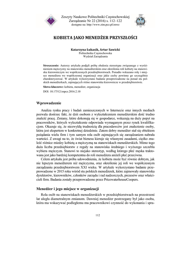 Zeszyty Naukowe Politechniki Katarzyna Łukasik, ArturCzęstochowskiej Sawicki Zarządzanie Nr 22 (2016) s. 112–122 dostępne na: http://www.zim.pcz.pl/znwz KOBIETA JAKO MENEDŻER PRZYSZŁOŚCI Katarzyna Łukasik, Artur Sawicki Politechnika Częstochowska Wydział Zarządzania Streszczenie: Autorzy artykułu podjęli próbę obalenia stereotypu związanego z wyróżnieniem mężczyzny na stanowisku menedżerskim oraz określenia roli kobiety na stanowisku kierowniczym we współczesnych przedsiębiorstwach. Ponadto wskazano rolę i miejsce menedżera we współczesnej organizacji oraz jakie cechy powinny go szczególnie charakteryzować. W artykule wykorzystano badanie przeprowadzone na ponad stu polskich menedżerkach, zajmujących różne stanowiska kierownicze w przedsiębiorstwie. Słowa kluczowe: kobieta, menedżer, organizacja DOI: 10.17512/znpcz.2016.2.10 Wprowadzenie Analiza rynku pracy i badań zamieszczonych w Internecie oraz innych mediach pozwala dostrzec fakt, że dziś osobom z wykształceniem menedżerskim dość trudno znaleźć pracę. Zmiany, które dokonują się w gospodarce, wskazują na duży popyt na pracowników, których wykształcenie odpowiada wymaganym przez rynek kwalifikacjom. Okazuje się, że niezwykłą trudnością dla pracodawców jest znalezienie osoby, która jest ekspertem w konkretnej dziedzinie. Zatem dobry menedżer stał się obiektem pożądania wielu firm i tym samym rola osób zajmujących się zarządzaniem nabrała wartości. Z uwagi na to, że świat biznesu kieruje się własnymi zasadami, ciężko znaleźć różnice miedzy kobietą a mężczyzną na stanowiskach menedżerskich. Mimo tego duża liczba przedsiębiorstw z reguły na stanowiska średniego i wyższego szczebla wybiera mężczyzn. Stanowi to niejako stereotyp, według którego płeć męska traktowana jest jako bardziej kompetentna do roli menedżera aniżeli płeć przeciwna. Celem artykułu jest próba udowodnienia, że kobieta może być równie dobrym, jak nie lepszym menedżerem niż mężczyzna, oraz określenie jej roli we współczesnym zarządzaniu przedsiębiorstwem XXI wieku. W artykule wykorzystano badanie przeprowadzone w 2015 roku wśród stu polskich menedżerek, które zajmowały stanowiska dyrektorów, kierowników, członków zarządu i rad nadzorczych, prezesów oraz właścicieli firm. Badania zostały przeprowadzone przez PricewaterhouseCoopers. Menedżer i jego miejsce w organizacji Rola osób na stanowiskach menedżerskich w przedsiębiorstwach na przestrzeni lat uległa diametralnym zmianom. Dawniej menedżer postrzegany był jako osoba, która ma wskazywać podległemu mu pracownikowi czynność do wykonania i spra- 112 Kobieta jako menedżer przyszłości wować nad nim kontrolę. Obecnie od menedżera wymaga się, aby jego działania ukierunkowane były także na motywację pracownika do bardziej wydajnej pracy, co skutkować ma efektywniejszą realizacją celów strategicznych przedsiębiorstwa. Literatura definiuje menedżera jako osobę, która zarządza przedsiębiorstwem lub jego częścią za przyzwoleniem właściciela lub dyrektora firmy. Menedżer to również osoba, która pełni funkcje właściciela albo kierownika na różnych szczeblach w firmie (Kubik 2005, s. 71). Jak wspomniano, współczesny menedżer ma odmienny styl kierowania, wcześniej podwładni traktowali go jako przełożonego, który ma prawo karać (Penc 2007, s. 143). Dziś menedżer musi posiadać predyspozycje do zarządzania pracownikami w całym tego słowa znaczeniu. Ale sama umiejętność kierowania pracownikami nie określa menedżera jako profesjonalistę; prócz odpowiednich umiejętności kierowniczych winien posiadać pożądane cechy charakteru (Sawicki 2014, s. 227). Zdaniem J. Tylki współczesny menedżer musi się charakteryzować (Tylka 2012, s. 12): – nienagannym wyglądem, – pewnością siebie, – umiejętnością tworzenia własnego wizerunku, – wysoką ambicją, – orientacją na sukces, – kreatywnością i asertywnością, – innowacyjnością, – tolerancją, – sprawnością perswazyjnego mówienia i słuchania, – uporem i stanowczością, – inteligencją i organizacją pracy. Z punktu widzenia właściciela, jak i pracowników do ważniejszych zadań menedżera należy tworzenie w pracy dobrej atmosfery, która będzie zapobiegać powstawaniu konfliktów w przedsiębiorstwie i w jego otoczeniu. Ponadto warte uwagi jest zapoznanie się ze standardami unijnymi z obszaru kształcenia personelu i społecznej odpowiedzialności pracodawców, jako niektórymi kierunkami zarządzania pracownikami. Menedżer organizacji musi wzbudzać zaufanie wśród współpracowników. Pełniąc funkcję kierowniczą, nie może jej nadużywać, w celu np. manipulacji pracownikami. Od menedżera wymaga się, aby słuchał, rozumiał i elastycznie angażował się w rozwiązywanie powstałych problemów. Aby jego czynności były efektywnie wykonywane, powinien być odporny na sytuacje stresowe (Kiełtyka 2004, s. 103-106; Kielesińska 2009, s. 184-195). Zdaniem H. Skłodowskiego osoba pełniąca funkcję menedżera powinna być odpowiednio ukształtowana oraz zintegrowana. Cechować się powinna (Skłodowski 1993, s. 24-25): – trwałością przekonań, dzięki którym możliwe jest wyrażanie własnej opinii w istotnych obszarach, – charakterem (zespół wartości i przekonań), – odpowiedzialnością za podejmowane działania, 113 Katarzyna Łukasik, Artur Sawicki – umiejętnościami informacyjnymi (merytoryczność i transparentność przekazywanych informacji), – sprawiedliwością wobec podwładnych, – twórczą, samodzielną postawą, – zrównoważeniem emocjonalnym. Kobietę w roli menedżera spotyka się najczęściej w mikro i małych przedsiębiorstwach, które zazwyczaj rozwijają się wolniej niż duże firmy. Pełnienie stanowiska menedżerskiego przez kobietę przyjmuje dwie formy. Pierwsza z nich dotyczy posiadanych umiej