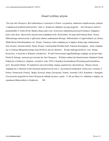 www.radiomaryja.pl/artykuly.php?id=1145531 2012-07-19 Zmarł wybitny artysta Nie żyje Jan Chrząszcz. Był znakomitym i cenionym w Polsce i za granicą malarzem współczesnym, jednym z najlepszych polskich portrecistów. Jutro w Krakowie odbędzie się jego pogrzeb. Jan Chrząszcz zmarł w poniedziałek w wieku 68 lat. Bardzo dużą część swej twórczości malarskiej poświęcił tematyce religijnej i przez cały okres aktywności artystycznej współpracował z Kościołem. Do jego dzieł należą obraz Jezusa Miłosiernego umieszczony w głównym ołtarzu sanktuarium Bożego Miłosierdzia w Łagiewnikach czy obrazy Matki Bożej Ostrobramskiej i św. Siostry Faustyny, które znajdują się w kaplicy dolnej tego sanktuarium. Jest również autorem dzieła Ojciec Święty z metropolitą Wiednia kard. Franzem Koenigiem , które znajduje się w Centrum Błogosławionego Jana Pawła II, jak też obrazów: Święta Jadwiga Królowa oraz Droga Krzyżowa w kościele w Klinach w Krakowie. W auli Uniwersytetu Jagiellońskiego znajduje się portret Jana Pawła II, którego autorem jest również śp. Jan Chrząszcz. Wybitny malarz był absolwentem Akademii Sztuk Pięknych w Krakowie. Dyplom uzyskał w roku 1970 w Katedrze Komunikacji Wizualnej pod kierunkiem prof. Ryszarda Otręby. W malarstwie używał technik: olejnej, pastelowej i akwarelowej. Obrazy artysty znajdują się w zbiorach wielu instytucji państwowych oraz w prywatnych kolekcjach. Znany jest i ceniony w Polsce, Niemczech, Francji, Belgii, Szwecji, Iranie, Szwajcarii, Austrii, Australii, USA, Kanadzie i Senegalu. Uroczystości pogrzebowe Jana Chrząszcza odbędą się jutro o godz. 11.40, po Mszy św. żałobnej w kaplicy na cmentarzu Rakowickim w Krakowie. www.radiomaryja.pl MJ Strona 1/1