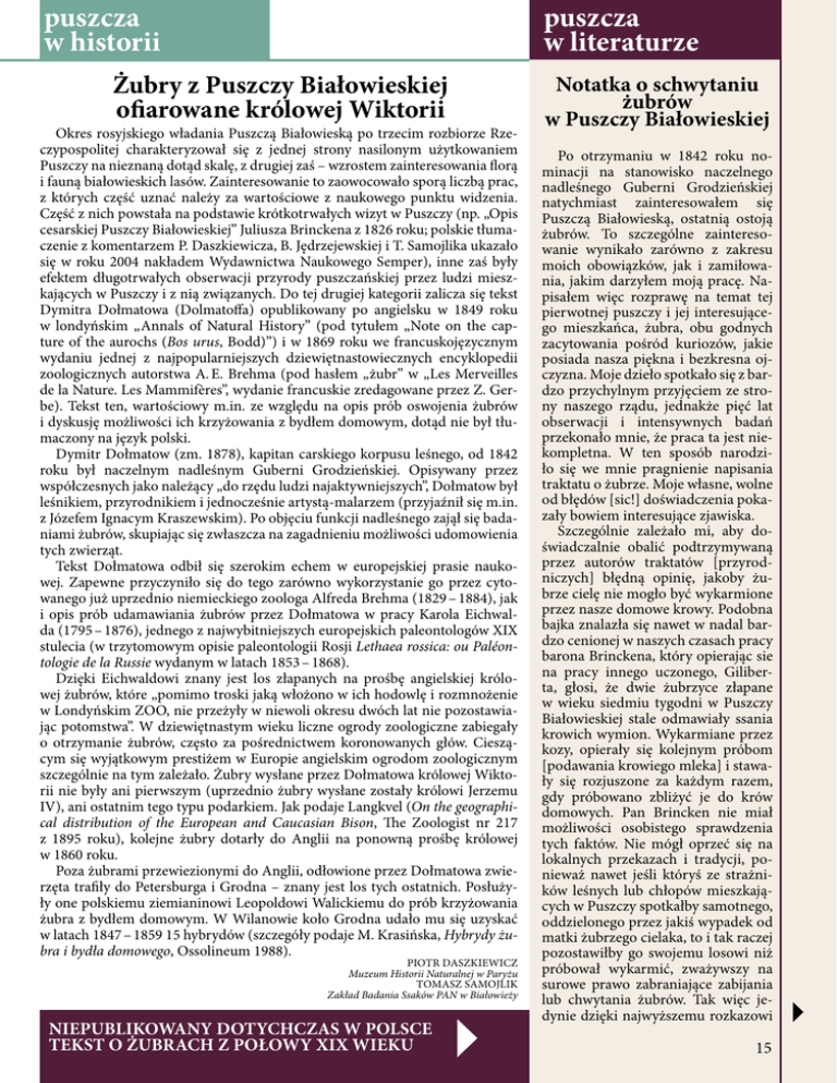 puszcza w literaturze puszcza w historii Żubry z Puszczy Białowieskiej ofiarowane królowej Wiktorii Okres rosyjskiego władania Puszczą Białowieską po trzecim rozbiorze Rzeczypospolitej charakteryzował się z jednej strony nasilonym użytkowaniem Puszczy na nieznaną dotąd skalę, z drugiej zaś – wzrostem zainteresowania florą i fauną białowieskich lasów. Zainteresowanie to zaowocowało sporą liczbą prac, z których część uznać należy za wartościowe z naukowego punktu widzenia. Część z nich powstała na podstawie krótkotrwałych wizyt w Puszczy (np. „Opis cesarskiej Puszczy Białowieskiej” Juliusza Brinckena z 1826 roku; polskie tłumaczenie z komentarzem P. Daszkiewicza, B. Jędrzejewskiej i T. Samojlika ukazało się w roku 2004 nakładem Wydawnictwa Naukowego Semper), inne zaś były efektem długotrwałych obserwacji przyrody puszczańskiej przez ludzi mieszkających w Puszczy i z nią związanych. Do tej drugiej kategorii zalicza się tekst Dymitra Dołmatowa (Dolmatoffa) opublikowany po angielsku w 1849 roku w londyńskim „Annals of Natural History” (pod tytułem „Note on the capture of the aurochs (Bos urus, Bodd)”) i w 1869 roku we francuskojęzycznym wydaniu jednej z najpopularniejszych dziewiętnastowiecznych encyklopedii zoologicznych autorstwa A. E. Brehma (pod hasłem „żubr” w „Les Merveilles de la Nature. Les Mammifères”, wydanie francuskie zredagowane przez Z. Gerbe). Tekst ten, wartościowy m.in. ze względu na opis prób oswojenia żubrów i dyskusję możliwości ich krzyżowania z bydłem domowym, dotąd nie był tłumaczony na język polski. Dymitr Dołmatow (zm. 1878), kapitan carskiego korpusu leśnego, od 1842 roku był naczelnym nadleśnym Guberni Grodzieńskiej. Opisywany przez współczesnych jako należący „do rzędu ludzi najaktywniejszych”, Dołmatow był leśnikiem, przyrodnikiem i jednocześnie artystą-malarzem (przyjaźnił się m.in. z Józefem Ignacym Kraszewskim). Po objęciu funkcji nadleśnego zajął się badaniami żubrów, skupiając się zwłaszcza na zagadnieniu możliwości udomowienia tych zwierząt. Tekst Dołmatowa odbił się szerokim echem w europejskiej prasie naukowej. Zapewne przyczyniło się do tego zarówno wykorzystanie go przez cytowanego już uprzednio niemieckiego zoologa Alfreda Brehma (1829 – 1884), jak i opis prób udamawiania żubrów przez Dołmatowa w pracy Karola Eichwalda (1795 – 1876), jednego z najwybitniejszych europejskich paleontologów XIX stulecia (w trzytomowym opisie paleontologii Rosji Lethaea rossica: ou Paléontologie de la Russie wydanym w latach 1853 – 1868). Dzięki Eichwaldowi znany jest los złapanych na prośbę angielskiej królowej żubrów, które „pomimo troski jaką włożono w ich hodowlę i rozmnożenie w Londyńskim ZOO, nie przeżyły w niewoli okresu dwóch lat nie pozostawiając potomstwa”. W dziewiętnastym wieku liczne ogrody zoologiczne zabiegały o otrzymanie żubrów, często za pośrednictwem koronowanych głów. Cieszącym się wyjątkowym prestiżem w Europie angielskim ogrodom zoologicznym szczególnie na tym zależało. Żubry wysłane przez Dołmatowa królowej Wiktorii nie były ani pierwszym (uprzednio żubry wysłane zostały królowi Jerzemu IV), ani ostatnim tego typu podarkiem. Jak podaje Langkvel (On the geographical distribution of the European and Caucasian Bison, The Zoologist nr 217 z 1895 roku), kolejne żubry dotarły do Anglii na ponowną prośbę królowej w 1860 roku. Poza żubrami przewiezionymi do Anglii, odłowione przez Dołmatowa zwierzęta trafiły do Petersburga i Grodna – znany jest los tych ostatnich. Posłużyły one polskiemu ziemianinowi Leopoldowi Walickiemu do prób krzyżowania żubra z bydłem domowym. W Wilanowie koło Grodna udało mu się uzyskać w latach 1847 – 1859 15 hybrydów (szczegóły podaje M. Krasińska, Hybrydy żubra i bydła domowego, Ossolineum 1988). Piotr Daszkiewicz Muzeum Historii Naturalnej w Paryżu Tomasz Samojlik Zakład Badania Ssaków PAN w Białowieży NIEPUBLIKOWANY DOTYCHCZAS W POLSCE TEKST O ŻUBRACH Z POŁOWY XIX WIEKU Notatka o schwytaniu żubrów w Puszczy Białowieskiej Po otrzymaniu w 1842 roku nominacji na stanowisko naczelnego nadleśnego Guberni Grodzieńskiej natychmiast zainteresowałem się Puszczą Białowieską, ostatnią ostoją żubrów. To szczególne zainteresowanie wynikało zarówno z zakresu moich obowiązków, jak i zamiłowania, jakim darzyłem moją pracę. Napisałem więc rozprawę na temat tej pierwotnej puszczy i jej interesującego mieszkańca, żubra, obu godnych zacytowania pośród kuriozów, jakie posiada nasza piękna i bezkresna ojczyzna. Moje dzieło spotkało się z bardzo przychylnym przyjęciem ze strony naszego rządu, jednakże pięć lat obserwacji i intensywnych badań przekonało mnie, że praca ta jest niekompletna. W ten sposób narodziło się we mnie pragnienie napisania traktatu o żubrze. Moje własne, wolne od błędów [sic!] doświadczenia pokazały bowiem interesujące zjawiska. Szczególnie zależało mi, aby doświadczalnie obalić podtrzymywaną przez autorów traktatów [przyrodniczych] błędną opinię, jakoby żubrze cielę nie mogło być wykarmione przez nasze domowe krowy. Podobna bajka znalazła się nawet w nadal bardzo cenionej w naszych czasach pracy barona Brinckena, który opierając sie na pracy innego uczonego, Giliberta, głosi, że dwie żubrzyce złapane w wieku siedmiu tygodni w Puszczy Białowieskiej stale odmawiały ssania krowich wymion. Wykarmiane przez kozy, opierały się kolejnym próbom [podawania krowiego mleka] i stawały się rozjuszone za każdym razem, gdy próbowano zbliżyć je do krów domowych. Pan Brincken nie miał możliwości osobistego sprawdzenia tych faktów. Nie mógł oprzeć się na lokalnych przekazach i tradycji, ponieważ nawet jeśli któryś ze strażników leśnych lub chłopów mieszkających w Puszczy spotkałby samotnego, oddzielonego przez jak
