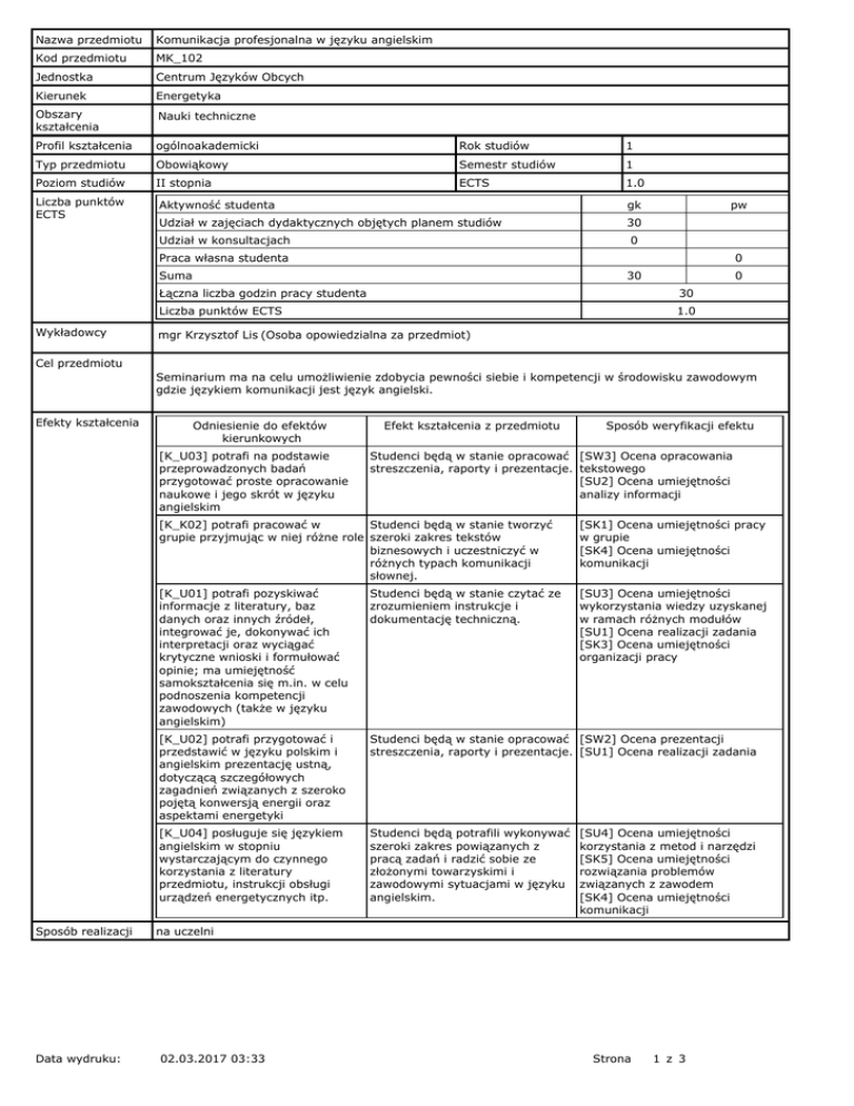 Nazwa przedmiotu Komunikacja profesjonalna w języku angielskim Kod przedmiotu MK_102 Jednostka Centrum Języków Obcych Kierunek Energetyka Obszary kształcenia Nauki techniczne Profil kształcenia ogólnoakademicki Rok studiów 1 Typ przedmiotu Obowiąkowy Semestr studiów 1 Poziom studiów II stopnia ECTS 1.0 Liczba punktów ECTS Aktywność studenta gk Udział w zajęciach dydaktycznych objętych planem studiów 30 Udział w konsultacjach pw 0 Praca własna studenta 0 Suma Wykładowcy 30 0 Łączna liczba godzin pracy studenta 30 Liczba punktów ECTS 1.0 mgr Krzysztof Lis (Osoba opowiedzialna za przedmiot) Cel przedmiotu Seminarium ma na celu umożliwienie zdobycia pewności siebie i kompetencji w środowisku zawodowym gdzie językiem komunikacji jest język angielski. Efekty kształcenia Odniesienie do efektów kierunkowych [K_U03] potrafi na podstawie przeprowadzonych badań przygotować proste opracowanie naukowe i jego skrót w języku angielskim Sposób realizacji Data wydruku: Efekt kształcenia z przedmiotu Sposób weryfikacji efektu Studenci będą w stanie opracować [SW3] Ocena opracowania streszczenia, raporty i prezentacje. tekstowego [SU2] Ocena umiejętności analizy informacji [K_K02] potrafi pracować w Studenci będą w stanie tworzyć grupie przyjmując w niej różne role szeroki zakres tekstów biznesowych i uczestniczyć w różnych typach komunikacji słownej. [SK1] Ocena umiejętności pracy w grupie [SK4] Ocena umiejętności komunikacji [K_U01] potrafi pozyskiwać informacje z literatury, baz danych oraz innych źródeł, integrować je, dokonywać ich interpretacji oraz wyciągać krytyczne wnioski i formułować opinie; ma umiejętność samokształcenia się m.in. w celu podnoszenia kompetencji zawodowych (także w języku angielskim) Studenci będą w stanie czytać ze zrozumieniem instrukcje i dokumentację techniczną. [SU3] Ocena umiejętności wykorzystania wiedzy uzyskanej w ramach różnych modułów [SU1] Ocena realizacji zadania [SK3] Ocena umiejętności organizacji pracy [K_U02] potrafi przygotować i przedstawić w języku polskim i angielskim prezentację ustną, dotyczącą szczegółowych zagadnień związanych z szeroko pojętą konwersją energii oraz aspektami energetyki Studenci będą w stanie opracować [SW2] Ocena prezentacji streszczenia, raporty i prezentacje. [SU1] Ocena realizacji zadania [K_U04] posługuje się językiem angielskim w stopniu wystarczającym do czynnego korzystania z literatury przedmiotu, instrukcji obsługi urządzeń energetycznych itp. Studenci będą potrafili wykonywać szeroki zakres powiązanych z pracą zadań i radzić sobie ze złożonymi towarzyskimi i zawodowymi sytuacjami w języku angielskim. [SU4] Ocena umiejętności korzystania z metod i narzędzi [SK5] Ocena umiejętności rozwiązania problemów związanych z zawodem [SK4] Ocena umiejętności komunikacji na uczelni 02.03.2017 03:33 Strona 1 z 3 Wymagania wstępne i dodatkowe Studenci muszą być przynajmniej na poziomie B1 po kursie ogólnego języka angielskiego. Zalecane komponenty przedmiotu Koło językowe, debaty językowe, Olimpiada technicznego języka angielskiego. Treść przedmiotu Przygotowywanie prezentacji, pisanie różnych rodzajów listów biznesowych, w tym CV i listu motywacyjnego. Przygotowanie do rozmowy o pracę. Różnorodne tematy z zakresu psychologii, takie jak komunikacja werbalna i niewerbalna, typy charakterów i testów psychologicznych, ryzyko w biznesie, etyka w biznesie, konflikty, negocjacje, perswazje i manupulacje. Komunikacja w internecie i za pomocą innych mediów elektronicznych: netykieta. Typy dyskusji i debat. Zasady dotyczące ubioru, wydarzenia towarzyskie, różnice kulturowe, wyjazdy służbowe. Zalecana lista lektur Literatura podstawowa P. Domański, English in Science and Technology. Wydawnictwo Naukowo-Techniczne, Warszawa, 1996 S. Taylor, Model Business Letters, E-mails & Other Business Documents. Pearson, 2004 R. A. Day, How to Write & Publish a Scientific Paper. Cambridge University Press, 1993 Literatura uzupełniająca Skrypty, słowniki, artykuły popularnonaukowe i naukowe. Data wydruku: 02.03.2017 03:33 Strona 2 z 3 Formy zajęć i metody nauczania Forma zajęć Liczba godzin zajęć Wykład Ćwiczenia Laboratorium Projekt Seminarium 0.0 0.0 0.0 0.0 30.0 Suma godzin dydaktycznych w semestrze, objętych planem studiów 30 W tym kształcenie na odległość: 0.0 Metody i kryteria oceniania Kryteria oceniania: składowe Próg zaliczeniowy Procent oceny końcowej Znajomośc słownictwa – test pisemny (dopasowywanie synonimów, wielokrotny wybór, redagowanie tekstu) Znajomość funkcji językowych 60.0 25.0 60.0 25.0 Płynność – rozmowa i dyskusja (interakcja ustna) 60.0 25.0 Poprawnośc gramatyczna – test pisemny 60.0 25.0 Przykładowe zagadnienia / Przykładowe zadania / Realizowane zadania Dokonanie multimedialnej prezentacji materiałów stosowanych w przemyśle. Pisanie raportu, projektu, opisywanie procesów w danej specjalizacji. Język wykładowy angielski Praktyki zawodowe Nie dotyczy Data wydruku: 02.03.2017 03:33 Strona 3 z 3