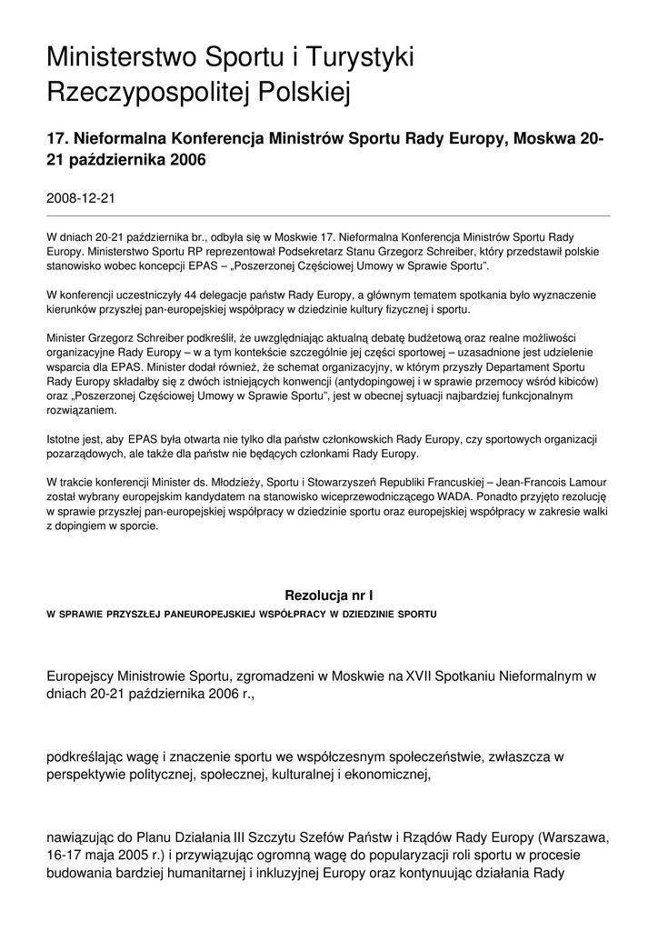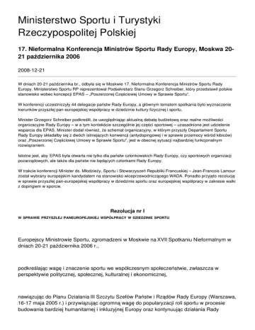 Ministerstwo Sportu i Turystyki Rzeczypospolitej Polskiej 17. Nieformalna Konferencja Ministrów Sportu Rady Europy, Moskwa 2021 października 2006 2008-12-21 W dniach 20-21 października br., odbyła się w Moskwie 17. Nieformalna Konferencja Ministrów Sportu Rady Europy. Ministerstwo Sportu RP reprezentował Podsekretarz Stanu Grzegorz Schreiber, który przedstawił polskie stanowisko wobec koncepcji EPAS – „Poszerzonej Częściowej Umowy w Sprawie Sportu”. W konferencji uczestniczyły 44 delegacje państw Rady Europy, a głównym tematem spotkania było wyznaczenie kierunków przyszłej pan-europejskiej współpracy w dziedzinie kultury fizycznej i sportu. Minister Grzegorz Schreiber podkreślił, że uwzględniając aktualną debatę budżetową oraz realne możliwości organizacyjne Rady Europy – w a tym kontekście szczególnie jej części sportowej – uzasadnione jest udzielenie wsparcia dla EPAS. Minister dodał również, że schemat organizacyjny, w którym przyszły Departament Sportu Rady Europy składałby się z dwóch istniejących konwencji (antydopingowej i w sprawie przemocy wśród kibiców) oraz „Poszerzonej Częściowej Umowy w Sprawie Sportu”, jest w obecnej sytuacji najbardziej funkcjonalnym rozwiązaniem. Istotne jest, aby EPAS była otwarta nie tylko dla państw członkowskich Rady Europy, czy sportowych organizacji pozarządowych, ale także dla państw nie będących członkami Rady Europy. W trakcie konferencji Minister ds. Młodzieży, Sportu i Stowarzyszeń Republiki Francuskiej – Jean-Francois Lamour został wybrany europejskim kandydatem na stanowisko wiceprzewodniczącego WADA. Ponadto przyjęto rezolucję w sprawie przyszłej pan-europejskiej współpracy w dziedzinie sportu oraz europejskiej współpracy w zakresie walki z dopingiem w sporcie. Rezolucja nr I W SPRAWIE PRZYSZŁEJ PANEUROPEJSKIEJ WSPÓŁPRACY W DZIEDZINIE SPORTU Europejscy Ministrowie Sportu, zgromadzeni w Moskwie na XVII Spotkaniu Nieformalnym w dniach 20-21 października 2006 r., podkreślając wagę i znaczenie sportu we współczesnym społeczeństwie, zwłaszcza w perspektywie politycznej, społecznej, kulturalnej i ekonomicznej, nawiązując do Planu Działania III Szczytu Szefów Państw i Rządów Rady Europy (Warszawa, 16-17 maja 2005 r.) i przywiązując ogromną wagę do popularyzacji roli sportu w procesie budowania bardziej humanitarnej i inkluzyjnej Europy oraz kontynuując działania Rady Europy, służące jako punkty odniesienia w dziedzinie sportu, pamiętając o wynikach 50. rocznicy Europejskiej Konwencji Kulturalnej, na podstawie której Rada Europy od wielu lat zapewnia platformę współpracy międzyrządowej w sprawach związanych ze sportem, świadomi ogromu prac już zrealizowanych przez Komitet ds. Rozwoju Sportu w zakresie formułowania polityk służących do wspierania paneuropejskiej współpracy w dziedzinie sportu, uznając, że ta współpraca, obejmująca cały kontynent, doprowadziła do uchwalenia kluczowych tekstów dla krajowej i międzynarodowej polityki dotyczącej sportu, w tym trzech traktatów, Europejskiej Karty Sportu i Europejskiego Kodeksu Etyki Sportowej oraz innych cennych dokumentów przedstawiających wkład sportu do współczesnego społeczeństwa, zgadzając się, że dorobek („acquis”) stanowi solidną podstawę do rozwoju przyszłych programów współpracy w dziedzinie sportu w Radzie Europy, potwierdzając znaczenie, jakie dla przyszłości europejskiej współpracy w dziedzinie sportu mają bliskie więzy Unii Europejskiej i Rady Europy, podkreślając, jak ważne jest unikanie dublowania działań prowadzonych w ramach programów prac Unii Europejskiej i Rady Europy w dziedzinie sportu, wyrażając przekonanie, iż istnieje potrzeba ustalenia możliwych, nowych dróg współpracy paneuropejskiej, poszukiwania nowych stosunków partnerskich w dziedzinie sportu oraz konieczność określenia takiej współpracy w ramach Rady Europy, po zbadania studium wykonalności porozumienia w sprawie sportu, przyjmują rezolucję dotyczącą: PRZYJĘCIA z zadowoleniem wyników osiągniętych przez Doraźny Komitet ds. porozumienia w sprawie sportu (CAHAS) Rady Europy, zwłaszcza studium wykonalności porozumienia w sprawie sportu oraz poszerzonej częściowej umowy w sprawie sportu (EPAS), WEZWANIA Rady Europy do kontynuacji prac w zakresie paneuropejskiej współpracy w dziedzinie sportu, w szczególności współpracy dotyczącej polityki sportowej Rady Europy oraz kontynuacji spotkań ministerialnych, WEZWANIA Komitetu Ministrów, zgodnie z postanowieniami Planu Działania III Szczytu, do podjęcia odpowiednich kroków dla zapewnienia, aby Rada Europy w sposób systematyczny i adekwatny kontynuowała swoje poparcie dla prac dwóch Konwencjonalnych Komitetów ds. sportu [(Europejska Konwencja dotycząca przemocy wśród kibiców i niewłaściwego zachowania na imprezach sportowych, zwłaszcza meczach piłki nożnej (T-RV) oraz Konwencja Antydopingowa (T-DO)], dla dobra Europejczyków i rządów państw członkowskich, zgodnie z własnymi wartościami i misją, WEZWANIA Komitetu Ministrów do rozważenia wniosków ze studium wykonalności porozumienia w sprawie sportu w celu ustanowienia poszerzonej częściowej umowy w sprawie sportu (EPAS), do której będą mogły przystąpić państwa członkowskie Rady Europy, inne państwa trzecie oraz, odpowiednio, organizacje międzynarodowe, ruchy sportowe i organizacje pozarządowe, ZWRÓCENIA UWAGI, że kilka krajów woli utrzymanie Komitetu ds. Rozwoju Sportu, jednakże, mając świadomość potrzeby przystosowania wcześniejszych struktur do nowych wyzwań, jakie niesie ze sobą przyszła współpraca paneuropejska w dziedzinie sportu, wezwania państw członkowskich Rady Europy do poparcia szybkiego ustanowienia poszerzonej częściowej umowy w sprawie sportu (EPAS) oraz rozważenia jak najszybszego przystąpienia do niej, WEZWANIA międzynarodowych federacji sportowych, ab
