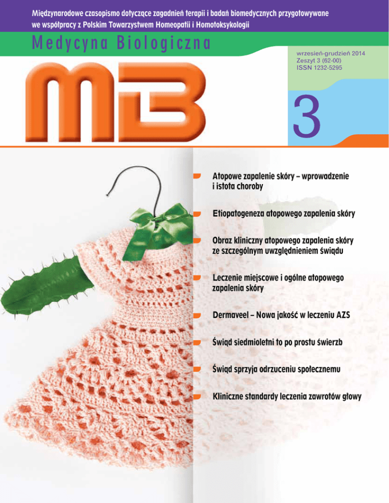 Międzynarodowe czasopismo dotyczące zagadnień terapii i badań biomedycznych przygotowywane we współpracy z Polskim Towarzystwem Homeopatii i Homotoksykologii Medycyna Biologiczna wrzesień-grudzień 2014 Zeszyt 3 (62-00) ISSN 1232-5295 3 Atopowe zapalenie skóry – wprowadzenie i istota choroby Etiopatogeneza atopowego zapalenia skóry Obraz kliniczny atopowego zapalenia skóry ze szczególnym uwzględnieniem świądu Leczenie miejscowe i ogólne atopowego zapalenia skóry Dermaveel – Nowa jakość w leczeniu AZS Świąd siedmioletni to po prostu świerzb Świąd sprzyja odrzuceniu społecznemu Kliniczne standardy leczenia zawrotów głowy plus Różne przyczyny… NOWOŚĆ na plus! jedno ukojenie PLE DOU RO NE ST K WYŁĄCZN ZA PI IE E Z PRZ Rp SU L KAR E Viburcol® plus w kroplach: nowy dodatkowy składnik nowe możliwości wzmocnione działanie Viburcol® plus, krople doustne, roztwór Homeopatyczny produkt leczniczy ze wskazaniami leczniczymi. Skład: 1 pojemnik jednodawkowy (1 g) zawiera: Atropa bella-donna D6 11,0 mg; Calcium carbonicum Hahnemanni D8 75,0 mg; Matricaria recutita D4 25,0 mg; Plantago major D4 25,0 mg; Pulsatilla pratensis D6 50,0 mg; Solanum dulcamara D6 25,0 mg. Wskazania: Wspomagająco w stanach niepokoju u niemowląt i małych dzieci, przebiegających z gorączką lub bez gorączki, występujących w przebiegu np. ząbkowania, kolki niemowlęcej lub przeziębienia. Dawkowanie i sposób podawania: Dorośli i dzieci od 12. roku życia: 1 fiolka 3 razy dziennie. Dzieci od 6. do 12. roku życia: 10 kropli 3 razy dziennie. Dzieci od 2. do 5. roku życia: 5-10 kropli 3 razy dziennie. Dzieci od 3. miesiąca do 2. roku życia: 5 kropli 3 razy dziennie. Podane dawkowanie nie opiera się na wynikach badań, ale na długotrwałej praktyce medycznej. Przeciwwskazania: Nadwrażliwość na którąkolwiek z substancji czynnych lub pomocniczych zawartych w produkcie leczniczym. Nadwrażliwość na rumianek (Matricaria recutita) lub rośliny z rodziny astrowatych (Asteraceae, dawniej Compositae). Specjalne ostrzeżenia i środki ostrożności dotyczące stosowania: Brak jest wystarczających danych pozwalających na stosowanie u dzieci poniżej 3. miesiąca życia. Stosowanie u dzieci powyżej 3. miesiąca życia nie opiera się na wynikach badań, ale na długotrwałej praktyce medycznej. Dlatego decyzja o zastosowaniu produktu, szczególnie u niemowląt i małych dzieci, powinna być dokładnie rozważona. Działania niepożądane: W bardzo rzadkich przypadkach (< 1:10000) mogą pojawić się skórne reakcje alergiczne. Podmiot odpowiedzialny: Heel Polska Sp. z o.o. Numer pozwolenia na dopuszczenie do obrotu: 21413. Rodzaje opakowania: Plastikowy pojemnik (fiolka) zawierający 1 ml roztworu. 15 sztuk w kartoniku. Spis treści Temat numeru Atopowe zapalenie skóry – wprowadzenie i istota choroby 62 Etiopatogeneza atopowego zapalenia skóry 64 Obraz kliniczny atopowego zapalenia skóry ze szczególnym uwzględnieniem świądu 68 Leczenie miejscowe i ogólne atopowego zapalenia skóry 72 Dermaveel – Nowa jakość w leczeniu AZS 78 Prof. dr hab. n. med. Roman Nowicki, dr n. med. Monika Sikorska Katedra i Klinika Dermatologii, Wenerologii i Alergologii Gdańskiego Uniwersytetu Medycznego Prof. dr hab. n. med. Roman Nowicki, dr n. med. Monika Sikorska Katedra i Klinika Dermatologii, Wenerologii i Alergologii Gdańskiego Uniwersytetu Medycznego Prof. dr hab. n. med. Roman Nowicki, dr n. med. Monika Sikorska Katedra i Klinika Dermatologii, Wenerologii i Alergologii Gdańskiego Uniwersytetu Medycznego Prof. dr hab. n. med. Roman Nowicki, dr n. med. Monika Sikorska Katedra i Klinika Dermatologii, Wenerologii i Alergologii Gdańskiego Uniwersytetu Medycznego Lek. med. Anita Bania, internista, specjalista medycyny sportowej, lekarz medycyny estetycznej Obserwacje kliniczne Kliniczne standardy leczenia zawrotów głowy. Czy znajdzie się w nich miejsce dla leków z obszaru medycyny komplementarnej? 79 Prof. zw. dr hab. n. med. Alina Morawiec-Sztandera, kierownik Kliniki Chirurgii Nowotworów Głowy i Szyi II Katedra Otolaryngologii, Uniwersytet Medyczny w Łodzi Doniesienia naukowe Świąd siedmioletni to po prostu świerzb 88 Spożycie owoców a ryzyko rozwoju cukrzycy typu 2. Wyniki trzech prospektywnych badań kohortowych 88 Świąd sprzyja odrzuceniu społecznemu 90 Opracowano przez lek. med. Anita Bania na podstawie: A. Woźniacka, Świąd skóry – częsta dolegliwość, Medycyna po Dyplomie, styczeń 2013; 69-72. Opracowano przez lek. med. Anita Bania na podstawie: Isao Muraki i wsp. Fruit consumption and risk of type 2 diabetes: results from three prospective longitudinal cohort studies, BMJ 2013; 347: 5001. Opracowano przez lek. med. Anita Bania na podstawie wywiadu udzielonego przez prof. Jacka Szepietowskiego – „Świąd sprzyja odrzuceniu społecznemu”; PTD; Z życia PTD i środowiska; 21.01.2014. Rada Naukowa: Redaktor Naczelna: Rada Redakcyjna: Adres redakcji i wydawcy: prof. dr Hartmut Heine, Baden-Baden Anita Bania dr Izabela Fołta, dr Witold Wandel, dr Mieczysław Bąkowski, Izabela Jagodzik, Paweł Filipek, Anna Legun, Katarzyna Miler-Matuszewska Heel Polska Sp. z o.o., 02-822 Warszawa, ul. Poleczki 21, tel.: (22) 545 07 15; fax: (22) 545 07 18. „Medycyna Biologiczna” jest periodykiem ukazującym się od 1994 r. „MB” zamieszcza prace autorów polskich i zagranicznych, prowadzi wymianę artykułów z „Journal of Biomedical Therapy”. Prace są recenzowane. ISSN 1232-5295 Drodzy Czytelnicy, Realizujemy swoje przedsięwzięcia, cele, zapowiedzi, cały czas poruszając się w obszarach klinicznych dotyczących skóry oraz dzieci. Tym razem przygotowaliśmy dla Państwa solidną pigułkę wiedzy na temat atopowego zapalenia skóry (AZS). Atopowe zapalenie skóry jest przewlekłą, nawrotową, zapalną chorobą, która cechuje się wybitnym świądem oraz typowym umiejscowieniem i morfologią zmian skórnych współistniejącą z innymi chorobami a