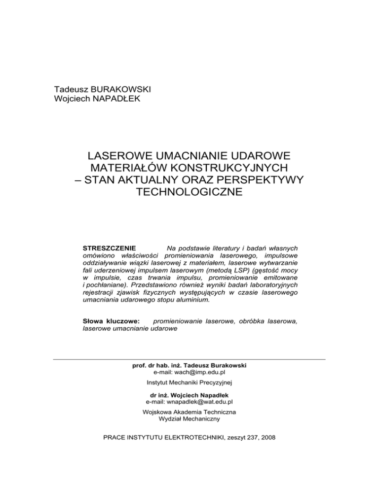 Tadeusz BURAKOWSKI Wojciech NAPADŁEK LASEROWE UMACNIANIE UDAROWE MATERIAŁÓW KONSTRUKCYJNYCH – STAN AKTUALNY ORAZ PERSPEKTYWY TECHNOLOGICZNE STRESZCZENIE Na podstawie literatury i badań własnych omówiono właściwości promieniowania laserowego, impulsowe oddziaływanie wiązki laserowej z materiałem, laserowe wytwarzanie fali uderzeniowej impulsem laserowym (metodą LSP) (gęstość mocy w impulsie, czas trwania impulsu, promieniowanie emitowane i pochłaniane). Przedstawiono również wyniki badań laboratoryjnych rejestracji zjawisk fizycznych występujących w czasie laserowego umacniania udarowego stopu aluminium. Słowa kluczowe: promieniowanie laserowe, obróbka laserowa, laserowe umacnianie udarowe prof. dr hab. inż. Tadeusz Burakowski e-mail: [email protected] Instytut Mechaniki Precyzyjnej dr inż. Wojciech Napadłek e-mail: [email protected] Wojskowa Akademia Techniczna Wydział Mechaniczny PRACE INSTYTUTU ELEKTROTECHNIKI, zeszyt 237, 2008 46 T. Burakowski, W. Napadłek 1. PROMIENIOWANIE LASEROWE Promieniowanie laserowe jest czystą formą energii, dlatego jest idealnym narzędziem do obróbki materiałów, gdyż nie zawiera żadnych domieszek, które mogłyby zmienić skład chemiczny obrabianego materiału. Promieniowanie świetlne (fotonowe, optyczne) jest multichromatycznym promieniowaniem elektromagnetycznym zakresu widzialnego i niewidzialnego (nadfioletu i podczerwieni), emitowanym przez ciała nagrzane do temperatury niższej lub wyżej niż temperatura topnienia (tzw. promieniowanie temperaturowe) lub – znacznie rzadziej – nie nagrzane, ale emitowane w wyniku reakcji chemicznych (tzw. promieniowanie luminescencyjne). Promieniowanie świetlne rozchodzi się w różnych kierunkach, ale można je za pomocą zwierciadeł kierować w określoną stronę lub za pomocą zwierciadeł i soczewek skupiać w określonym miejscu. W skrajnych przypadkach skupione w ognisku promieniowanie może nagrzać materiał nawet do kilku tysięcy kelwinów (np. w piecach słonecznych); przemysłowo wykorzystuje się temperatury znacznie niższe [2]. Promieniowanie laserowe jest specjalnym promieniowaniem świetlnym wyróżniającym się: – emisją kierunkową w postaci wiązki o bardzo małej rozbieżności rzędu nawet dziesiątych części mikroradiana; – ścisłą monochromatycznością dochodzącą do 10-6 μm; – koherencją, czyli spójnością – zgodnością fazową w przestrzeni i w czasie. Dzięki tym właściwościom, których nie posiada promieniowanie świetlne nielaserowe, promieniowanie laserowe w kontakcie z ośrodkiem (materiałem) wyróżnia się szeregiem właściwości niemożliwych do uzyskania przy wykorzystaniu innego promieniowania, z których najważniejsza jest gigantyczna gęstość mocy doprowadzonej do obrabianego materiału dochodząca do 106 W/cm2 dla promieniowania ciągłego i – wyjątkowo – do 1011 W/cm2 (a nawet więcej) dla promieniowania impulsowego. Ta gęstość mocy może być doprowadzona do obszaru o małej i bardzo małej powierzchni (średnica plamki laserowej może wynosić od kilku μm do kilkunastu mm) w ściśle wybrane miejsce, w wybranym czasie i w wybranej ilości. Inne metody nie dają takich możliwości [6, 8]. Lasery służą do generowania głównie promieniowania świetlnego, a także rentgenowskiego i gamma. W areologii*) znajdują zastosowanie lasery o pracy ciągłej i impulsowej. Do umacniania udarowego stosowane są wyłącznie lasery o pracy impulsowej. *) Areologia – dział nauki zajmujący się badaniem procesów i zjawisk zachodzących w warstwach wierzchnich i powłokach wyrobów, ich projektowaniem, wytwarzaniem i użytkowaniem; odpowiada dotychczasowemu pojęciu „inżynieria powierzchni”. Laserowe umacnianie udarowe materiałów kostrukcyjnych... 47 2. IMPULSOWE ODDZIAŁYWANIE WIĄZKI LASEROWEJ Z MATERIAŁEM Oddziaływanie wiązki laserowej z materiałem zależy od wzajemnych relacji właściwości promieniowania laserowego i właściwości materiału obrabianego. Promieniowanie laserowe charakteryzują głównie: długość fali λ, gęstość mocy q i wielkość oraz kształt plamki laserowej d. Promieniowanie impulsowe charakteryzuje ponadto wartość energii lub gęstość energii w impulsie ge, czas trwania impulsu τ („tau”), częstotliwość repetycji impulsów f i liczba impulsów. Ważny jest również rozkład gęstości mocy w plamce laserowej. Do laserowego umacniania udarowego stosowane są wyłącznie lasery o pracy impulsowej, zwykle laser Nd:YAG (generujący wiązkę o długości fali λ = 1,0641 μm w zakresie podczerwieni oraz harmoniczne 0,532; 0,355 i 0,266 μm o długości impulsu τ = 0,1÷100 ns i częstotliwości impulsów f = 50 kHz lub ekscymerowy zakres nadfioletu). Energia w impulsie dochodzi do 200 J i więcej [1]. Dla właściwości określonego materiału najważniejsze to: temperatura przemian fazowych, temperatura topnienia i parowania, współczynnik absorpcji promieniowania (chropowatość powierzchni, utlenianie, powłoka absorpcyjna), współczynnik przewodzenia ciepła. Ścisłe wzajemne relacje całościowe między właściwościami promieniowania a właściwościami materiału nie są znane. Znane są natomiast jakościowe zależności między niektórymi właściwościami. Na przykład wiadomo, że [6]: – ze wzrostem współczynnika absorpcji promieniowania przez warstwę wierzchnią materiału rośnie stopień nagrzania materiału, ale absorpcja promieniowania zależy od długości fali λ i temperatury materiału; – ze wzrostem gęstości mocy q i czasu jej oddziaływania rośnie stopień nagrzania materiału (aż do parowania włącznie); – gaussowski rozkład gęstości mocy w przekroju poprzecznym wiązki laserowej, zwłaszcza w plamce laserowej jest korzystny dla laserowego cięcia, spawania, drążenia otworów, ale mniej korzystny dla zastosowań areologicznych, gdzie wymagany jest rozkład bardziej równomierny. Nie bardzo jeszcze dokł