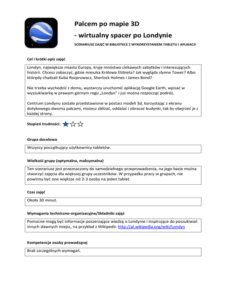 Palcem po mapie 3D - wirtualny spacer po Londynie SCENARIUSZ ZAJĘĆ W BIBLIOTECE Z WYKORZYSTANIEM TABLETU I APLIKACJI Cel i krótki opis zajęć Londyn, największe miasto Europy, kryje mnóstwo ciekawych zabytków i interesujących historii. Chcesz zobaczyć, gdzie mieszka Królowa Elżbieta? Jak wygląda słynne Tower? Albo którędy chadzali Kuba Rozpruwacz, Sherlock Holmes i James Bond? Nie trzeba wychodzić z domu, wystarczy uruchomić aplikację Google Earth, wpisać w wyszukiwarkę w prawym górnym rogu „Londyn” i już można rozpocząć podróż. Centrum Londynu zostało przedstawione w postaci modeli 3d, korzystając z ekranu dotykowego dwoma palcami, możesz zbliżać, oddalać i obracać budynki, tak by obejrzeć je z każdej strony. Stopień trudności: Grupa docelowa Wszyscy początkujący użytkownicy tabletów. Wielkość grupy (optymalna, maksymalna) Ten scenariusz jest przeznaczony do samodzielnego przeprowadzenia, na jego bazie można stworzyć zajęcia dla większej grupy uczestników. W przypadku pracy w grupach, nie powinny być one większe niż 2-3 osoby na jeden tablet. Czas zajęć Około 30 minut. Wymagania techniczno-organizacyjne/Składniki zajęć Pomocne mogą być informacje poszerzające wiedzę o Londynie i inspirujące do poszukiwań innych sławnych miejsc, na przykład z Wikipedii: http://pl.wikipedia.org/wiki/Londyn Kompetencje osoby prowadzącej Brak szczególnych wymagań. Przebieg zajęć Włącz tablet i odnajdź ikonkę Google Earth. Uruchom aplikację. W prawym górnym rogu znajduje się wyszukiwarka, wpisz w niej Londyn i kilknij w lupę. Widok mapy przesunie się nad Londyn. Upewnij się, że masz włączoną opcję oglądania budynków w 3D: kliknij na menu w lewym górnym rogu (ikonka wyglądająca jak trzy poziome linie). Żeby go zwinąć, wystarczy kliknąć drugi raz na tę ikonę. Teraz możesz rozpocząć podróż po Londynie – dwoma palcami możesz przybliżać i okręcać mapę. Spróbuj znaleźć budynek Tower i Buckingam. Zobacz, jak blisko można przybliżyć budynki i jak działa oglądanie ich pod różnym kątem. Po wykonaniu ćwiczenia spróbuj zastanowić się: Czy jesteś zadowolona/y z osiągniętego wyniku? Które elementy ćwiczenia były najłatwiejsze, a które najtrudniejsze? Jak Ci się podoba koncepcja wirtualnych podróży 3D? Czy takie zajęcia spodobałyby się użytkownikom Twojej biblioteki? Oczywiście aplikacja Google Earth może zostać wykorzystana na wiele innych sposobów. W menu znajdziesz inne opcje modyfikujące widok map i dodające kolejne warstwy z informacjami takimi jak nazwy ulic, informacje z wikipedii, które są dołączone do istotnych elementów mapy, a także zdjęcia z Panoramio – które są dodawane przez osoby będące fizycznie w danym miejscu. Możliwe modyfikacje zajęć Podobny scenariusz można przeprowadzić dla innych miast, np. Paryża lub innych miejsc na świecie. Wątkiem przewodnim zajęć może być także podróż marzeń – czyli odwiedzenie w przestrzeni wirtualnej miejsc, które chciałoby się zobaczyć na żywo albo miejsc, które widziało się przed laty. Oczekiwane rezultaty zajęć i sposoby weryfikacji Celem zajęć jest poszerzenie wiedzy na temat aplikacji Google Earth, rozbudzenie ciekawości i oswojenie z posługiwaniem się ekranem dotykowym iPada.
