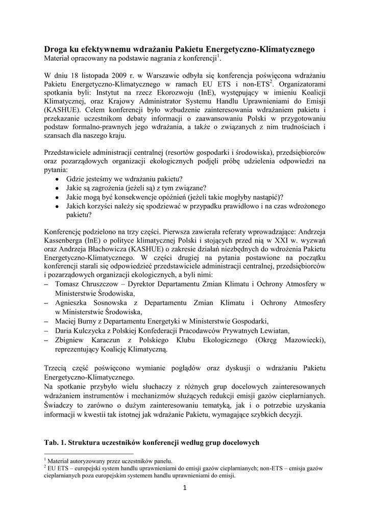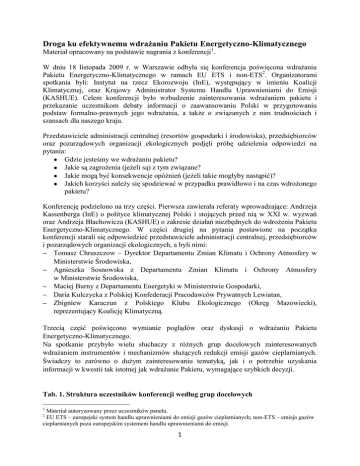 Droga ku efektywnemu wdrażaniu Pakietu Energetyczno-Klimatycznego Materiał opracowany na podstawie nagrania z konferencji1. W dniu 18 listopada 2009 r. w Warszawie odbyła się konferencja poświęcona wdrażaniu Pakietu Energetyczno-Klimatycznego w ramach EU ETS i non-ETS2. Organizatorami spotkania byli: Instytut na rzecz Ekorozwoju (InE), występujący w imieniu Koalicji Klimatycznej, oraz Krajowy Administrator Systemu Handlu Uprawnieniami do Emisji (KASHUE). Celem konferencji było wzbudzenie zainteresowania wdrażaniem pakietu i przekazanie uczestnikom debaty informacji o zaawansowaniu Polski w przygotowaniu podstaw formalno-prawnych jego wdrażania, a także o związanych z nim trudnościach i szansach dla naszego kraju. Przedstawiciele administracji centralnej (resortów gospodarki i środowiska), przedsiębiorców oraz pozarządowych organizacji ekologicznych podjęli próbę udzielenia odpowiedzi na pytania: Gdzie jesteśmy we wdrażaniu pakietu? Jakie są zagrożenia (jeżeli są) z tym związane? Jakie mogą być konsekwencje opóźnień (jeżeli takie mogłyby nastąpić)? Jakich korzyści należy się spodziewać w przypadku prawidłowo i na czas wdrożonego pakietu? Konferencję podzielono na trzy części. Pierwsza zawierała referaty wprowadzające: Andrzeja Kassenberga (InE) o polityce klimatycznej Polski i stojących przed nią w XXI w. wyzwań oraz Andrzeja Błachowicza (KASHUE) o zakresie działań niezbędnych do wdrożenia Pakietu Energetyczno-Klimatycznego. W części drugiej na pytania postawione na początku konferencji starali się odpowiedzieć przedstawiciele administracji centralnej, przedsiębiorców i pozarządowych organizacji ekologicznych, a byli nimi: Tomasz Chruszczow – Dyrektor Departamentu Zmian Klimatu i Ochrony Atmosfery w Ministerstwie Środowiska, Agnieszka Sosnowska z Departamentu Zmian Klimatu i Ochrony Atmosfery w Ministerstwie Środowiska, Maciej Burny z Departamentu Energetyki w Ministerstwie Gospodarki, Daria Kulczycka z Polskiej Konfederacji Pracodawców Prywatnych Lewiatan, Zbigniew Karaczun z Polskiego Klubu Ekologicznego (Okręg Mazowiecki), reprezentujący Koalicję Klimatyczną. Trzecią część poświęcono wymianie poglądów oraz dyskusji o wdrażaniu Pakietu Energetyczno-Klimatycznego. Na spotkanie przybyło wielu słuchaczy z różnych grup docelowych zainteresowanych wdrażaniem instrumentów i mechanizmów służących redukcji emisji gazów cieplarnianych. Świadczy to zarówno o dużym zainteresowaniu tematyką, jak i o potrzebie uzyskania informacji w kwestii tak istotnej jak wdrażanie Pakietu, wymagające szybkich decyzji. Tab. 1. Struktura uczestników konferencji według grup docelowych 1 Materiał autoryzowany przez uczestników panelu. EU ETS – europejski system handlu uprawnieniami do emisji gazów cieplarnianych; non-ETS – emisja gazów cieplarnianych poza europejskim systemem handlu uprawnieniami do emisji. 2 1 Liczba osób lub instytucji Grupy docelowe Administracja centralna Ministerstwo Środowiska, Ministerstwo Gospodarki, Ministerstwo Finansów, MRR, MRiRW, NFOŚiGW, URE, GUS, KASHUE, KPRP, 22 Biuro ds. UE KIG Administracja lokalna Urząd Miasta St. Warszawy, Urząd Marszałkowski Województwa 5 Mazowieckiego, Urząd Miasta Lublin Sektor energetyczny Instytucje lub przedsiębiorstwa zajmujące się organizacją rynku, 12 dostawcy i odbiorcy energii, m.in.: PGNiG, PGE Electra, Przedsiębiorstwo Energetyki Cieplnej w Ciechanowie Organizacje ekologiczne Instytucje zajmujące się problematyką ochrony środowiska i zmianami 8 klimatycznymi, m.in.: Koalicja Klimatyczna, WWF Polska, Polska Zielona Sieć Uczelnie Politechnika Warszawska, Szkoła Główna Gospodarstwa Wiejskiego w 6 Warszawie, Wyższa Szkoła Ekonomiczna w Białymstoku, Uniwersytet Marii Curie-Skłodowskiej w Lublinie, Akademia TechnicznoHumanistyczna w Bielsku-Białej Inni m.in.: biznes nieenergetyczny, instytucje społeczne i gospodarcze 12 OGÓŁEM 65 Konferencję rozpoczął kierownik Krajowego Administratora Systemu Handlu Uprawnieniami do Emisji (KASHUE – współorganizator konferencji) oraz Krajowego Ośrodka Bilansowania i Zarządzania Emisjami (KOBiZE) Wojciech Jaworski, przedstawiając cele polityki klimatycznej UE do 2020 r. ustanowione przez Pakiet Energetyczno-Klimatyczny. Pakiet powinien był zachęcić inne kraje świata do przyjęcia ambitnych polityk klimatycznych – tak się jednak nie stało, a to niedobry zwiastun przed konferencją klimatyczną w Kopenhadze. Zdaniem Wojciecha Jaworskiego nie możemy sobie jednak pozwolić na bezczynność – pierwszy krok to rzetelna i szczera dyskusja pomiędzy ekspertami rządowymi a interesariuszami, m.in. z organizacji pozarządowych i przemysłu. Część pierwsza: Referaty wprowadzające 2 Wystąpienie Prezesa InE (współorganizatora konferencji) Andrzeja Kassenberga „Polityka klimatyczna Polski – wyzwanie XXI wieku” miało na celu przybliżenie opracowania, które – pod takim samym tytułem – zostało przygotowane w Instytucie na rzecz Ekorozwoju, a wydane przez Polski Klub Ekologiczny Okręg Mazowiecki. Publikacja ta w pierwszej części odnosi się do polityki klimatycznej Polski w ostatnich 20 latach i pokazuje, co udało się zrealizować, a co jeszcze wymaga pracy. Drugą jej część poświęcono wyzwaniom stojącym przed nami i zadaniom niezbędnym do osiągnięcia celu. Twórcom publikacji towarzyszyło przeświadczenie, że przyjęta w 2003 r. polityka klimatyczna nie w pełni odpowiada wymaganiom unijnym i zmieniającym się ustaleniom w sprawie handlu uprawnieniami do emisji, wobec czego niezbędna jest jej rewizja. Mówca podkreślił, że choć spadek emisji z 563 mln ton CO2eq w roku 1988 do poniżej 400 w roku 2007 (czyli o 29%) jest znaczący, to nadal emisja na mieszkańca jest 5 razy większa od niezbędnej do stabilizacji klimatu. Obecnie udział Polski w światowej emisji gazów cieplarnianych spadł z 1,46% w roku 1988 do 0,78% w roku 2004. Należ