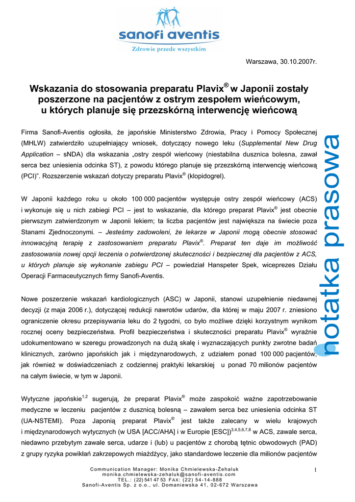 Warszawa, 30.10.2007r. Wskazania do stosowania preparatu Plavix® w Japonii zostały poszerzone na pacjentów z ostrym zespołem wieńcowym, u których planuje się przezskórną interwencję wieńcową Firma Sanofi-Aventis ogłosiła, że japońskie Ministerstwo Zdrowia, Pracy i Pomocy Społecznej (MHLW) zatwierdziło uzupełniający wniosek, dotyczący nowego leku (Supplemental New Drug Application – sNDA) dla wskazania „ostry zespół wieńcowy (niestabilna dusznica bolesna, zawał serca bez uniesienia odcinka ST), z powodu którego planuje się przezskórną interwencję wieńcową (PCI)”. Rozszerzenie wskazań dotyczy preparatu Plavix® (klopidogrel). W Japonii każdego roku u około 100 000 pacjentów występuje ostry zespół wieńcowy (ACS) i wykonuje się u nich zabiegi PCI – jest to wskazanie, dla którego preparat Plavix® jest obecnie pierwszym zatwierdzonym w Japonii lekiem; ta liczba pacjentów jest największa na świecie poza Stanami Zjednoczonymi. – Jesteśmy zadowoleni, że lekarze w Japonii mogą obecnie stosować innowacyjną terapię z zastosowaniem preparatu Plavix®. Preparat ten daje im możliwość zastosowania nowej opcji leczenia o potwierdzonej skuteczności i bezpiecznej dla pacjentów z ACS, u których planuje się wykonanie zabiegu PCI – powiedział Hanspeter Spek, wiceprezes Działu Operacji Farmaceutycznych firmy Sanofi-Aventis. Nowe poszerzenie wskazań kardiologicznych (ASC) w Japonii, stanowi uzupełnienie niedawnej decyzji (z maja 2006 r.), dotyczącej redukcji nawrotów udarów, dla której w maju 2007 r. zniesiono ograniczenie okresu przepisywania leku do 2 tygodni, co było możliwe dzięki korzystnym wynikom rocznej oceny bezpieczeństwa. Profil bezpieczeństwa i skuteczności preparatu Plavix® wyraźnie udokumentowano w szeregu prowadzonych na dużą skalę i wyznaczających punkty zwrotne badań klinicznych, zarówno japońskich jak i międzynarodowych, z udziałem ponad 100 000 pacjentów, jak również w doświadczeniach z codziennej praktyki lekarskiej u ponad 70 milionów pacjentów na całym świecie, w tym w Japonii. Wytyczne japońskie1,2 sugerują, że preparat Plavix® może zaspokoić ważne zapotrzebowanie medyczne w leczeniu pacjentów z dusznicą bolesną – zawałem serca bez uniesienia odcinka ST (UA-NSTEMI). Poza Japonią preparat Plavix® jest także zalecany i międzynarodowych wytycznych (w USA [ACC/AHA] i w Europie [ESC]) 3,4,5,6,7,8 w wielu krajowych w ACS, zawale serca, niedawno przebytym zawale serca, udarze i (lub) u pacjentów z chorobą tętnic obwodowych (PAD) z grupy ryzyka powikłań zakrzepowych miażdżycy, jako standardowe leczenie dla milionów pacjentów Communication Manager: Monika Chmielewska-Żehaluk [email protected] T E L . : ( 22) 541 47 53 F A X : ( 2 2 ) 5 4 - 1 4 - 8 8 8 Sanofi-Aventis Sp. z o.o., ul. Domaniewska 41, 02-672 Warszawa 1 z grupy podwyższonego ryzyka kardiologicznego. Poza Japonią preparat Plavix® jest jedynym szeroko zatwierdzonym lekiem stosowanym w monoterapii, w zapobieganiu powikłaniom zakrzepowym miażdżycy, u pacjentów po niedawno przebytym zawale serca, niedawno przebytym udarze niedokrwiennym lub utrwaloną chorobą tętnic obwodowych, jak również w skojarzeniu z kwasem acetylosalicylowym w leczeniu pacjentów z ostrym zespołem wieńcowym (niestabilną dusznicą bolesną lub zawałem serca bez uniesienia odcinka ST [NSTEMI]), w tym pacjentów, u których planuje się farmakoterapię oraz tych, u których planuje się wykonanie zabiegu PCI (z założeniem stentu lub bez stentu), a także u pacjentów z zawałem serca z uniesieniem odcinka ST (STEMI). Preparat Plavix® jest jednym z najdokładniej zbadanych leków kardiologicznych dostępnych dla pacjentów, oferującym zarówno krótko- jak i długookresowe korzyści kliniczne. Po dekadzie stosowania tego preparatu, jest on doustnym lekiem przeciwpłytkowym o najszerszym zakresie wskazań na całym świecie. Informacje o leku Plavix® Preparat Plavix®, dostępny także na rynku pod nazwą Iscover®, jest lekiem przeciwpłytkowym, który zapobiega zlepianiu się płytek krwi i powstawaniu zakrzepów w tętnicach. Preparat Plavix® zarejestrowano po raz pierwszy w Stanach Zjednoczonych w 1997 r., a w Unii Europejskiej w 1998 r. Do tej pory przepisano go ponad 70 milionom pacjentów na całym świecie. W Japonii, oprócz zatwierdzenia nowego wskazania, dotyczącego ostrego zespołu wieńcowego (niestabilna dusznica bolesna, zawał serca bez uniesienia odcinka ST), z powodu którego planuje się przezskórną interwencję wieńcową (PCI), preparat Plavix® jest także zatwierdzony do „redukowania nawrotów po niedokrwiennych zaburzeniach naczyniowo-mózgowych (z wyłączeniem kardiogennego zatoru mózgowego)” – jednej z trzech głównych przyczyn zgonów w Japonii. Profil skuteczności i bezpieczeństwa preparatu Plavix® ustalono w wyznaczających punkty zwrotne badaniach klinicznych z udziałem ponad 100 000 pacjentów na całym świecie. Poza Japonią wykazano korzystny profil tolerancji preparatu Plavix®, w porównaniu z kwasem acetylosalicylowym (ASA) oraz akceptowalny wzrost częstości poważnych krwawień, gdy preparat ten był stosowany w skojarzeniu z ASA (nie zaobserwowano statystycznie istotnych różnic, gdy rozpatrywano jedynie zabiegi PCI). W Japonii preparat Plavix® został wprowadzony na rynek przez firmę Sanofi-Aventis. Informacje o ostrym zespole wieńcowym Ostry zespół wieńcowy (acute coronary syndrome – ACS) jest wspólnym terminem na określenie grupy rozpoznań klinicznych spowodowanych przez zwężenie tętnic wieńcowych i obejmuje jakąkolwiek grupę objawów klinicznych odpowiadających ostremu niedokrwieniu mięśnia sercowego, Communication Manager: Monika Chmielewska-Żehaluk [email protected] T E L . : ( 22) 541 47 53 F A X : ( 2 2 ) 5 4 - 1 4 - 8 8 8 Sanofi-Aventis Sp. z o.o., ul. Domaniewska 41, 02-672 Warszawa 2 spowodowanemu przez wynikające z choroby wieńcowej