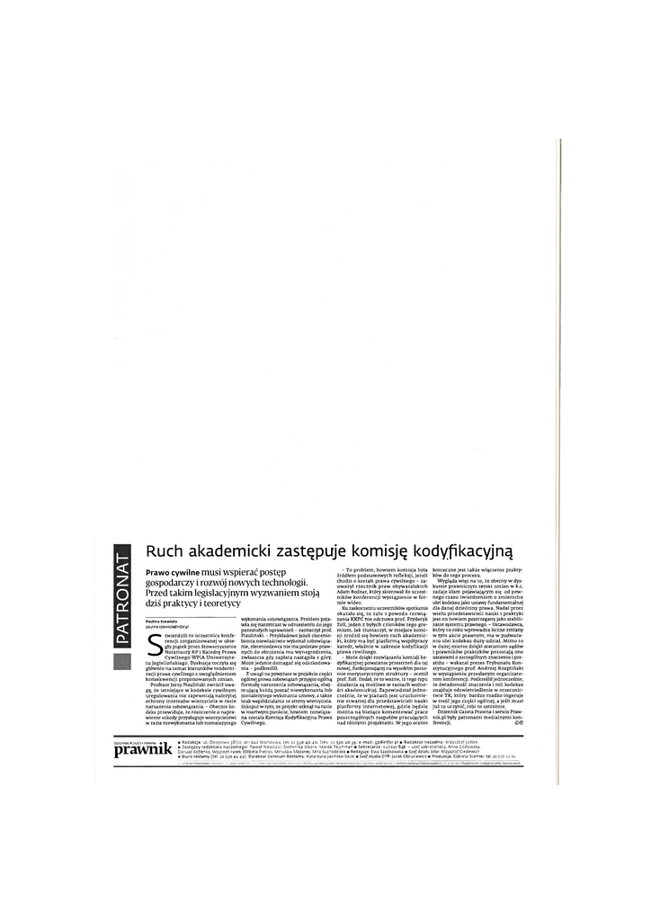 Ruch akademicki zastępuje komisję kodyfikacyjną musi wspierać postęp gospodarczy i rozwój nowych technologii. Przed takim legislacyjnym wyzwaniem stoją dziś praktycy i teoretycy Prawo cywilne wykonania zobowiązania. Problem pojawia się natomiast w odniesieniu do jego pozostałych uprawnień - zaznaczył prof. twierdzili to uczestnicy konfe- Pisuliński. - Przykładowo jeżeli zleceniorencji zorganizowanej w ubie- biorca niewłaściwie wykonał zobowiązagły piątek przez Stowarzyszenie nie, zleceniodawca nie ma podstaw prawNotariuszy RP i Katedrę Prawa nych do obniżenia mu wynagrodzenia, Cywilnego WPiA Uniwersyte- zwłaszcza gdy zapłata nastąpiła z góry. tu Jagiellońskiego. Dyskusja toczyła się Może jedynie domagać się odszkodowagłównie na temat kierunków moderni- nia - podkreślił. zacji prawa cywilnego z uwzględnieniem Z uwagi na powyższe w projekcie części konsekwencji proponowanych zmian. ogólnej prawa zobowiązań przyjęto ogólną Profesor Jerzy Pisuliński zwrócił uwa- formułę naruszenia zobowiązania, obejgę, że istniejące w kodeksie cywilnym mującą każdą postać niewykonania lub uregulowania nie zapewniają należytej nienależytego wykonania umowy, a także ochrony interesów wierzyciela w razie brak współdziałania ze strony wierzyciela. naruszenia zobowiązania. - Obecnie ko- Szkopuł w tym, że projekt utknął na razie deks przewiduje, że roszczenie o napra- w martwym punkcie, bowiem rozwiązawienie szkody przysługuje wierzycielowi na została Komisja Kodyfikacyjna Prawa w razie niewykonania lub nienależytego Cywilnego. Paulina Szewioła [email protected] S konieczne jest także włączenie praktyków do tego procesu. Wygląda więc na to, że obecny w dyskursie prawniczym temat zmian w k.c. zadaje kłam pojawiającym się od pewnego czasu twierdzeniom o zmierzchu idei kodeksu jako ustawy fundamentalnej dla danej dziedziny prawa. Nadal przez wielu przedstawicieli nauki i praktyki jest on bowiem postrzegany jako stabilizator systemu prawnego. - Ustawodawca, który co roku wprowadza liczne zmiany w tym akcie prawnym, ma w podważaniu idei kodeksu duży udział. Mimo to w dużej mierze dzięki staraniom sądów i prawników praktyków pozostają one ustawami o szczególnym znaczeniu i prestiżu - wskazał prezes Trybunału Konstytucyjnego prof. Andrzej Rzepliński w wystąpieniu przesłanym organizatorom konferencji. Podkreślił jednocześnie, że świadomość znaczenia i roli kodeksu znajduje odzwierciedlenie w orzecznictwie TK, który bardzo rzadko ingeruje w treść jego części ogólnej, a jeśli musi już to uczynić, robi to ostrożnie. Dziennik Gazeta Prawna i serwis Prawnik.pl były patronami medialnymi konferencji. ©® » Redakcja: ul. Okopowa 58/72; 0 1 - 0 4 ? Warszawa, tel. 22 530 4 0 40. faks: 22 530 4 0 39; e - m a i l : [email protected] m Redaktor naczelny: Krzysztofjedlak Zastępcy redaktora naczelnego: Paweł Nowacki. Dominika Sikora. Marek Tejchman • Sekretarze: Łukasz Bąk - szef sekretariatu, Anna Godlewska, Dariusz Koźlenko, Wojciech Łysek. Elżbieta Pietrak. Mirosław Mazanec, Mira Suchodolska • Redaguje: Ewa Szadkowska a Szef działu foto: Krzysztof Cieślewicz Biuro reklamy (tel 22 530 44 44) Dyrektor Centrum Reklamy: Katarzyna jasińska-Szulc • Szef studia DTP: Jacek Obrusiewicz • Produkcja: Elżbieta Stamler, tel. 22 prawnik s DZILNNIKfrUAZETA PRAWNA • - To problem, bowiem komisja była źródłem podstawowych refleksji, jeżeli chodzi o kształt prawa cywilnego - zauważył rzecznik praw obywatelskich Adam Bodnar, który skierował do uczestników konferencji wystąpienie w formie wideo. Ku zaskoczeniu uczestników spotkania okazało się, że żalu z powodu rozwiązania KKPC nie odczuwa prof. Fryderyk Zoll, jeden z byłych członków tego gremium. Jak tłumaczył, w miejsce komisji zrodził się bowiem ruch akademicki, który ma być platformą współpracy katedr, właśnie w zakresie kodyfikacji prawa cywilnego. - Może dzięki rozwiązaniu komisji kodyfikacyjnej powstanie przestrzeń dla tej nowej, funkcjonującej na wysokim poziomie merytorycznym struktury - ocenił prof. Zoll. Dodał, że to ważne, iż tego typu działania są możliwe w ramach wolności akademickiej. Zapowiedział jednocześnie, że w planach jest uruchomienie otwartej dla przedstawicieli nauki platformy internetowej, gdzie będzie można na bieżąco komentować prace poszczególnych zespołów pracujących nad różnymi projektami. W jego ocenie