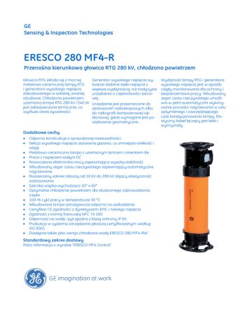 GE Sensing & Inspection Technologies ERESCO 280 MF4-R Przenośna kierunkowa głowica RTG 280 kV, chłodzona powietrzem Głowica RTG składa się z mocnej metalowo-ceramicznej lampy RTG i generatora wysokiego napięcia zabudowanego w solidnej, zwartej obudowie. Chłodzona powietrzem, uziemiona lampa RTG 280 kV /340 W jest zabezpieczona termicznie, co wydłuża okres żywotności. Generator wysokiego napięcia wytwarza stabilne stałe napięcie z większą wydajnością, niż tradycyjne urządzenia o częstotliwości sieciowej. Urządzenie jest przeznaczone do zastosowań radioskopowych albo do radiografii komputerowej lub błonowej, gdzie wymagane jest powiększenie geometryczne. Dodatkowe cechy  Odporna konstrukcja o sprawdzonej niezawodności  Sekcja wysokiego napięcia izolowana gazowo, co zmniejsza wielkość i wagę  Metalowo-ceramiczna lampa z uziemionym końcem i okienkiem Be  Praca z napięciem stałym DC  Nowoczesna elektronika mocy zapewniająca wysoką stabilność  Wbudowany zegar czasu rzeczywistego zapewniający automatyczne nagrzewanie  Rozszerzony zakres roboczy od 10 kV do 280 kV dający elastyczność zastosowania  Szeroka wiązka wychodząca 30° x 60°  Optymalne chłodzenie powietrzem dla skutecznego odprowadzania ciepła  100-% cykl pracy w temperaturze 30 °C  Wbudowana lampa ostrzegawcza odporna na uszkodzenia  Certyfikat CE zgodności z dyrektywami EMC i niskiego napięcia  Zgodność z normą francuską NFC 74 100  Odporność na wodę i pył zgodna z klasą ochrony IP 65  Produkcja w systemie zarządzania jakością certyfikowanym według ISO 9001  Dostępna także jako wersja chłodzona wodą ERESCO 280 MF4-RW Standardowy zakres dostawy Patrz informacja o wyrobie "ERESCO MF4 Control". Wydajność lampy RTG i generatora wysokiego napięcia jest w sposób ciągły monitorowana dla ochrony i bezpieczeństwa pracy. Wbudowany zegar czasu rzeczywistego umożliwia w pełni automatyczne wykonywanie procedur nagrzewania w celu optymalnego i oszczędzającego czas kondycjonowania lampy. Elastyczny kabel łączący jest lekki i wytrzymały. Dane techniczne Typ lampy RTG 280 kV, metalowo-ceramiczna z wolframową anodą Zakres kV 10 - 280 kV (zgodnie z charakterystyką mocy) Kąt celu 15° Filtracja własna 0,8 mm ± 0,1 mm, Be Wiązka wychodząca 30° x 60°, eliptyczna Wielkość plamki ogniskowej (EN 12543) 0,5 mm Prąd lampy 0,5 - 4,5 mA (1,2 mA / 280 kV) Temperatura anody, max. 100 °C Stabilność prądu i napięcia ±1 % Moc przy pracy ciągłej 340 W Moc wejściowa, max. 1,2 kVA Waga 40,0 kg (37,5 kg bez pierścieni) Średnica głowicy lampy 290 mm (225 mm bez pierścieni) Klasa ochrony IP 65 Temperatura robocza -20 do +50 °C Temperatura składowania -30 do +80 °C Opcje         Kołyska transportowa Nasadki przesłony i kolimatora Laserowe urządzenie centrujące Teleskopowe urządzenie centrujące Wózek transportowy i pozycjonujący Błyskająca lampa ostrzegawcza odporna na uszkodzenia Stojaki i zestawy montażowe Aluminiowa skrzynka transportowa Charakterystyka mocy Rysunki nie w skali. NDT System, Twardowskiego 21, 01-643 WARSZAWA tel. 022 8325030, fax 022 8339677 www.gesensinginspection.com www.ndt-system.com.pl GEIT: 30180EN (11/08) © 2008 General Electric Company. Wszelkie prawa zastrzeżone. Dane techniczne podlegają zmianie bez zawiadomienia. GE jest zastrzeżonym znakiem handlowym General Electric Company. Inne nazwy firmy lub wyrobu, wymienione w tym dokumencie mogą być znakami handlowymi lub zastrzeżonymi znakami handlowymi odpowiednich firm, które nie są związane z GE. Kontakt: GE Sensing & Inspection Technologies GmbH, Bogenstrasse 41, 22926 Ahrensburg, Niemcy, tel. +49 4102 807 0