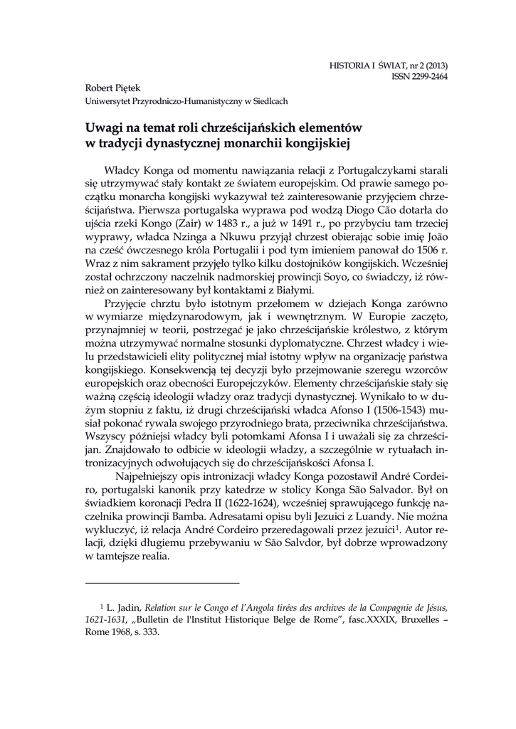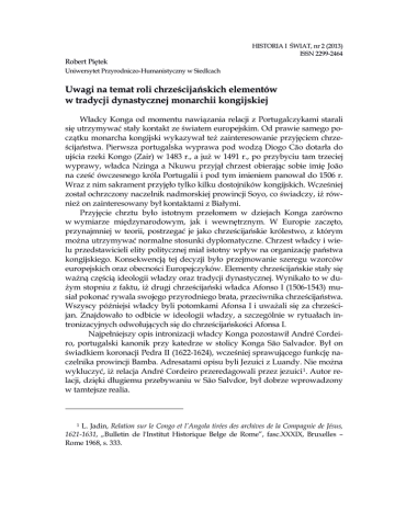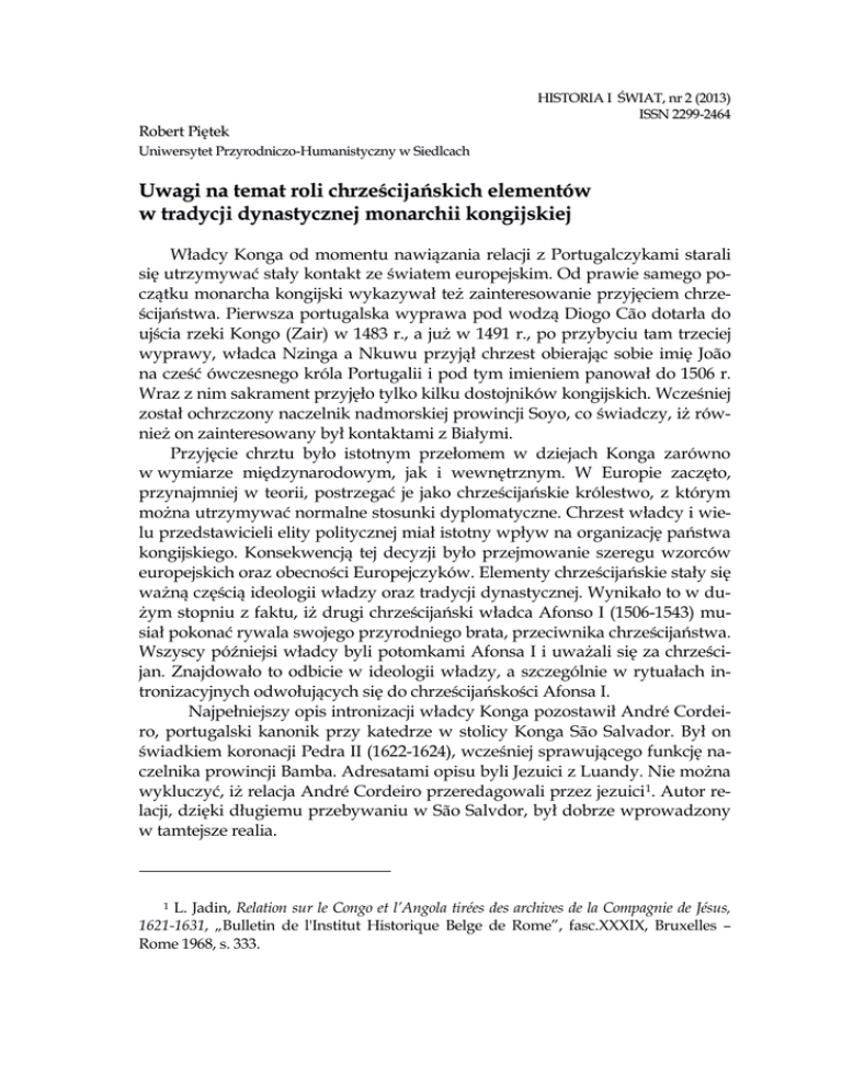 Robert Piętek HISTORIA I ŚWIAT, nr 2 (2013) ISSN 2299-2464 Uniwersytet Przyrodniczo-Humanistyczny w Siedlcach Uwagi na temat roli chrześcijańskich elementów w tradycji dynastycznej monarchii kongijskiej Władcy Konga od momentu nawiązania relacji z Portugalczykami starali się utrzymywać stały kontakt ze światem europejskim. Od prawie samego początku monarcha kongijski wykazywał też zainteresowanie przyjęciem chrześcijaństwa. Pierwsza portugalska wyprawa pod wodzą Diogo Cão dotarła do ujścia rzeki Kongo (Zair) w 1483 r., a już w 1491 r., po przybyciu tam trzeciej wyprawy, władca Nzinga a Nkuwu przyjął chrzest obierając sobie imię João na cześć ówczesnego króla Portugalii i pod tym imieniem panował do 1506 r. Wraz z nim sakrament przyjęło tylko kilku dostojników kongijskich. Wcześniej został ochrzczony naczelnik nadmorskiej prowincji Soyo, co świadczy, iż również on zainteresowany był kontaktami z Białymi. Przyjęcie chrztu było istotnym przełomem w dziejach Konga zarówno w wymiarze międzynarodowym, jak i wewnętrznym. W Europie zaczęto, przynajmniej w teorii, postrzegać je jako chrześcijańskie królestwo, z którym można utrzymywać normalne stosunki dyplomatyczne. Chrzest władcy i wielu przedstawicieli elity politycznej miał istotny wpływ na organizację państwa kongijskiego. Konsekwencją tej decyzji było przejmowanie szeregu wzorców europejskich oraz obecności Europejczyków. Elementy chrześcijańskie stały się ważną częścią ideologii władzy oraz tradycji dynastycznej. Wynikało to w dużym stopniu z faktu, iż drugi chrześcijański władca Afonso I (1506-1543) musiał pokonać rywala swojego przyrodniego brata, przeciwnika chrześcijaństwa. Wszyscy późniejsi władcy byli potomkami Afonsa I i uważali się za chrześcijan. Znajdowało to odbicie w ideologii władzy, a szczególnie w rytuałach intronizacyjnych odwołujących się do chrześcijańskości Afonsa I. Najpełniejszy opis intronizacji władcy Konga pozostawił André Cordeiro, portugalski kanonik przy katedrze w stolicy Konga São Salvador. Był on świadkiem koronacji Pedra II (1622-1624), wcześniej sprawującego funkcję naczelnika prowincji Bamba. Adresatami opisu byli Jezuici z Luandy. Nie można wykluczyć, iż relacja André Cordeiro przeredagowali przez jezuici1. Autor relacji, dzięki długiemu przebywaniu w São Salvdor, był dobrze wprowadzony w tamtejsze realia. 1 L. Jadin, Relation sur le Congo et l’Angola tirées des archives de la Compagnie de Jésus, 1621-1631, „Bulletin de l'Institut Historique Belge de Rome”, fasc.XXXIX, Bruxelles – Rome 1968, s. 333. ARTYKUŁY Uwagi na temat roli chrześcijańskich elementów… Pedro II objął władzę po śmierci Alvaro III (1615-1622), który, według André Cordeiro, był znienawidzony przez poddanych, wielokrotnie próbowano go zabić, musiał też borykać się z niesubordynacją wielu ważnych naczelników. Ponadto w tym czasie relacje z Luandą były bardzo napięte, istniała poważna groźba ataku portugalskiego na Kongo, do którego doszło ostatecznie w 1622 r., już za panowania Pedra II. Zmarły władca, według relacji, był inteligentny, jednak ze względu na młody wiek i brak wykształcenia nie był dobrym przywódcą. Łatwo wpadał w złość i z najmniejszych powodów pozbawiał stanowisk naczelników, co przyczyniało się do buntów. Jednocześnie był przenikliwy w wykrywaniu spisków. Lubił kobiety bardziej niż wielu jego poprzedników. Dwa razy żenił się. Z pierwszego małżeństwa miał legalnego syna. Pozostawił 31 synów, których przez honor nie wyparł się. Duchowny podkreślał, że zmarły władca codziennie uczestniczył we mszy, a często też służył do niej. Nakazywał też remontować kościoły 2. Charakterystyka Alvaro III dokonana przez André Cordeiro zawiera kilka interesujących elementów związanych z legitymizacją władzy. Udział, a nawet służenie do mszy, stanowiło ważny element wzmacniający prestiż monarchy, podobnie jak troska o kościoły. Nie oznaczało to jednak porzucenia dawnych zwyczajów. Zmarły władca nie wyparł się swoich 31 synów, których miał z różnymi kobietami, nie ze względu na poczucie honoru, lecz dlatego, że wszystkich swoich potomków uważał za legalnych. W Kongu nie istniała kategoria nieślubnego potomka, traktowanego gorzej, niż dzieci ze związków sakramentalnych. Władca, poza żoną, z którą zawarł związek sakramentalny, posiadał wiele kobiet, które były przez duchownych postrzegane jako konkubiny, natomiast Kongijczycy uważali je za legalne żony. Autor relacji z jednej strony podkreśla daleką od chrześcijańskiej obyczajowość zmarłego monarchy, z drugiej zaś jego aktywny udział w nabożeństwach i troskę o kościoły. Przyjęcie chrześcijaństwa nie wyeliminowało w tym kraju poligamii, chociaż z tego względu dochodziło często do napięć między monarchami a duchownymi. Mimo tego, duchowni postrzegani byli jako osoby ważne dla funkcjonowania państwa. Alvaro III tuż przed śmiercią wyspowiadał się, wysłuchał mszy i przyjął komunię. Jego śmierć nie wywołała zamieszek, do których zwykle dochodziło po zgonie władcy 3. W innym miejscu relacji stwierdzał jednak, iż już po intronizacji następcy Alvaro III okazało się, iż skradziono z pałacu wiele 2 Deuxième relation. Mort du roi du Congo, Alvaro III et élection de Dom Pedro, duc de Bamba, [w:] L. Jadin, Relation sur le Congo et l’Angola tirées des archives de la Compagnie de Jésus, 1621-1631, „Bulletin de l'Institut Historique Belge de Rome”, fasc. XXXIX, Bruxelles – Rome 1968, s. 375-376; 384-385. 3 W zamieszkach takich uczestniczyli również Portugalczycy. Poza okazją do grabieży świadczyć może to również o przejmowaniu przez nich miejscowych obyczajów. Chaos, jaki zapanowywał po śmierci władcy miał charakter rytualny. Było to zjawisko charakterystyczne dla wielu pań
