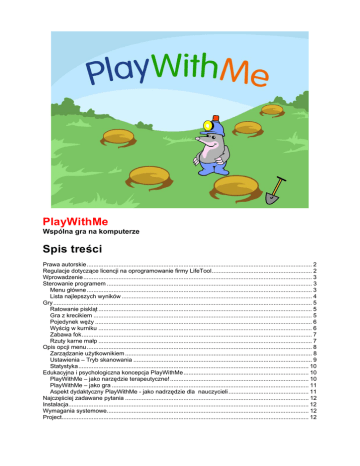 PlayWithMe Wspólna gra na komputerze Spis treści Prawa autorskie....................................................................................................................................... 2 Regulacje dotyczące licencji na oprogramowanie firmy LifeTool............................................................ 2 Wprowadzenie......................................................................................................................................... 3 Sterowanie programem ........................................................................................................................... 3 Menu główne ....................................................................................................................................... 3 Lista najlepszych wyników .................................................................................................................. 4 Gry ........................................................................................................................................................... 5 Ratowanie piskląt ................................................................................................................................ 5 Gra z krecikiem ................................................................................................................................... 5 Pojedynek węży .................................................................................................................................. 6 Wyścig w kurniku ................................................................................................................................ 6 Zabawa fok.......................................................................................................................................... 7 Rzuty karne małp ................................................................................................................................ 7 Opis opcji menu....................................................................................................................................... 8 Zarządzanie użytkownikiem ................................................................................................................ 8 Ustawienia – Tryb skanowania ........................................................................................................... 9 Statystyka.......................................................................................................................................... 10 Edukacyjna i psychologiczna koncepcja PlayWithMe........................................................................... 10 PlayWithMe – jako narzędzie terapeutyczne! ................................................................................... 10 PlayWithMe – jako gra ...................................................................................................................... 11 Aspekt dydaktyczny PlayWithMe - jako nadrzędzie dla nauczycieli ................................................ 11 Najczęściej zadawane pytania .............................................................................................................. 12 Instalacja................................................................................................................................................ 12 Wymagania systemowe......................................................................................................................... 12 Project.................................................................................................................................................... 12 Drogi kliencie Dziękujemy za zakup oprogramowania firmy LifeTool, aby ułatwić pracę z nim dostarczamy ten podręcznik. Zawiera on ważne informacje oraz wskazówki pomocne w użytkowaniu programu. W przypadku dodatkowych pytań proszę skontaktować się ze sprzedawcą. Mamy nadzieję, że praca z PlayWithMe będzie przyjemnością. Prawa autorskie Oprogramowanie LifeTool wyposażone jest w zabezpieczenie przed kopiowaniem, dlatego może być używane tylko zgodnie z warunkami licencji, która jest prawną umową wiążącą. Bez ograniczenia praw autorskich, żadnej części oprogramowania i dokumentów z nim związanych nie wolno powielać, pożyczać ani przekazywać w żadnej formie, za pomocą jakichkolwiek nośników ( elektronicznych, mechanicznych) w jakimkolwiek celu, za wyjątkiem przypadków, w których uzyskano na to pisemną zgodę firmy LifeTool. Microsoft jest zastrzeżonym znakiem towarowym, MS-Windows jest znakiem towarowym Microsoft Corporation. Wszelkie inne znaki towarowe są własnością ich prawowitych właścicieli pojawiają się w tym podręczniku bez intencji naruszenia praw związanych ze znakami firmowymi Regulacje dotyczące licencji na oprogramowanie firmy LifeTool Licencja jednostanowiskowa Zakup pojedynczej licencji umożliwia zainstalowanie programu na jednym komputerze. Po zainstalowaniu będzie on działał tylko z oryginalną płytą CD włożoną do stacji dysków. Prawo autorskie zabrania między innymi kopiowania programu. Możliwa jest instalacja i użytkowanie programu na wielu komputerach pod warunkiem, że w stacji dysków znajduje się oryginalna płyta CD. W takim przypadku równoległa praca z programem na wielu komputerach nie jest możliwa. Licencja wielostanowiskowa. Zakup licencji wielostanowiskowej umożliwia instalację oraz użytkowanie oprogramowania na wielu komputerach. W przypadku pojedynczego zamówienia nabyć można tylko jedną licencję wielostanowiskową programu. W przypadku licencji wielostanowiskowej dla określonego zamówienia dostarczany jest kod licencyjny. Przy pomocy tego kodu wszystkie elementy programu mogą być zainstalowane na poszczególnych komputerach. W przypadku takiego używania PlayWithMe (na wielu komputerach) oryginalna płyta CD nie musi być włożona do stacji dysk